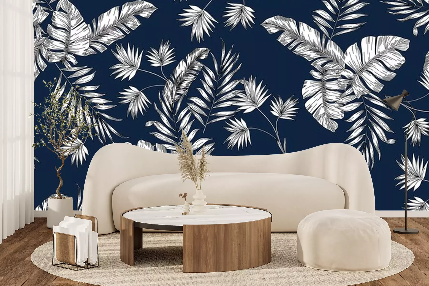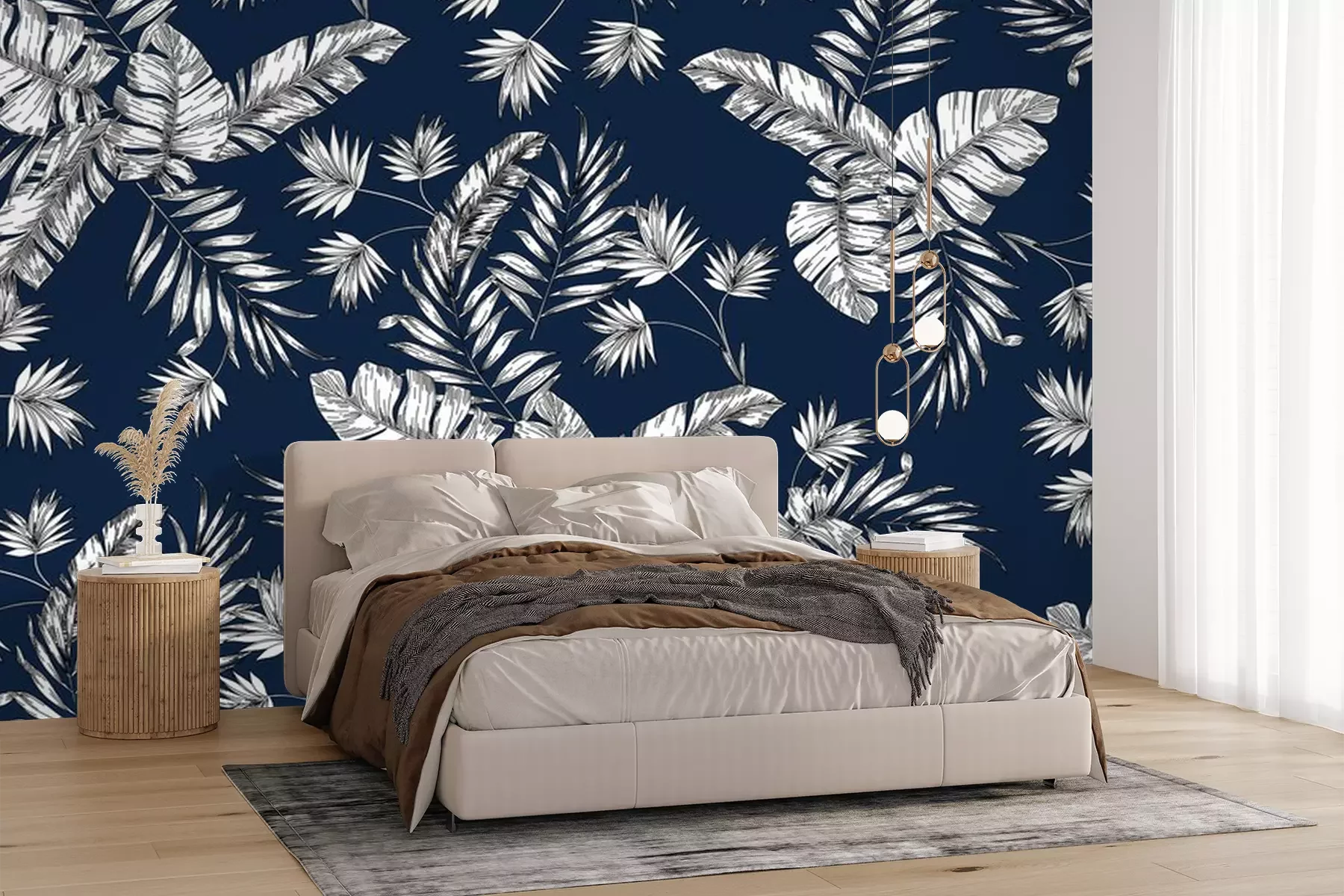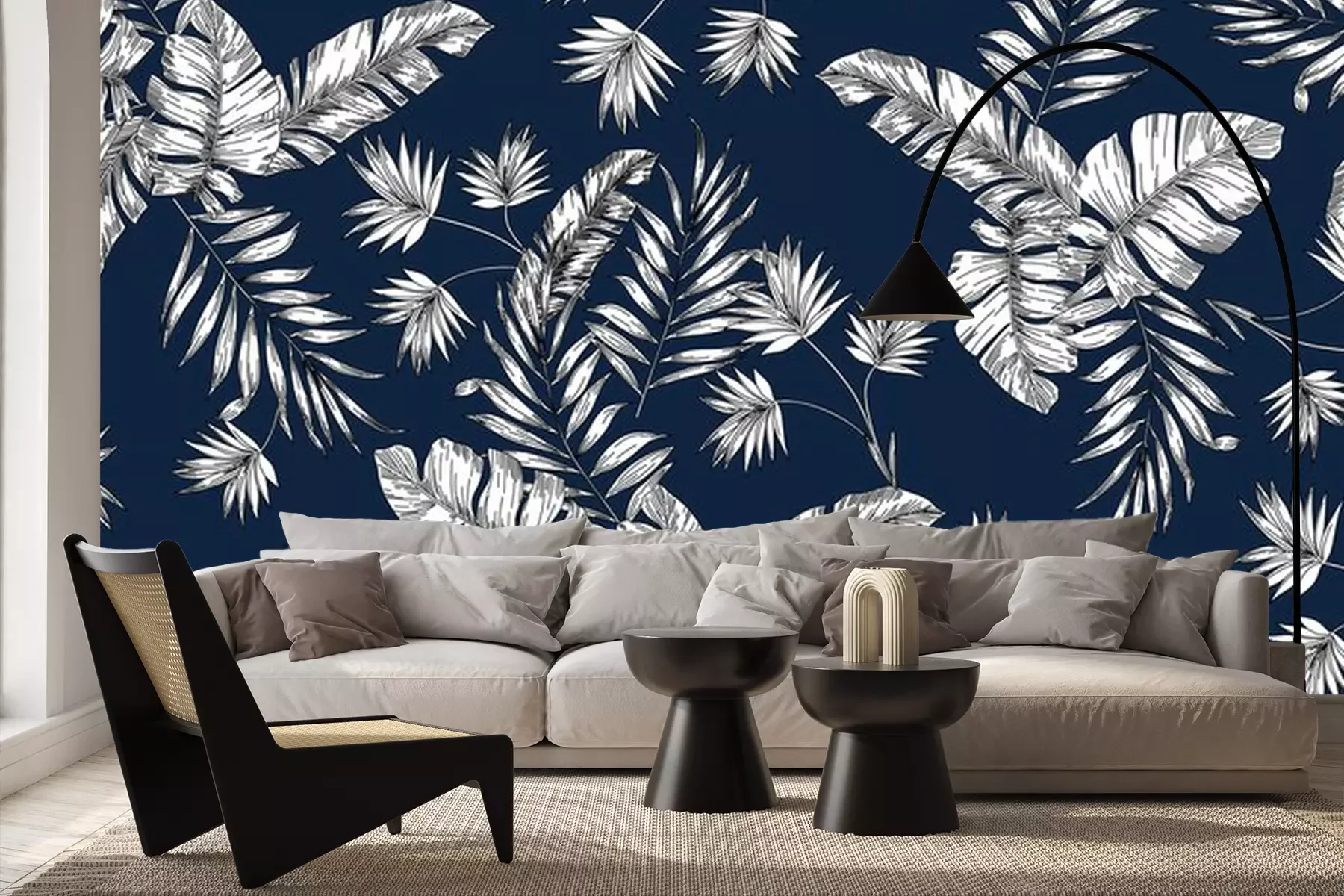 Papier peint  Fond bleu foncé pour les feuilles exotiques