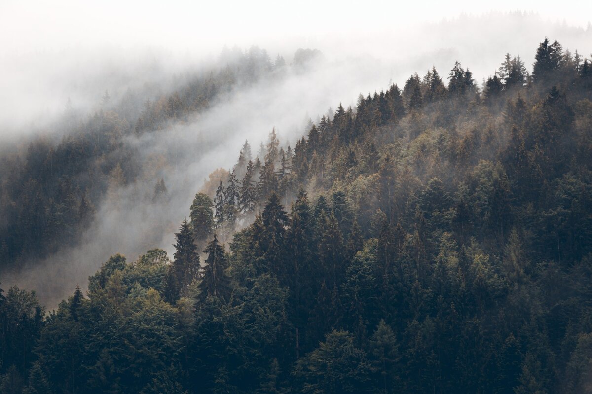 Forêt de conifères vert foncé sur les collines dans le brouillard