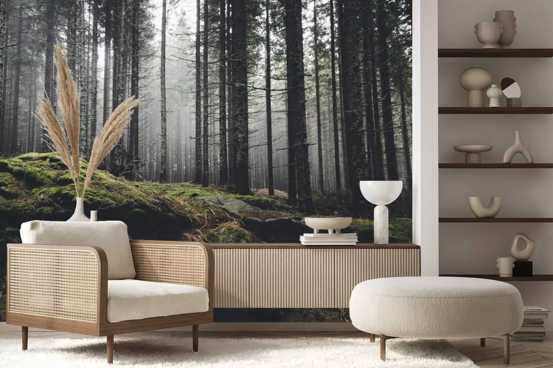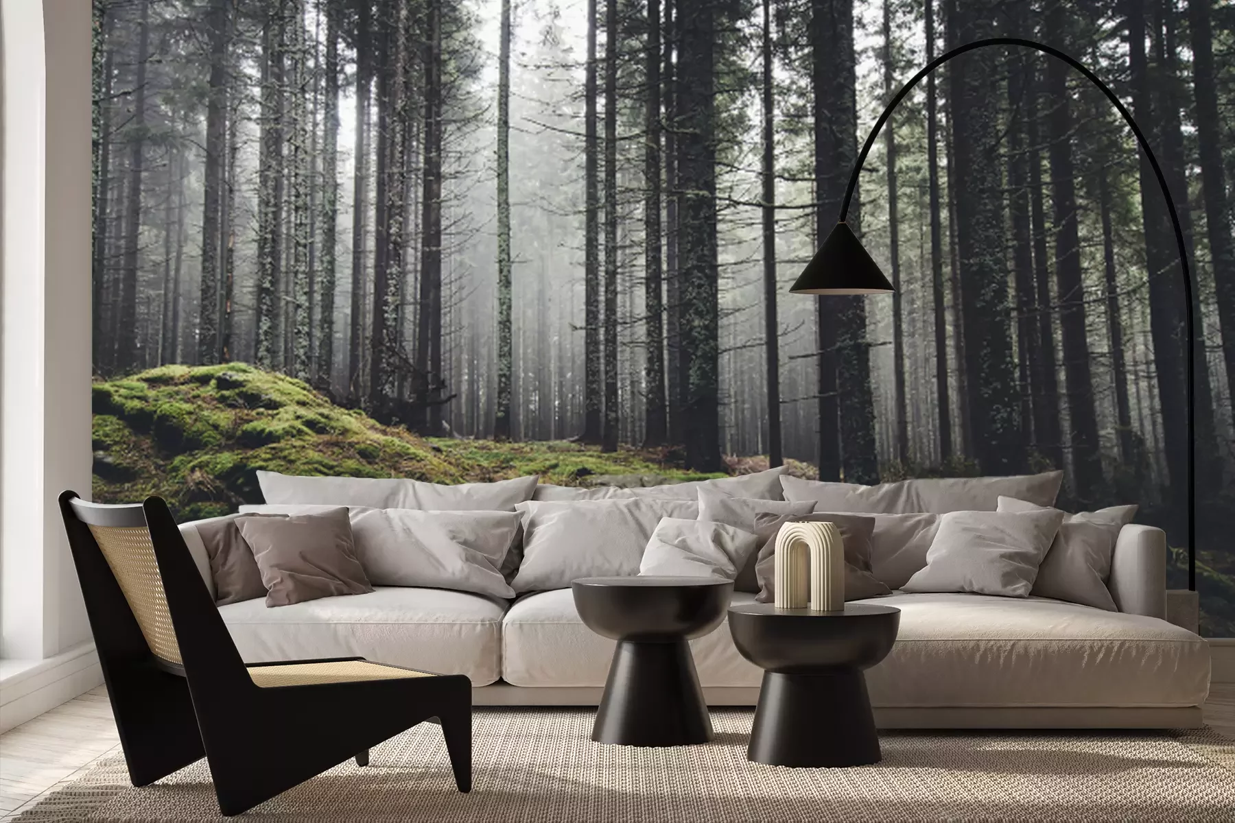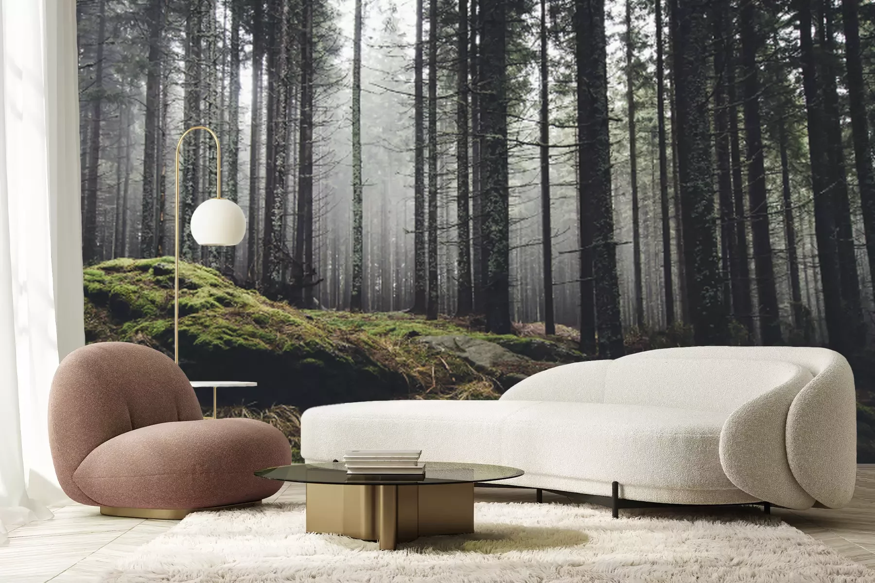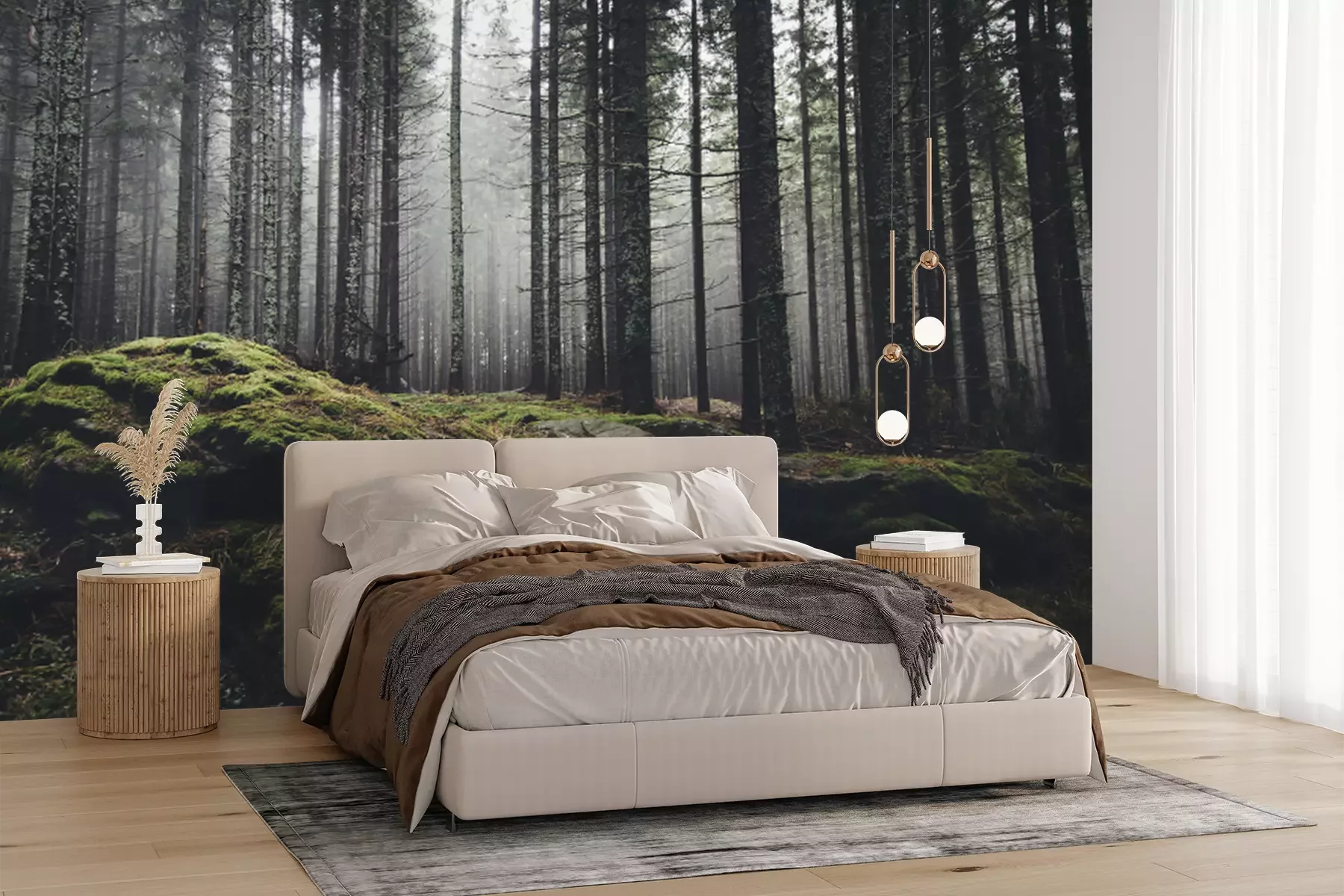 Papier peint  Forêt sauvage de paysage avec des arbres de pin et de mousse sur les rochers