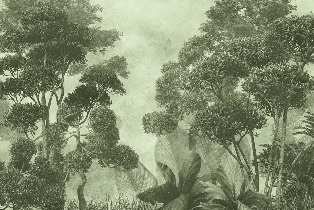 Papier peint : Forêt tropicale brumeuse en vert, paysage naturel exotique