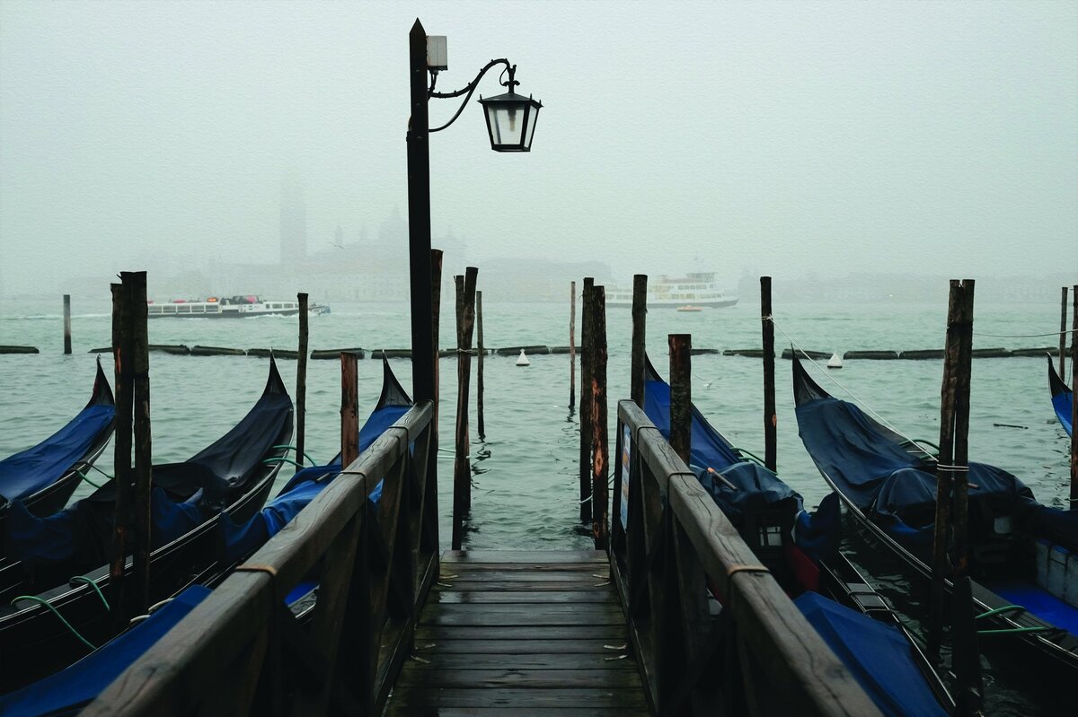 Gondoles de venise enveloppées d'un épais brouillard