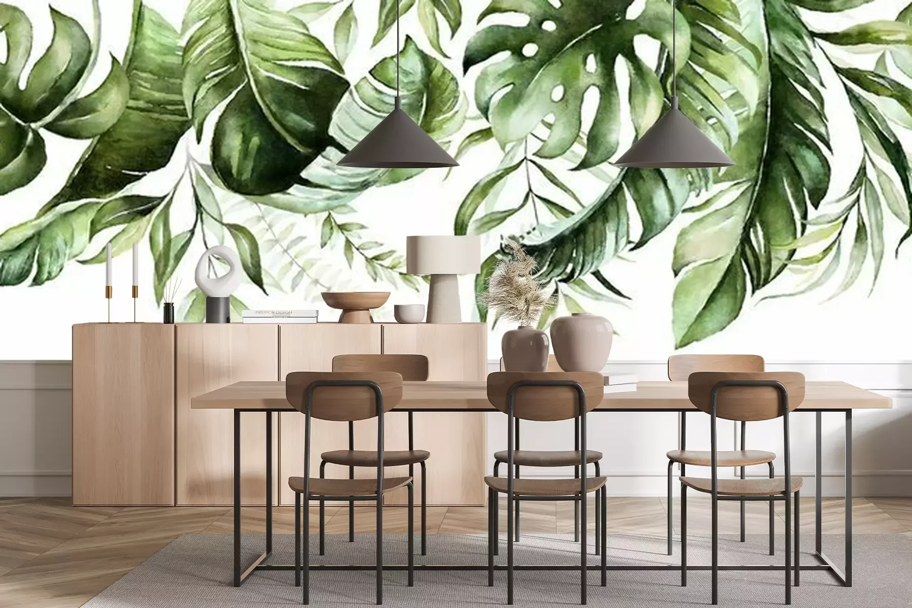 Papier peint  Green tropical leaves on white background. Watercolor hand painted seamless border. Floral tropic illustration. Jungle foliage pattern.