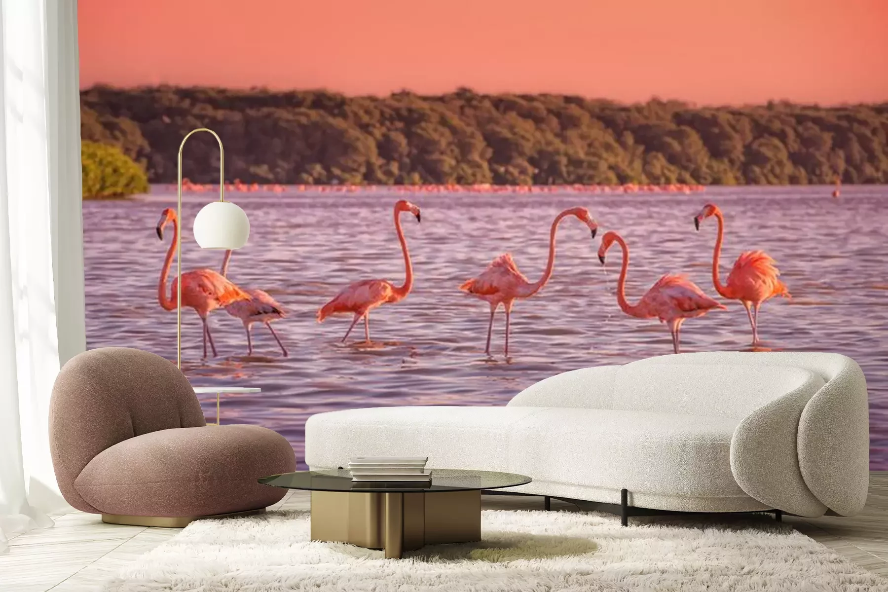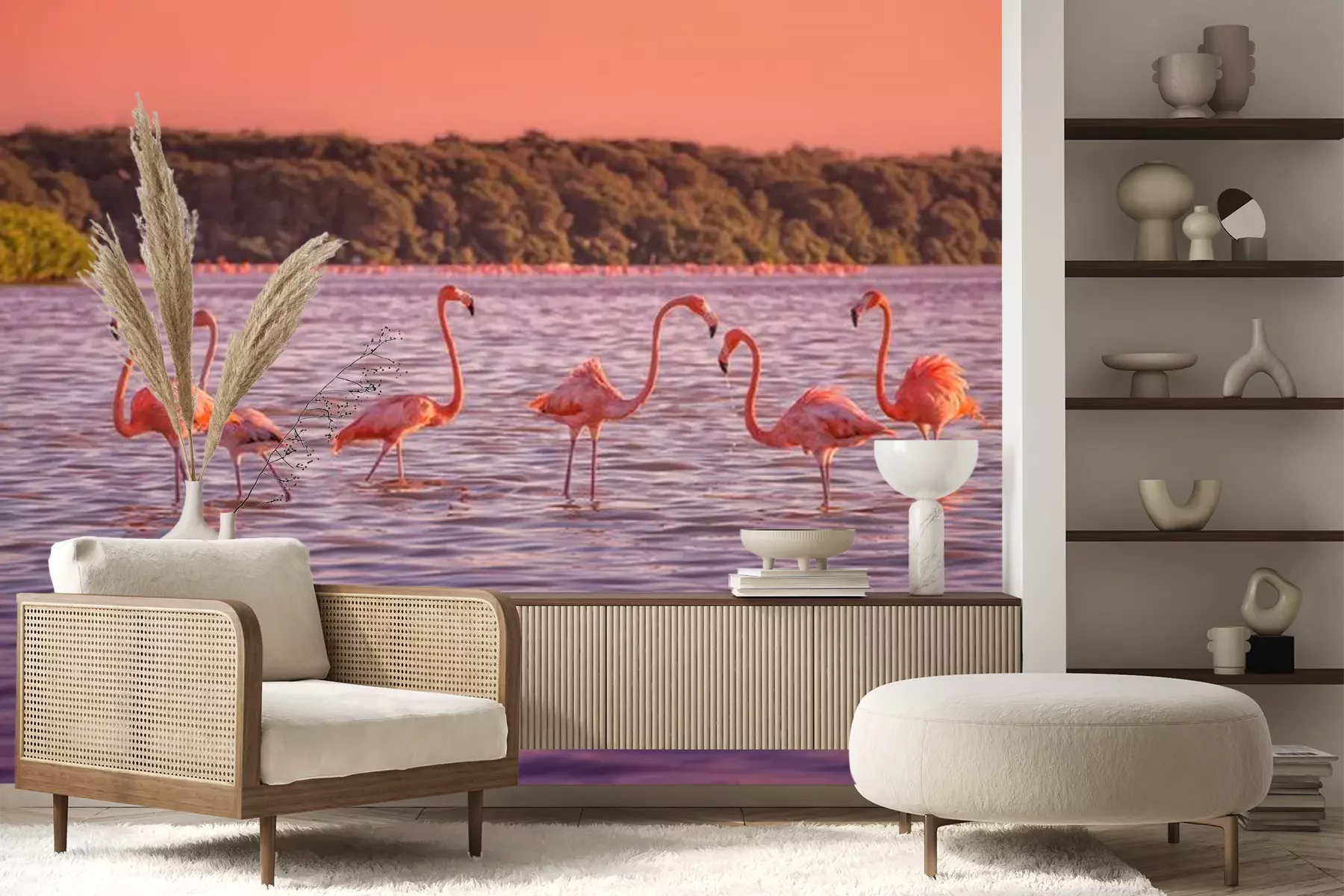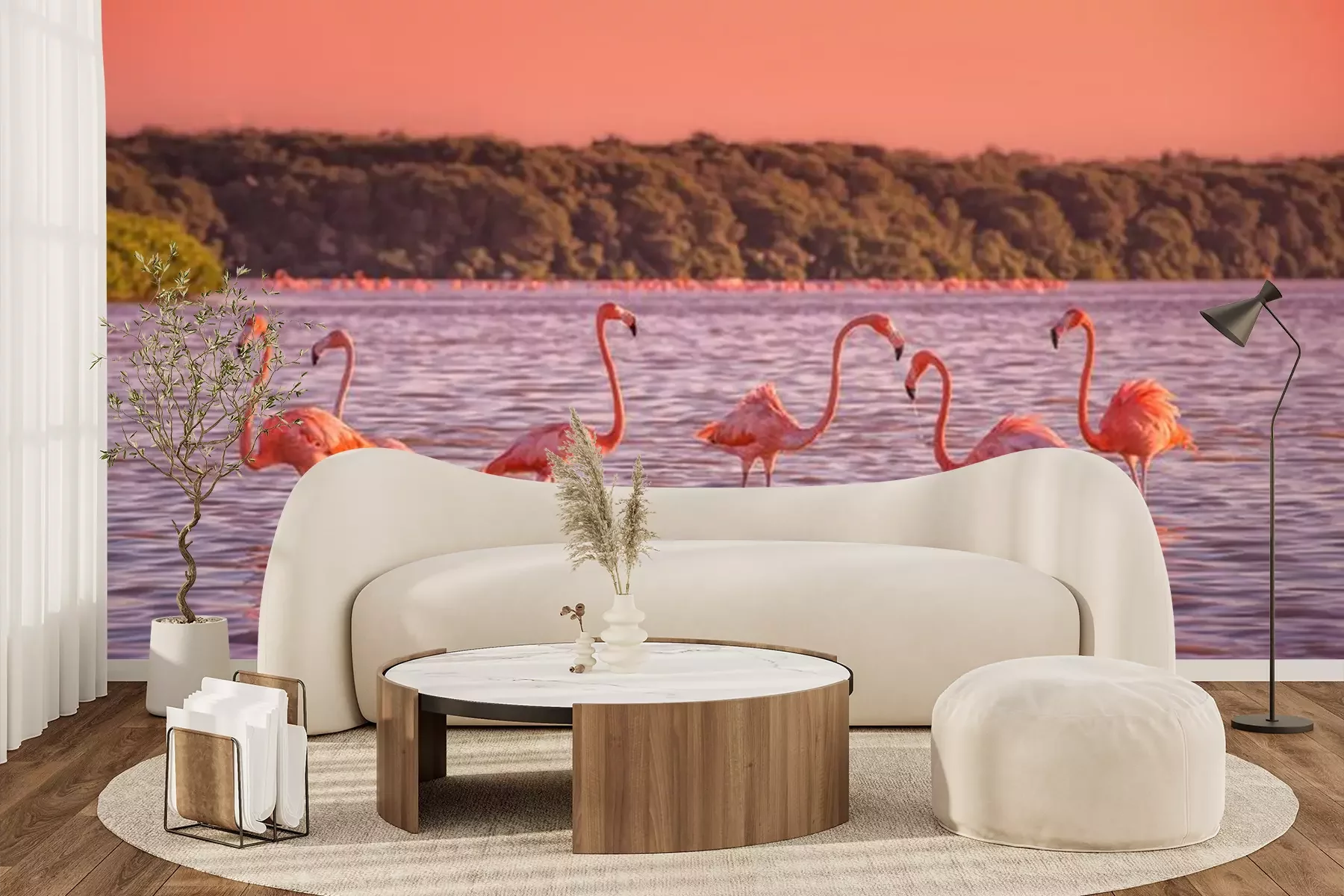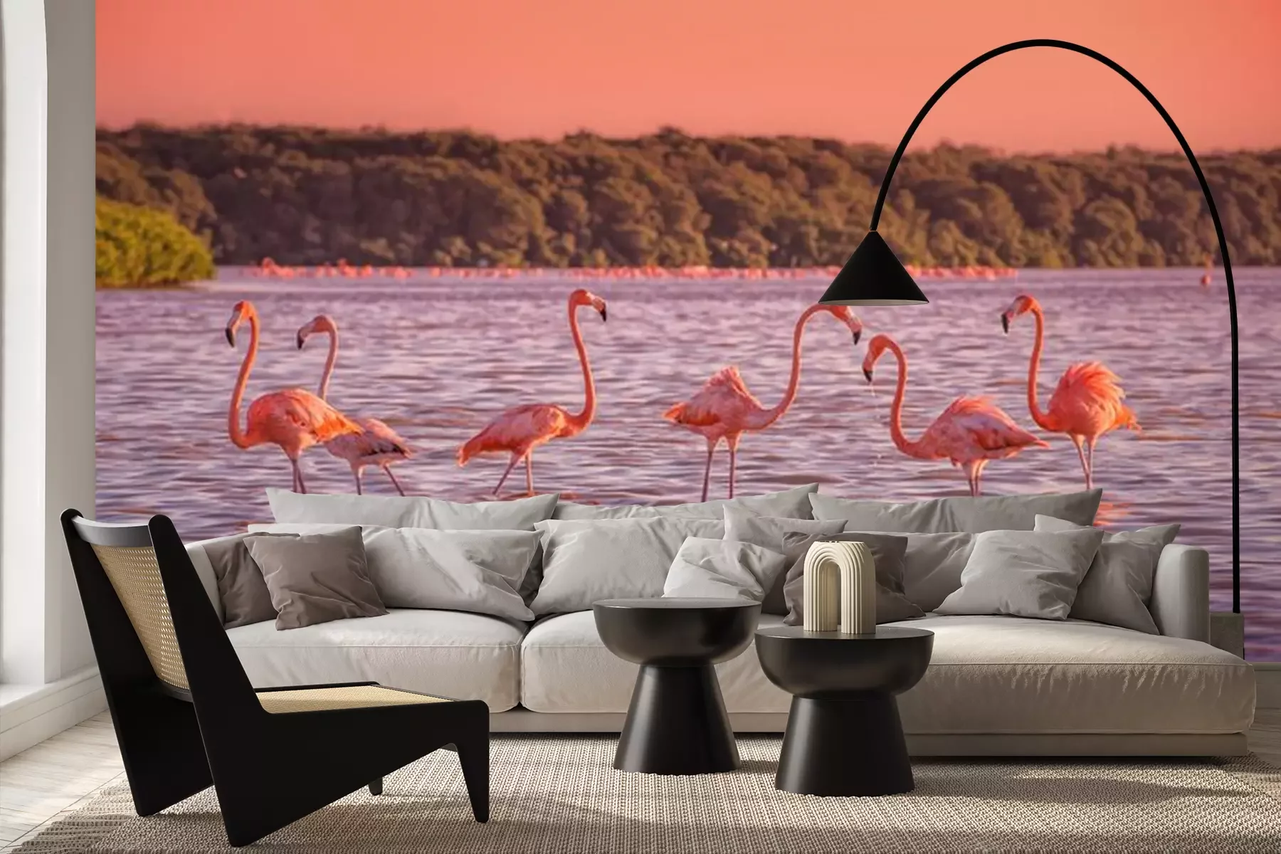 Papier peint  Groupe de Flamant roses pataugeant dans l'eau