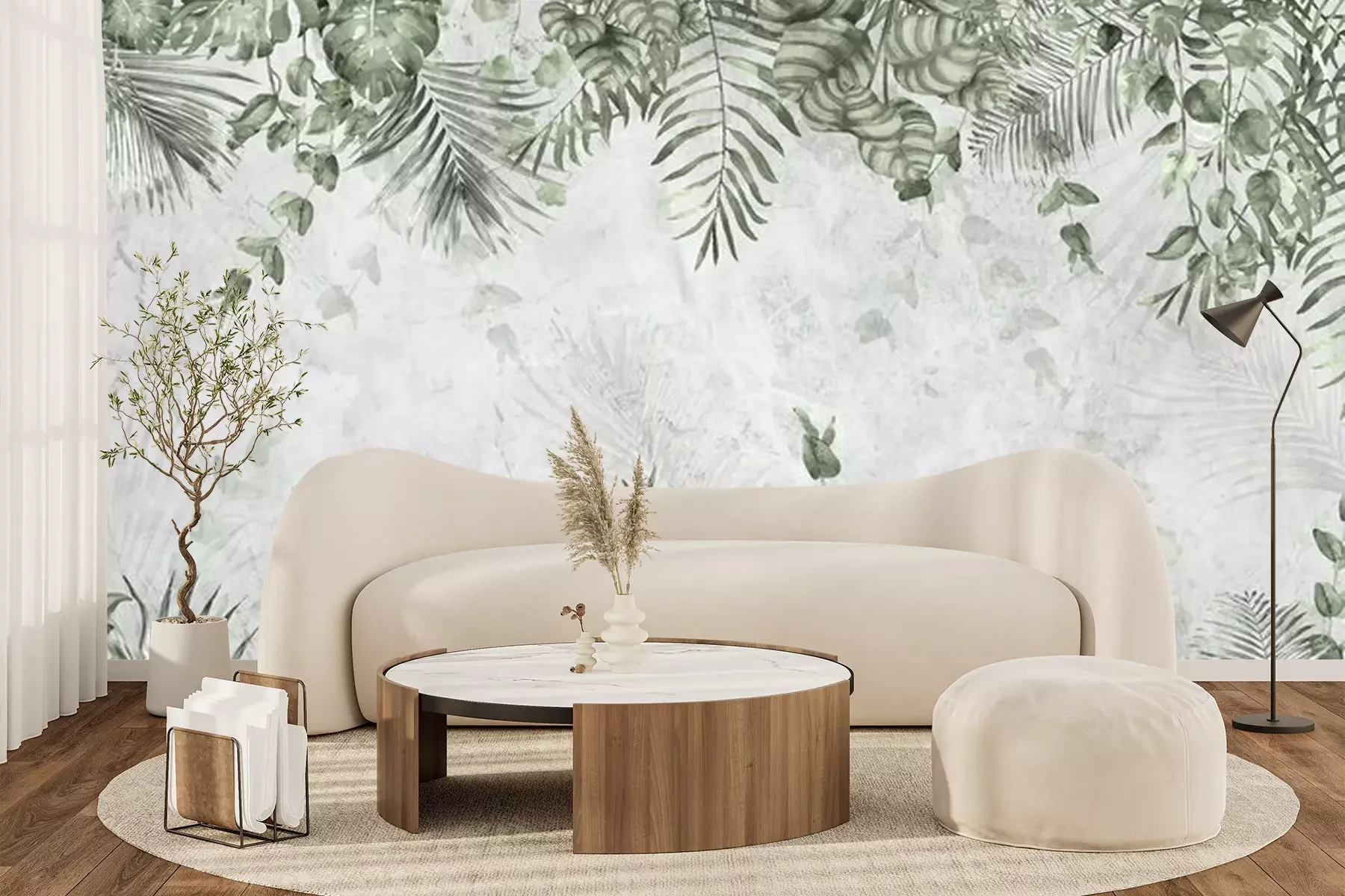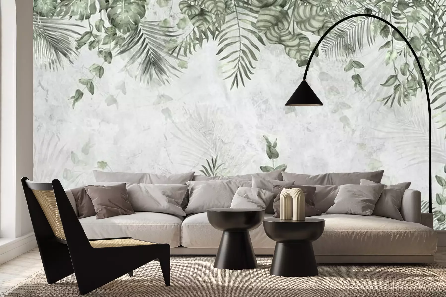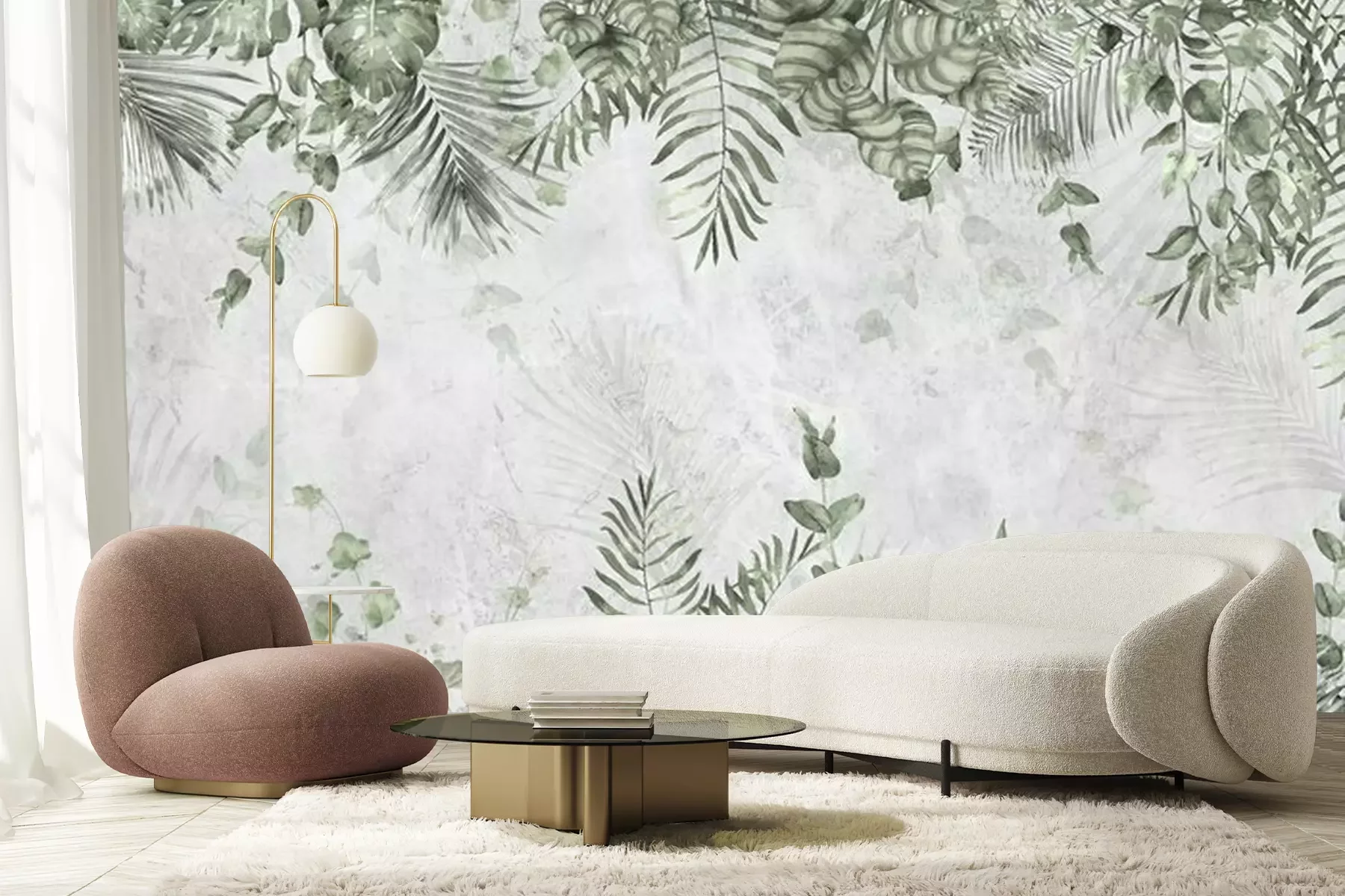Feuilles tropicales sur béton, motif monochromeLivraison sans problème assurée par des transporteurs de confiance