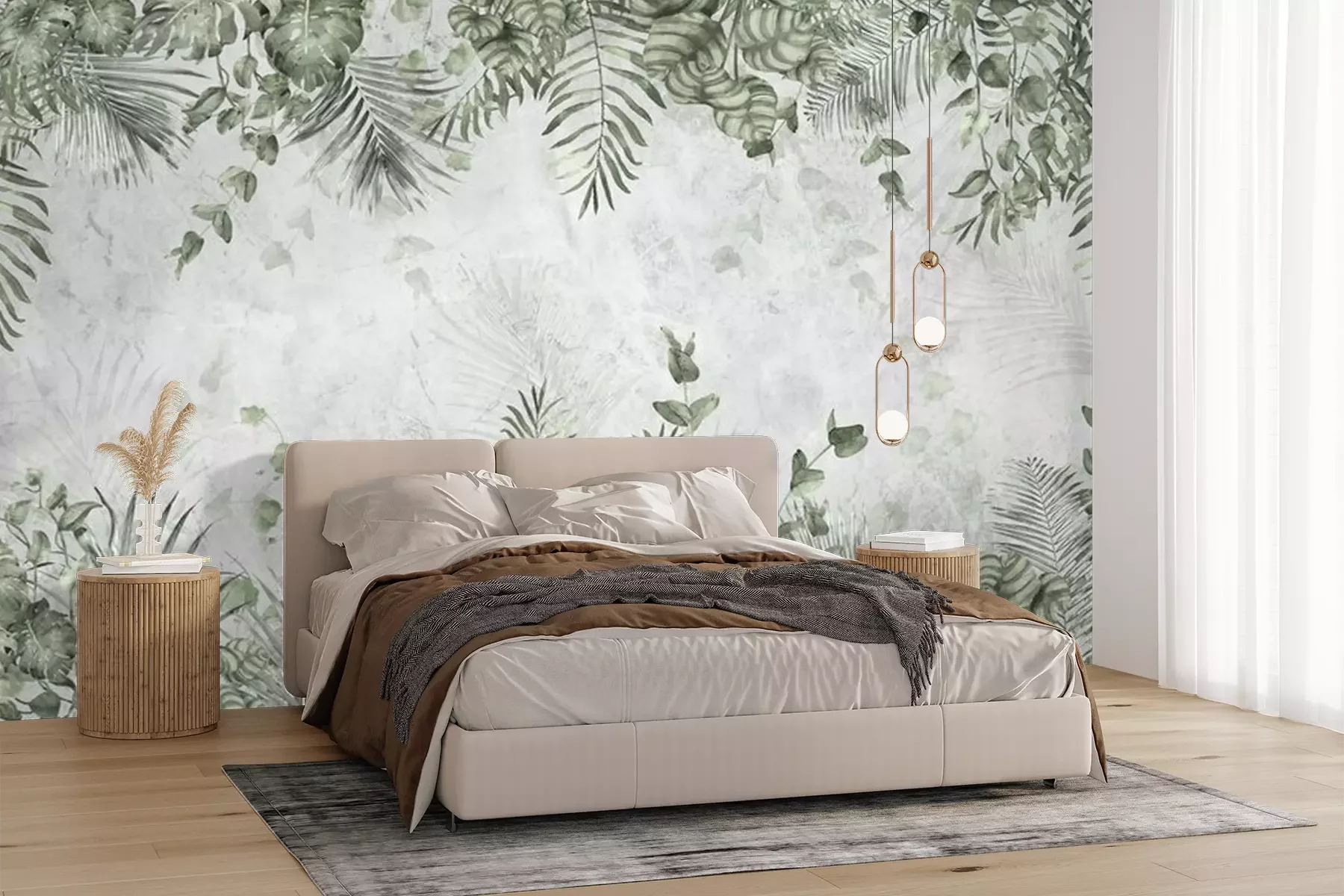 Arbres et feuilles tropicaux dans une forêt brumeusePapier peint