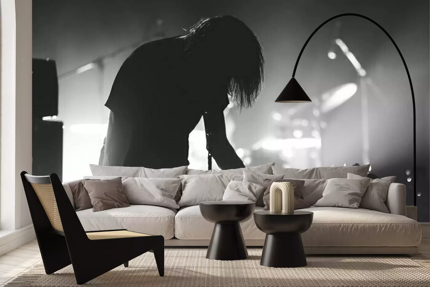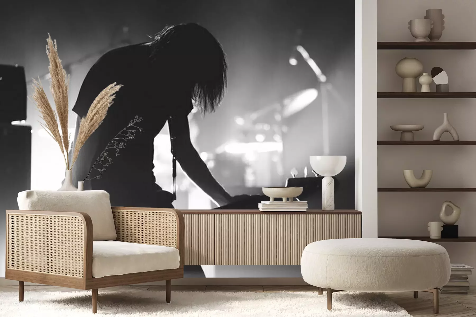 Photo en noir et blanc avec un guitariste