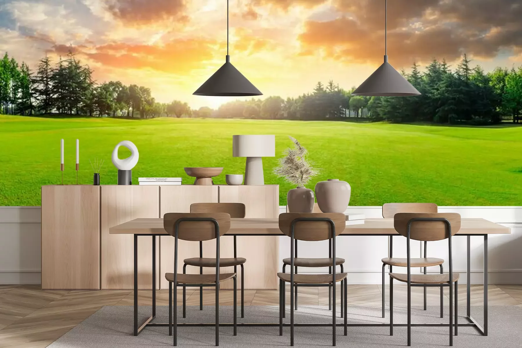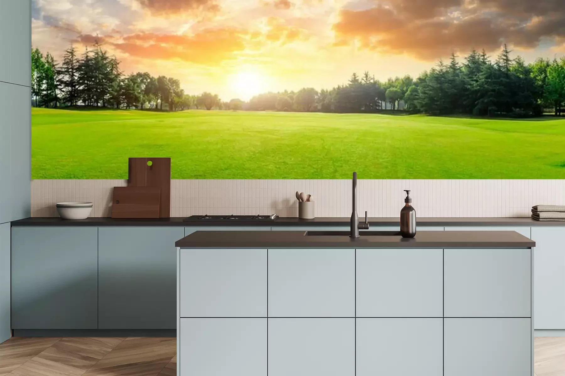Papier peint  Herbe avec nuages et coucher de soleil