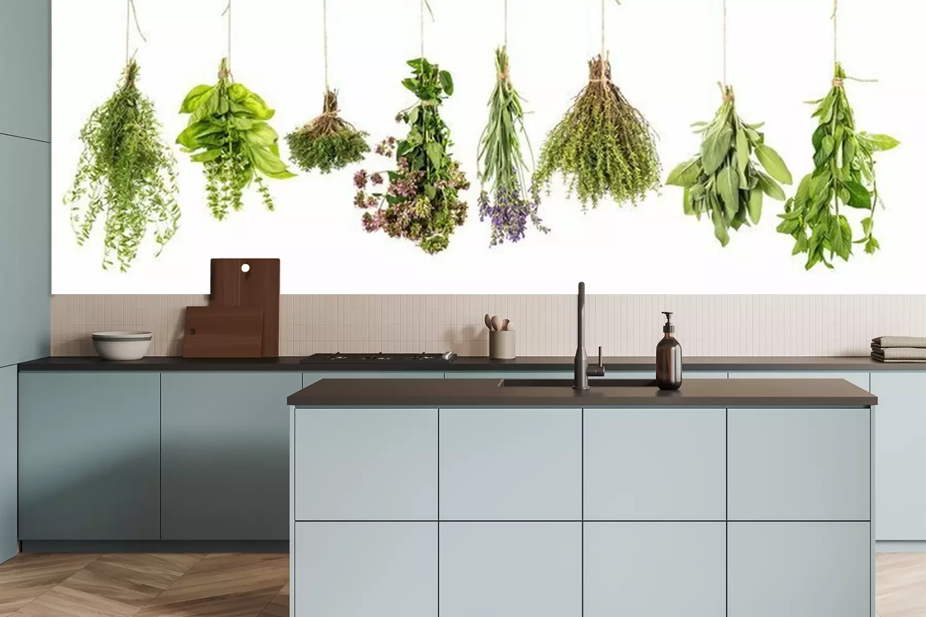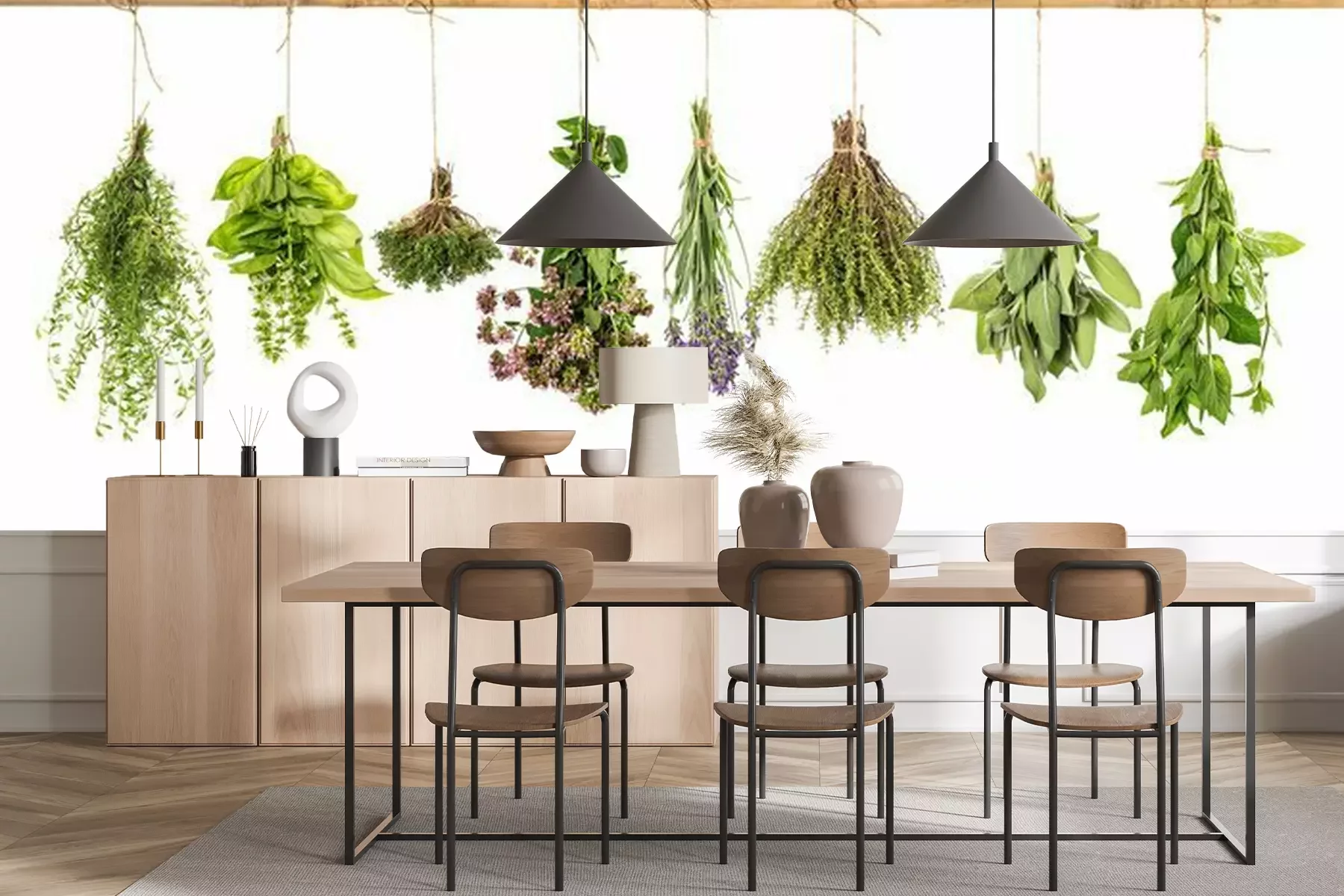 Herbes aromatiques suspendues à une poutre en boisPapier peint