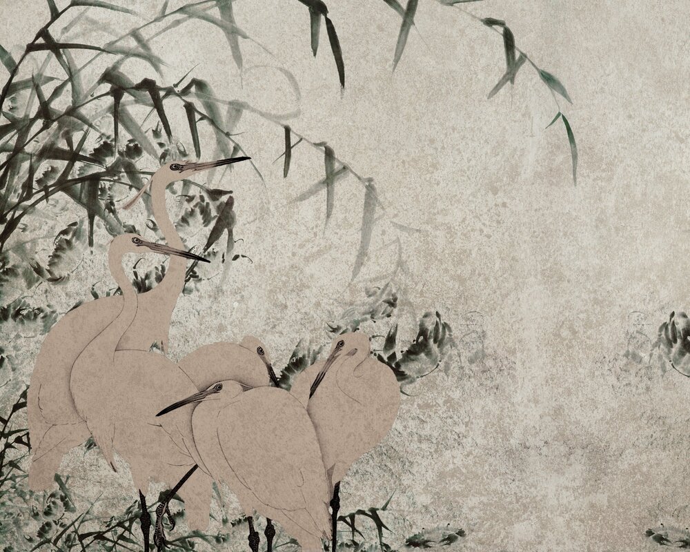 Papier peint : Hérons et branches de bambou vertes