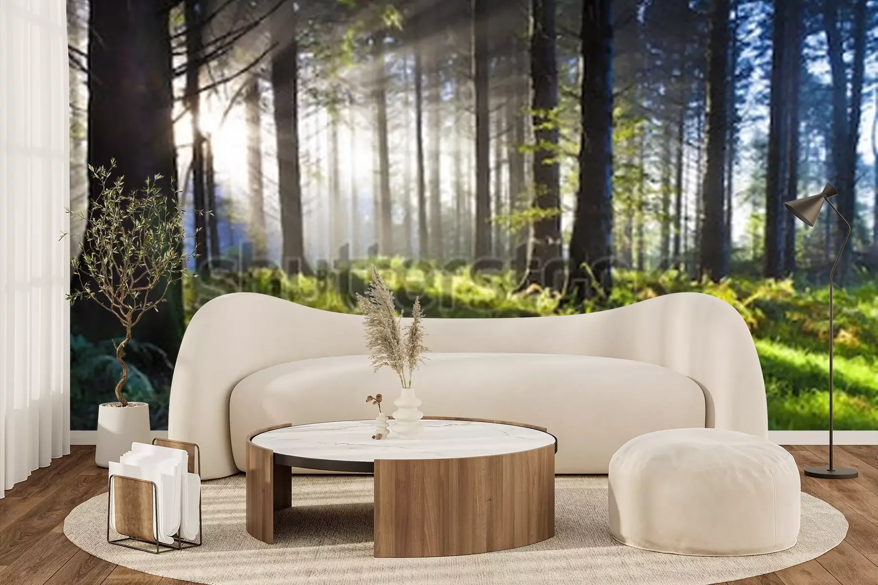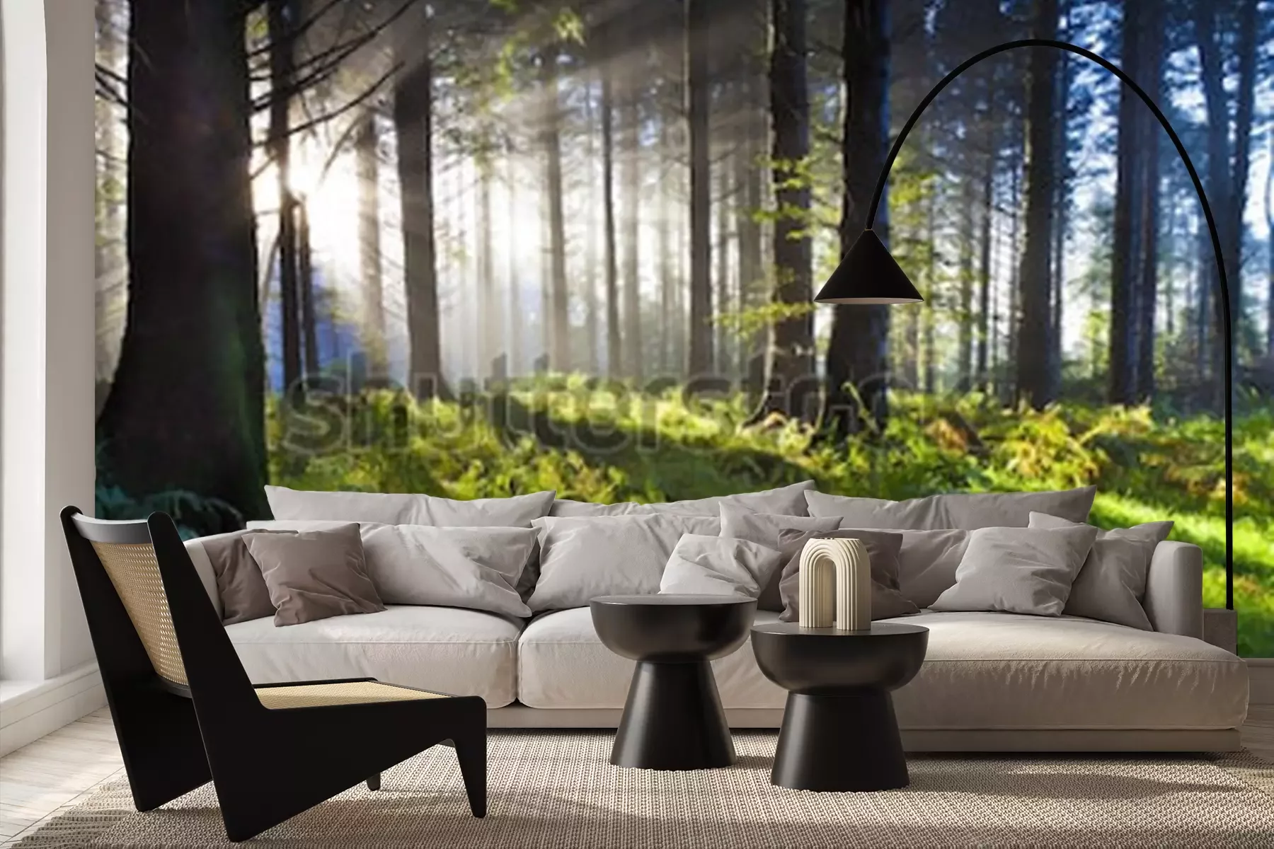 Papier peint  L'aube dans la forêt illuminée par les rayons du soleil