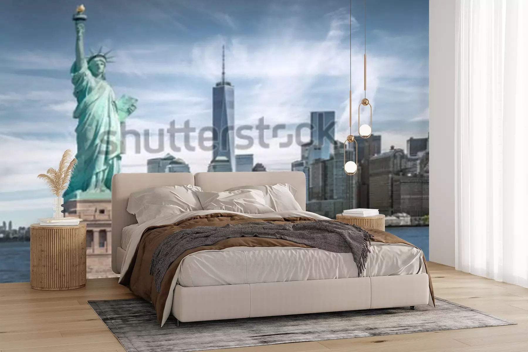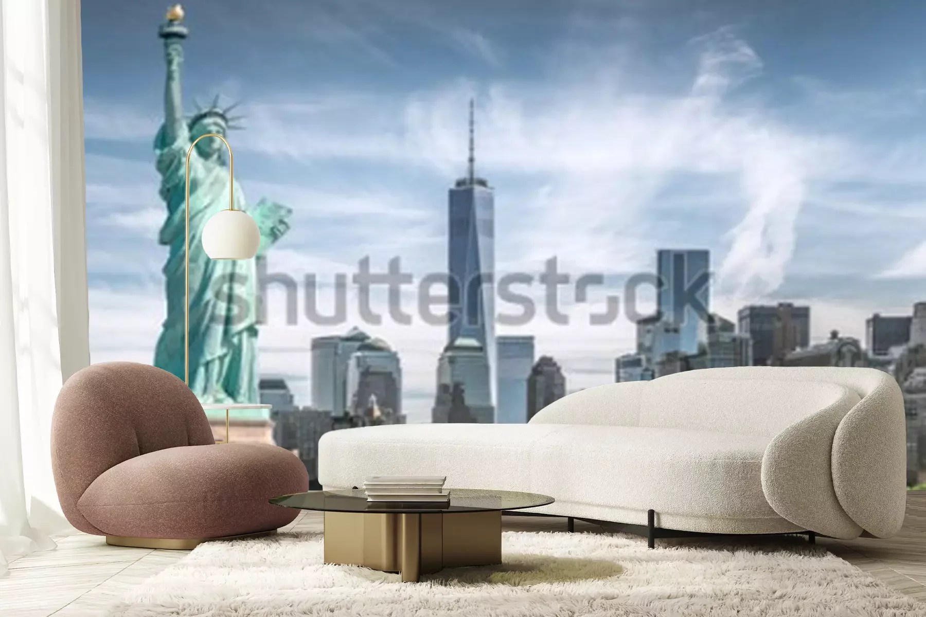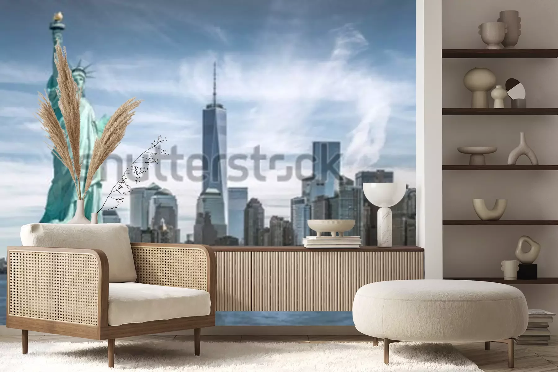 Papier peint  La statue de la liberté avec fond du World Trade Center, points de repère de la ville de New York