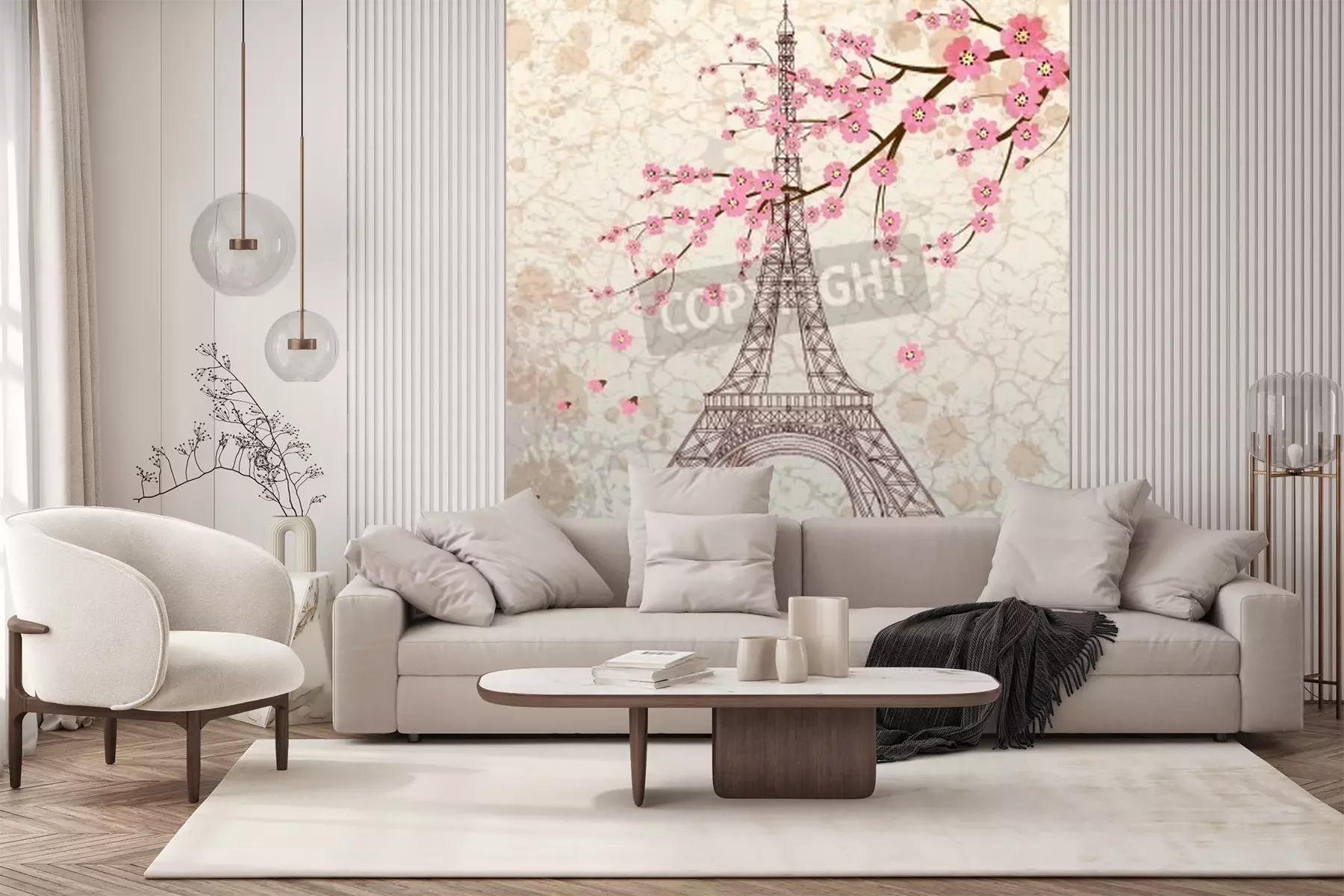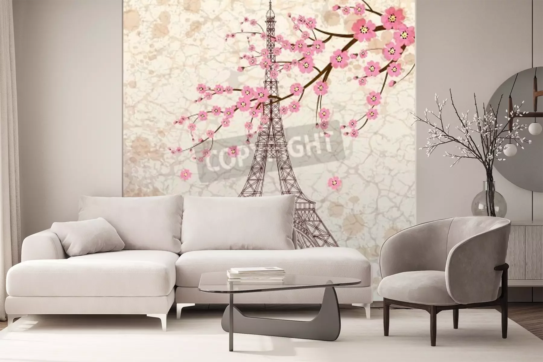 Papier peint  La tour Eiffel et des fleurs de cerisier