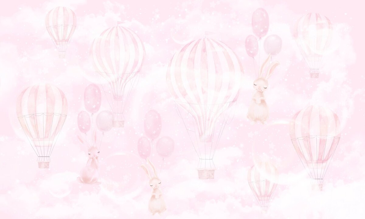 Papier peint : Lapins avec des ballons sur un ciel rose en aquarelle