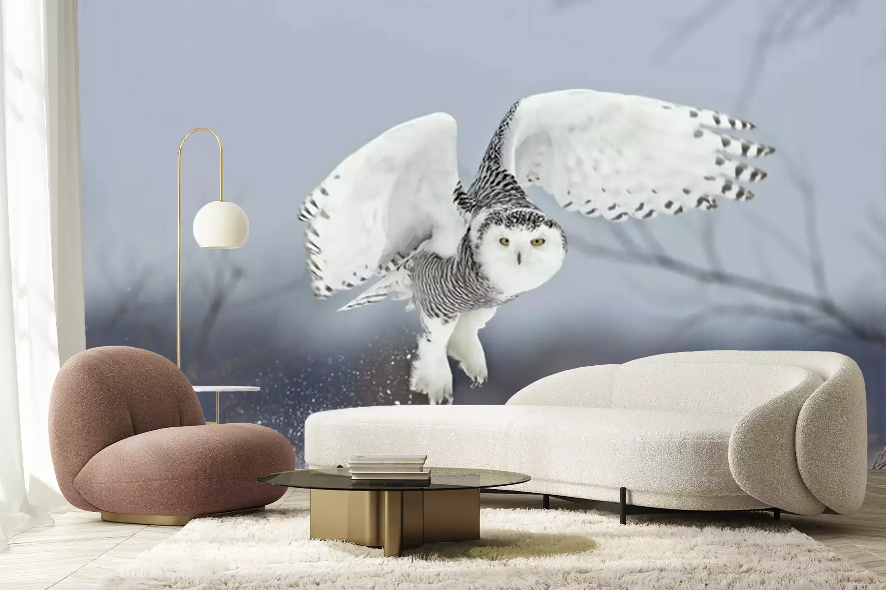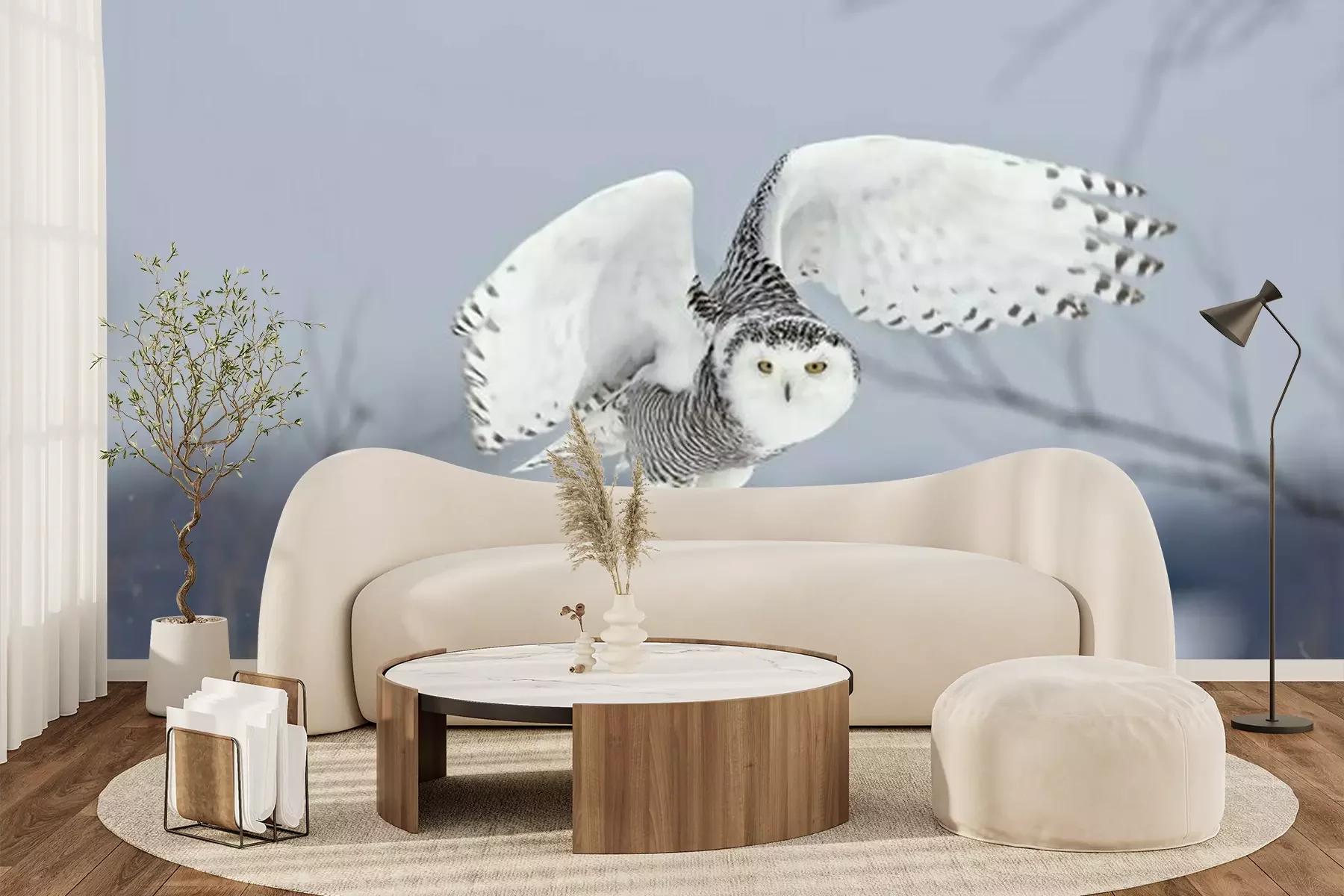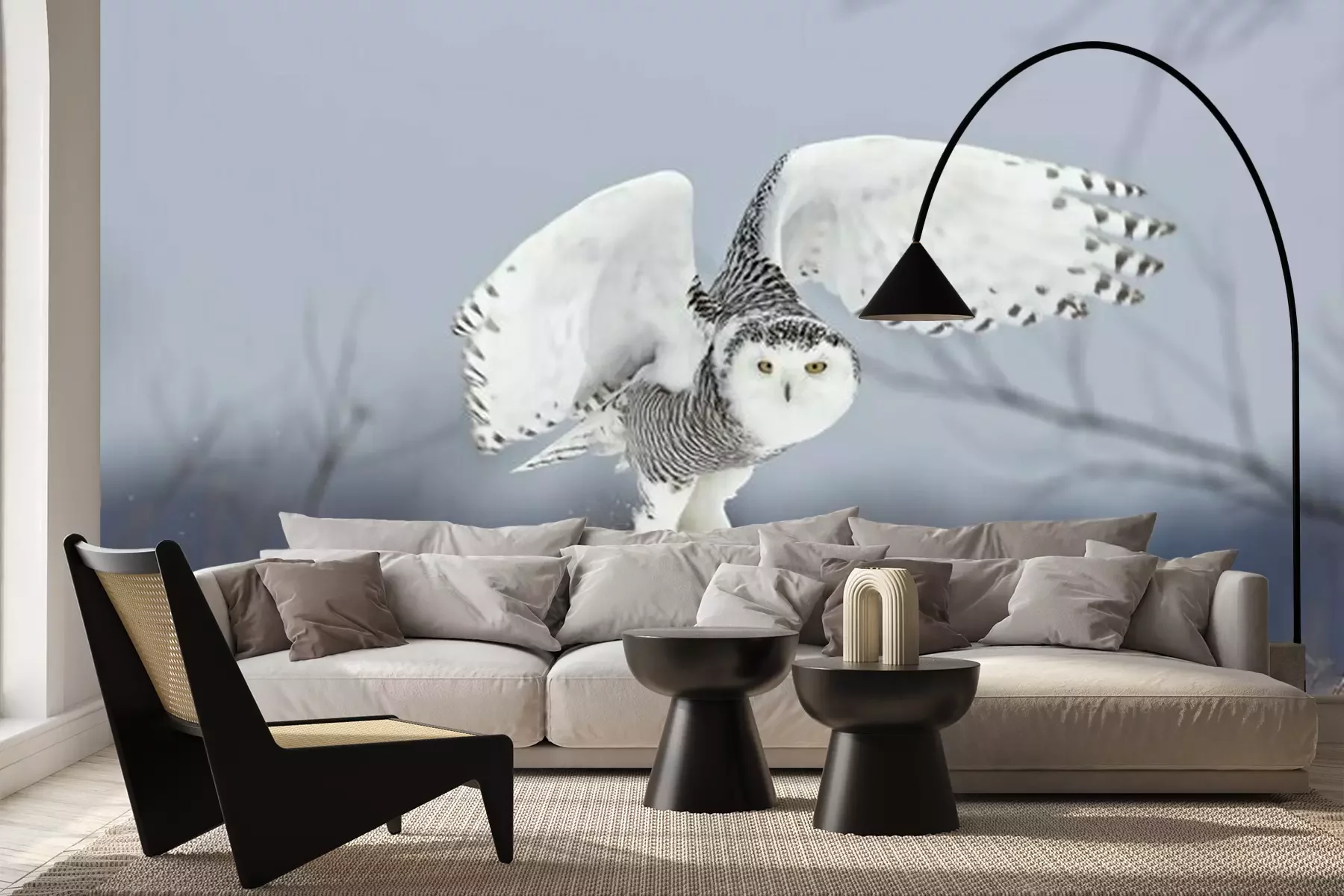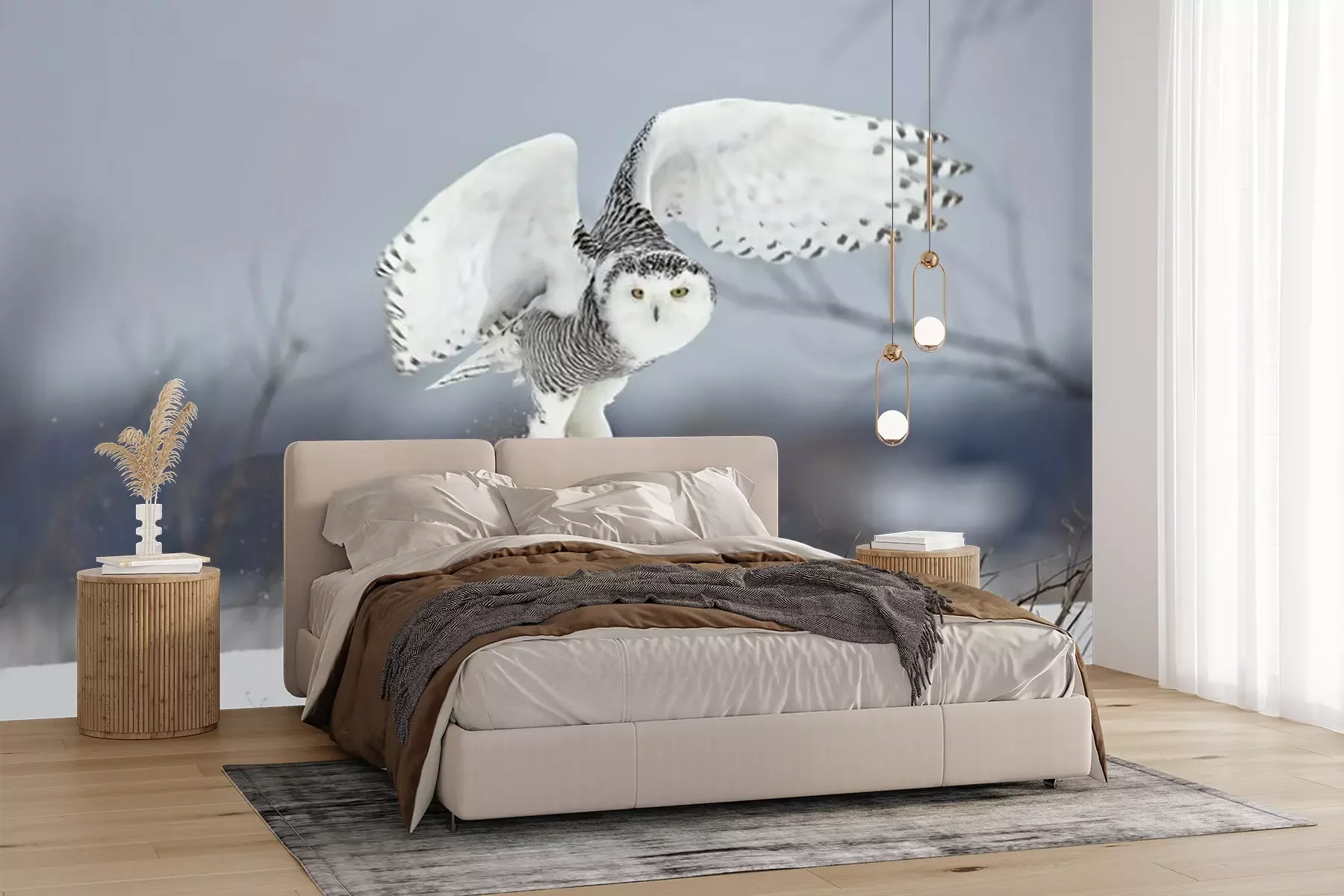 Papier peint  Le harfang des neiges (Bubo scandiacus) se lève pour chasser sur un champ recouvert de neige au Canada