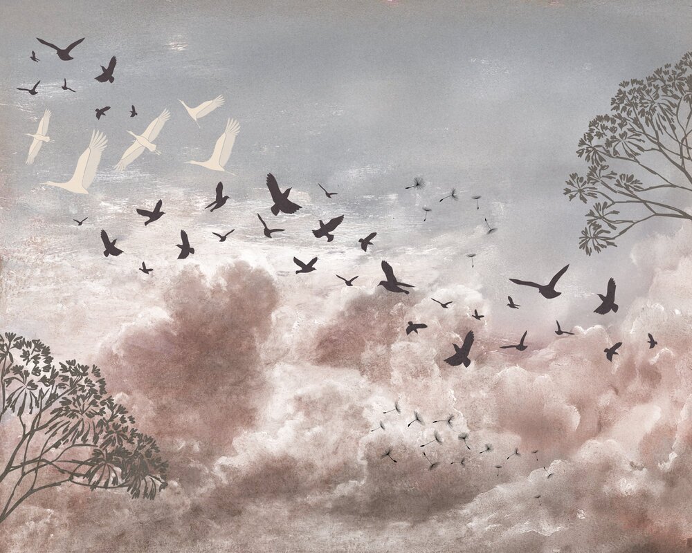 Papier peint : Légers pissenlits et oiseaux sur un fond de ciel pastel