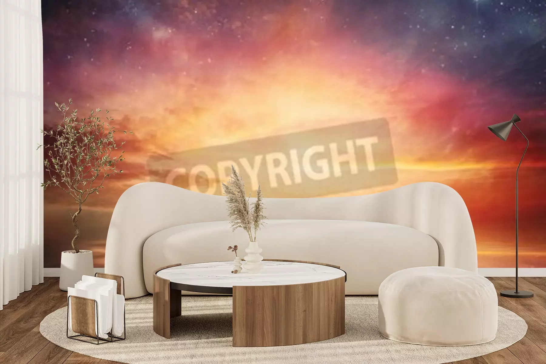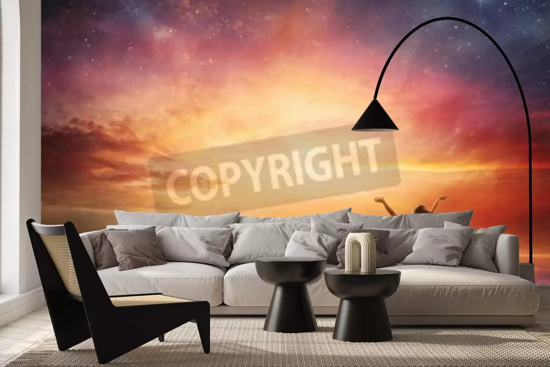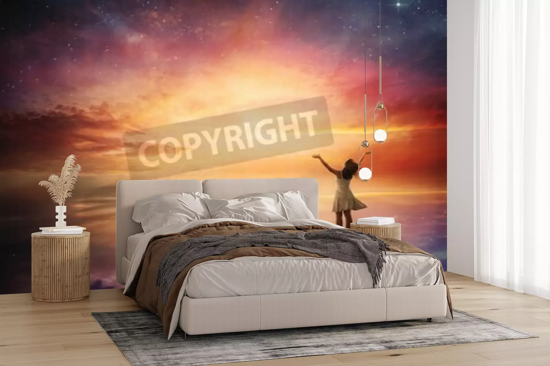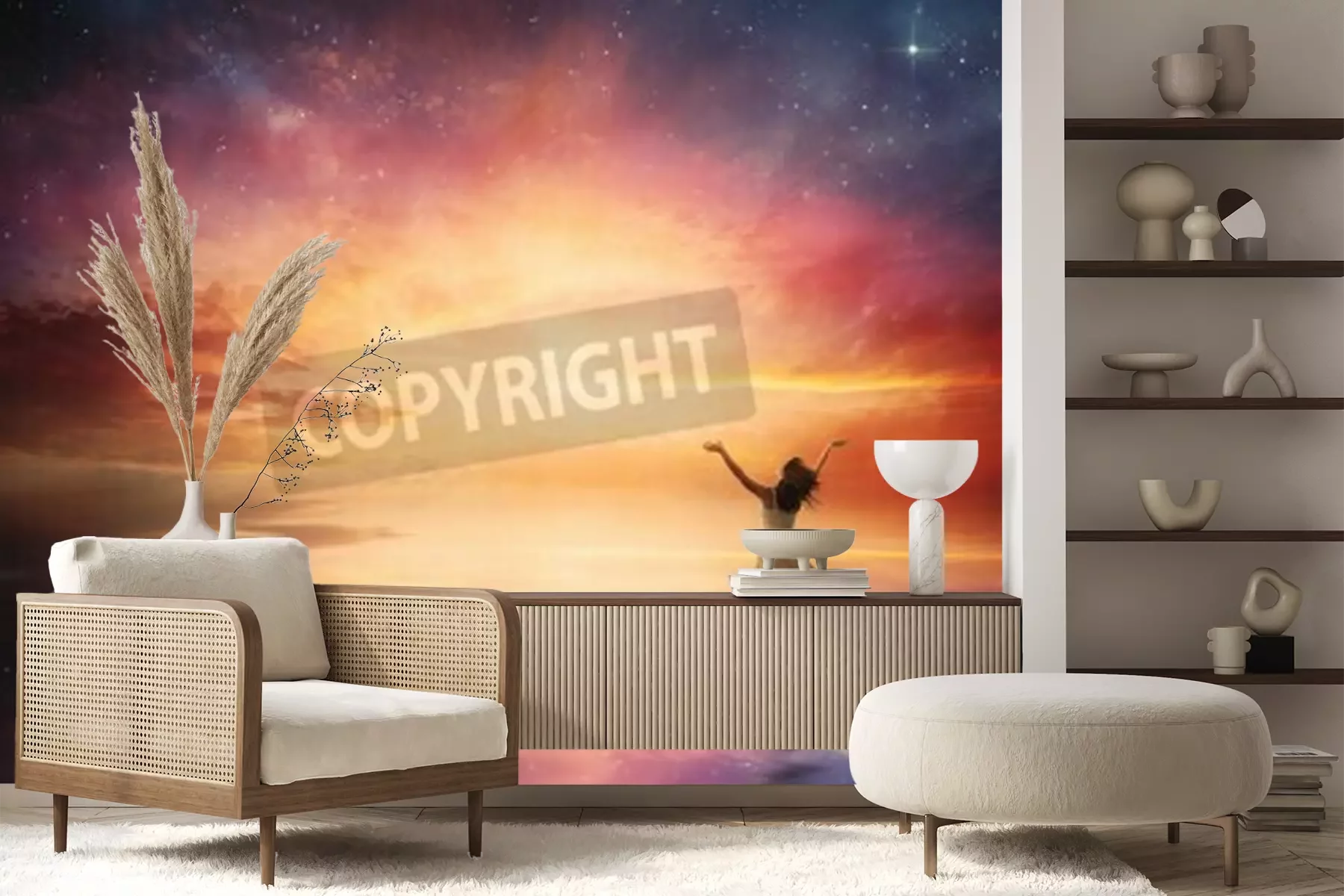 Papier peint  Lever de soleil avec des étoiles et une femme