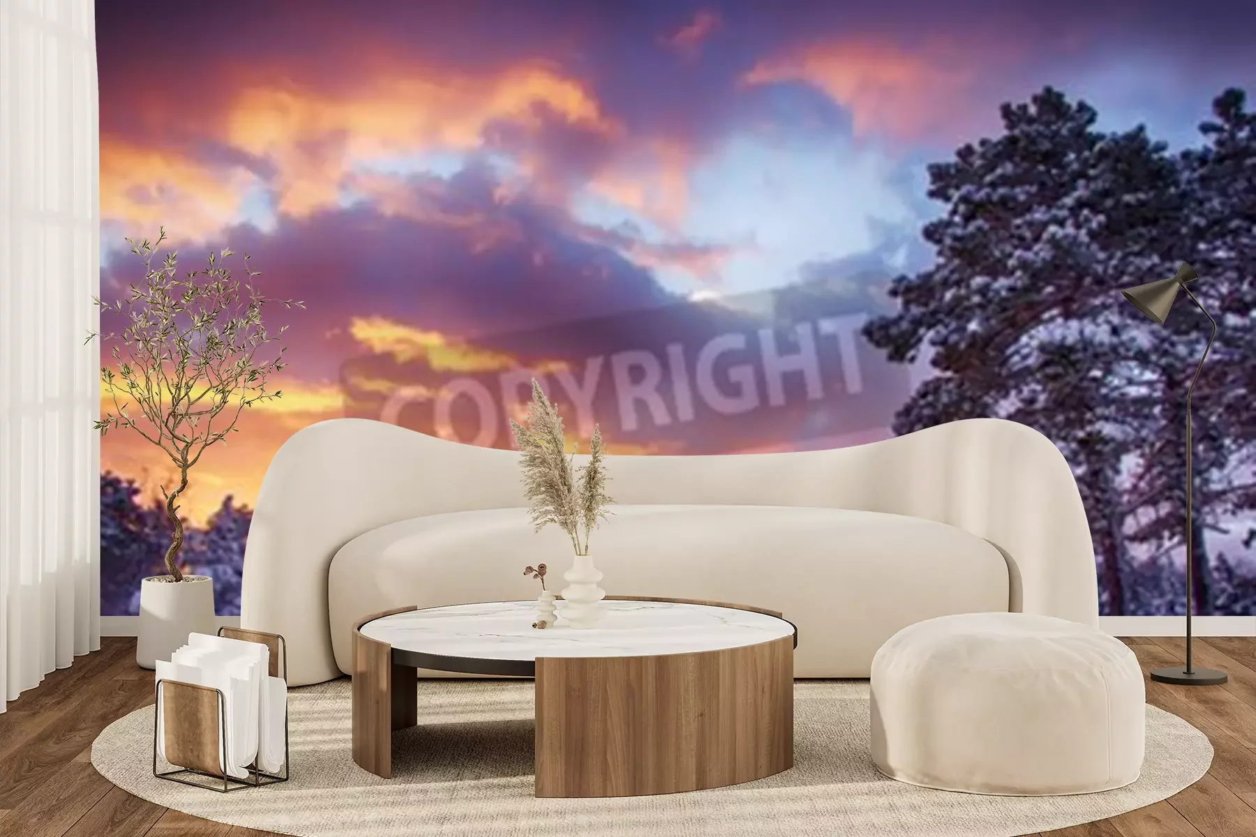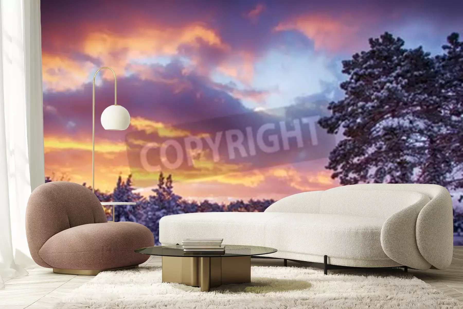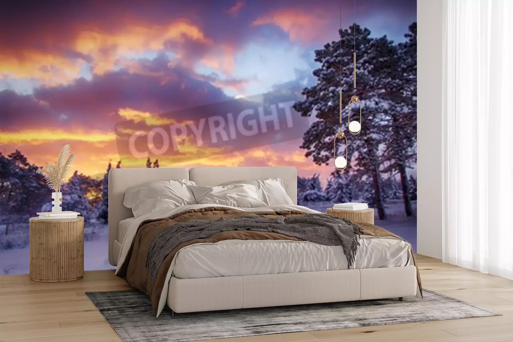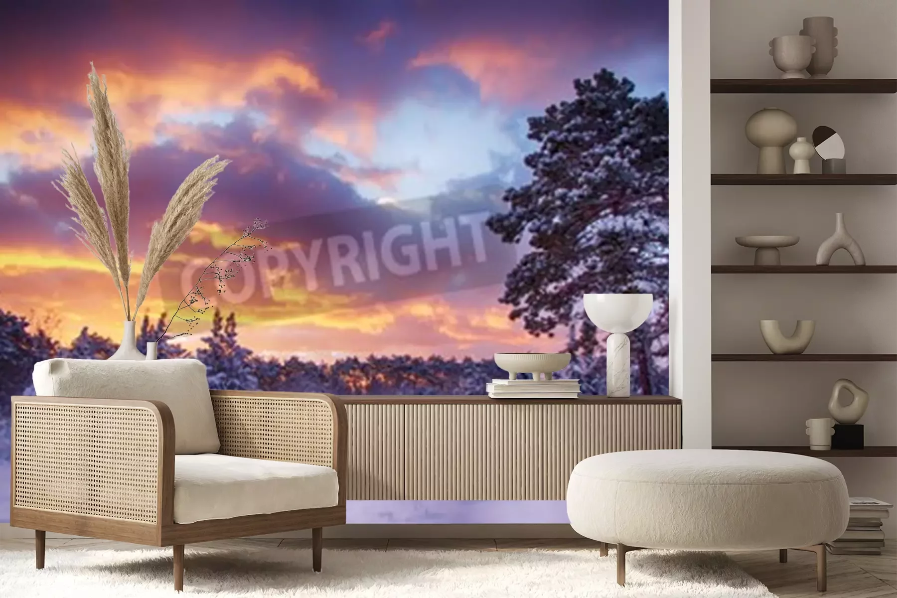 Papier peint  Lever de soleil et forêt dans la neige