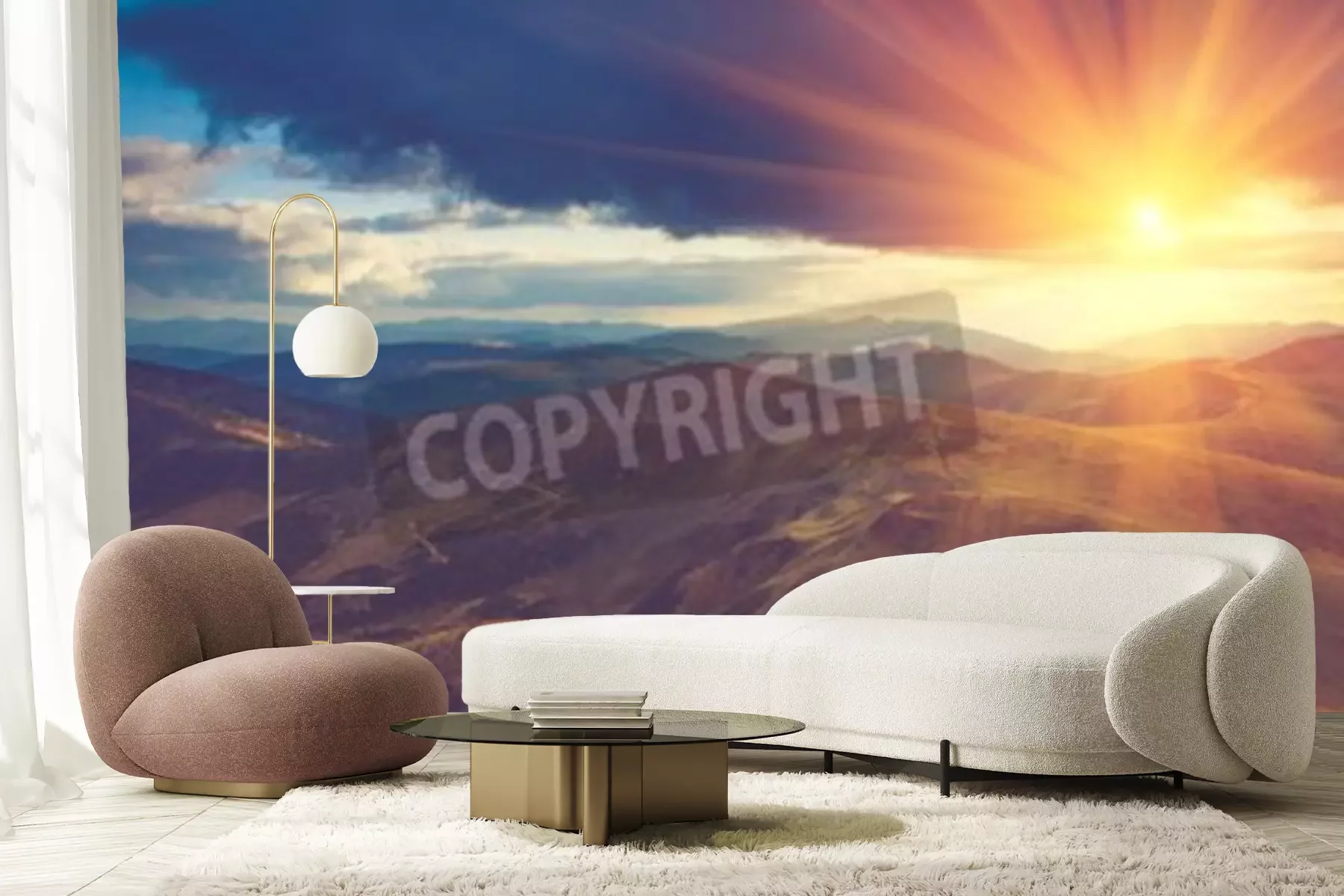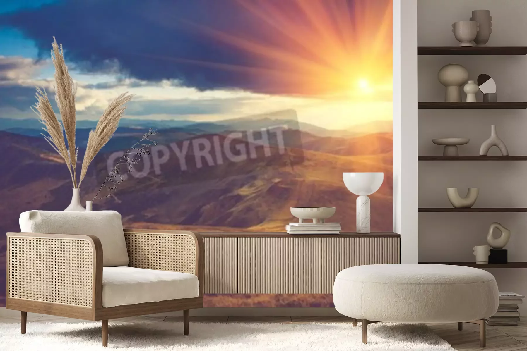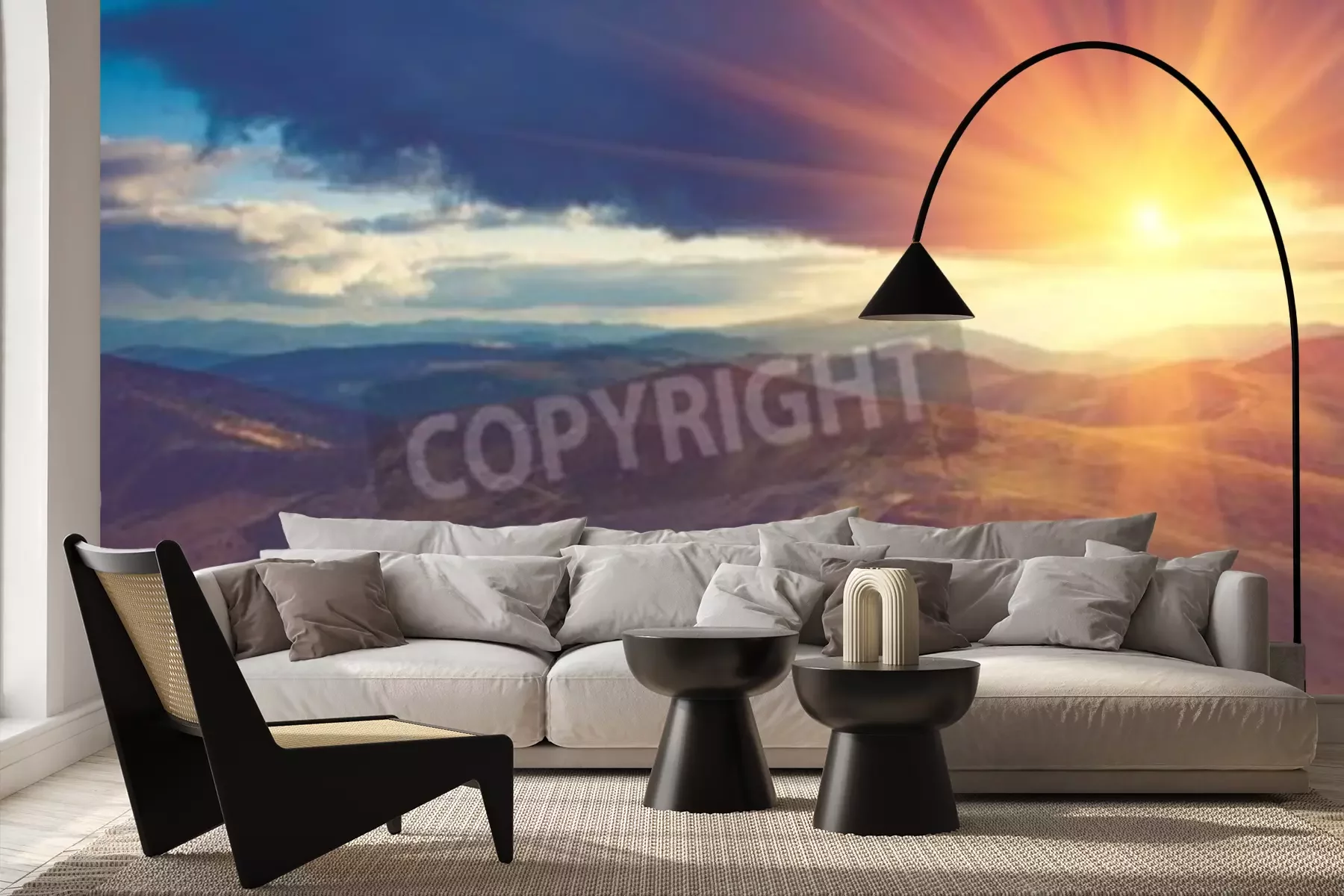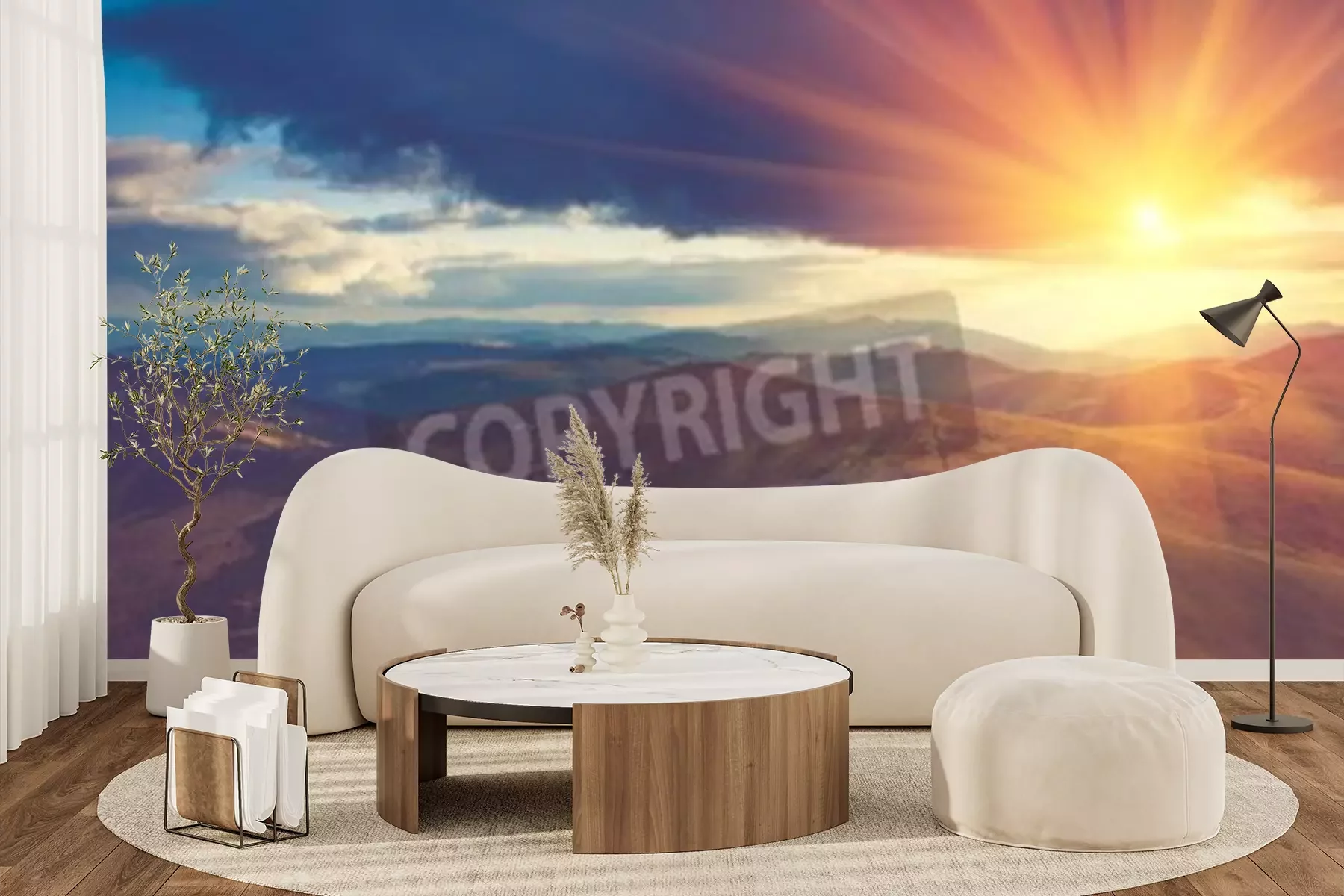 Papier peint  Lever de soleil sur un fond de nuages verts