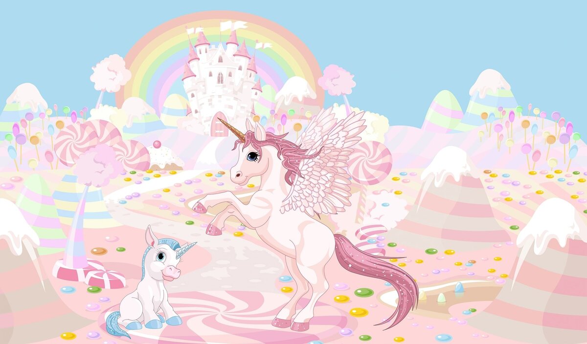 Papier peint : Licorne de conte de fées sur fond de château et d'arc-en-ciel