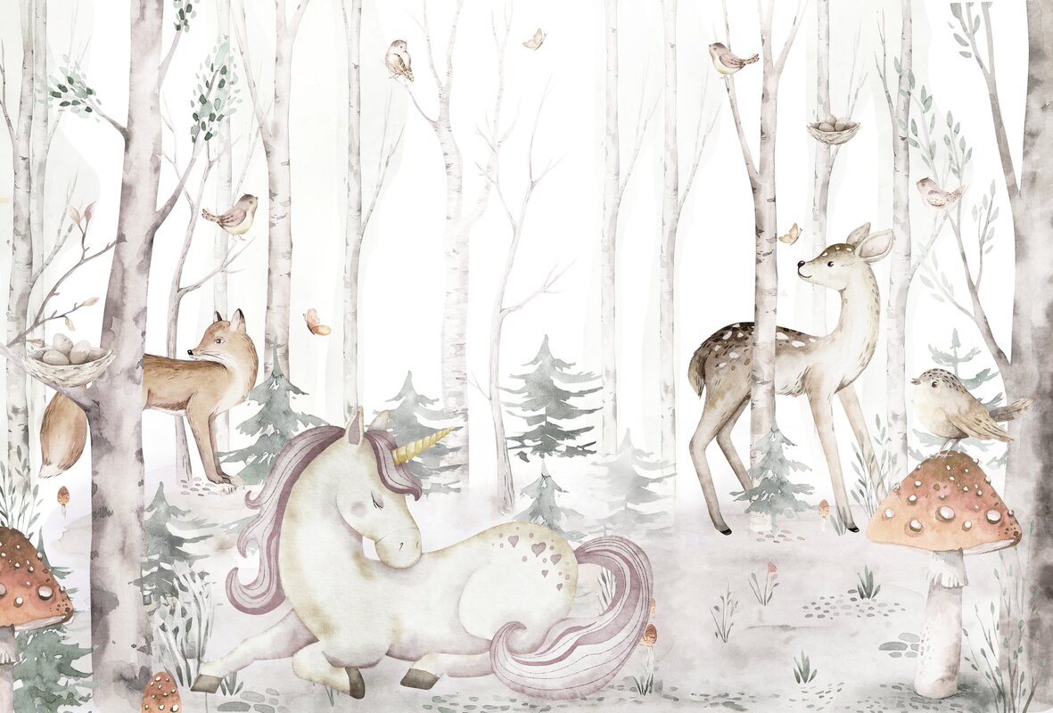 Papier peint : Licorne et petits animaux dans une forêt en aquarelle
