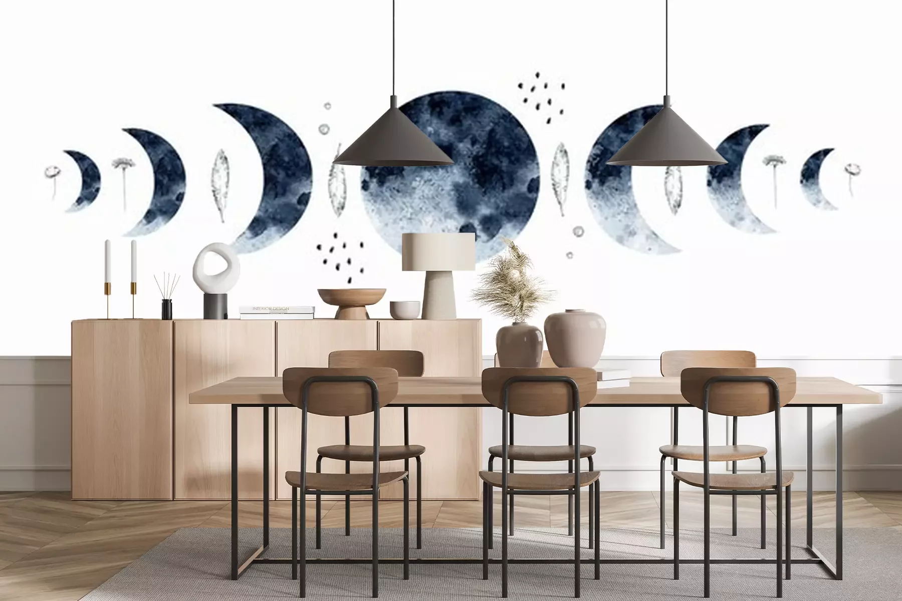 Papier peint  Lune aquarellée avec des plumes et des fleurs dans le style bohème