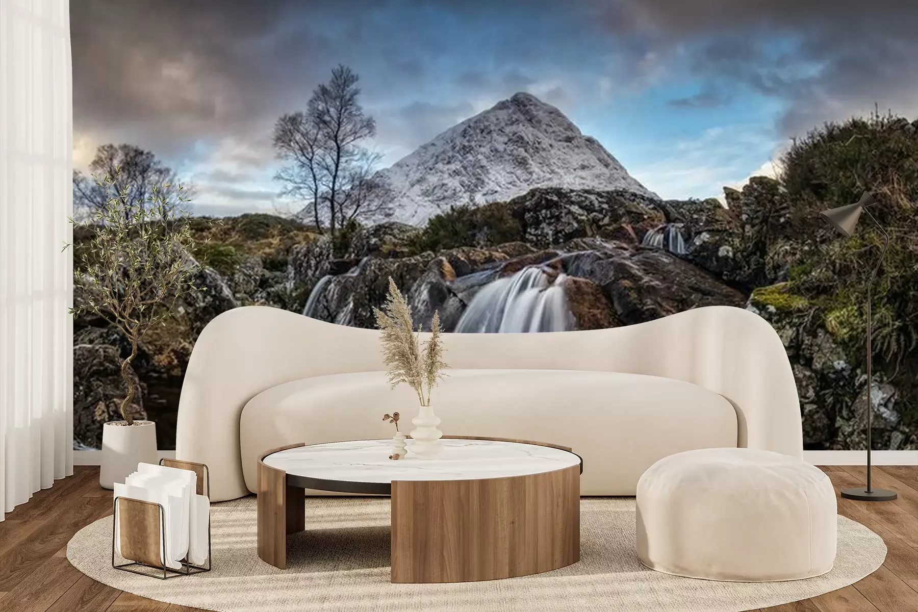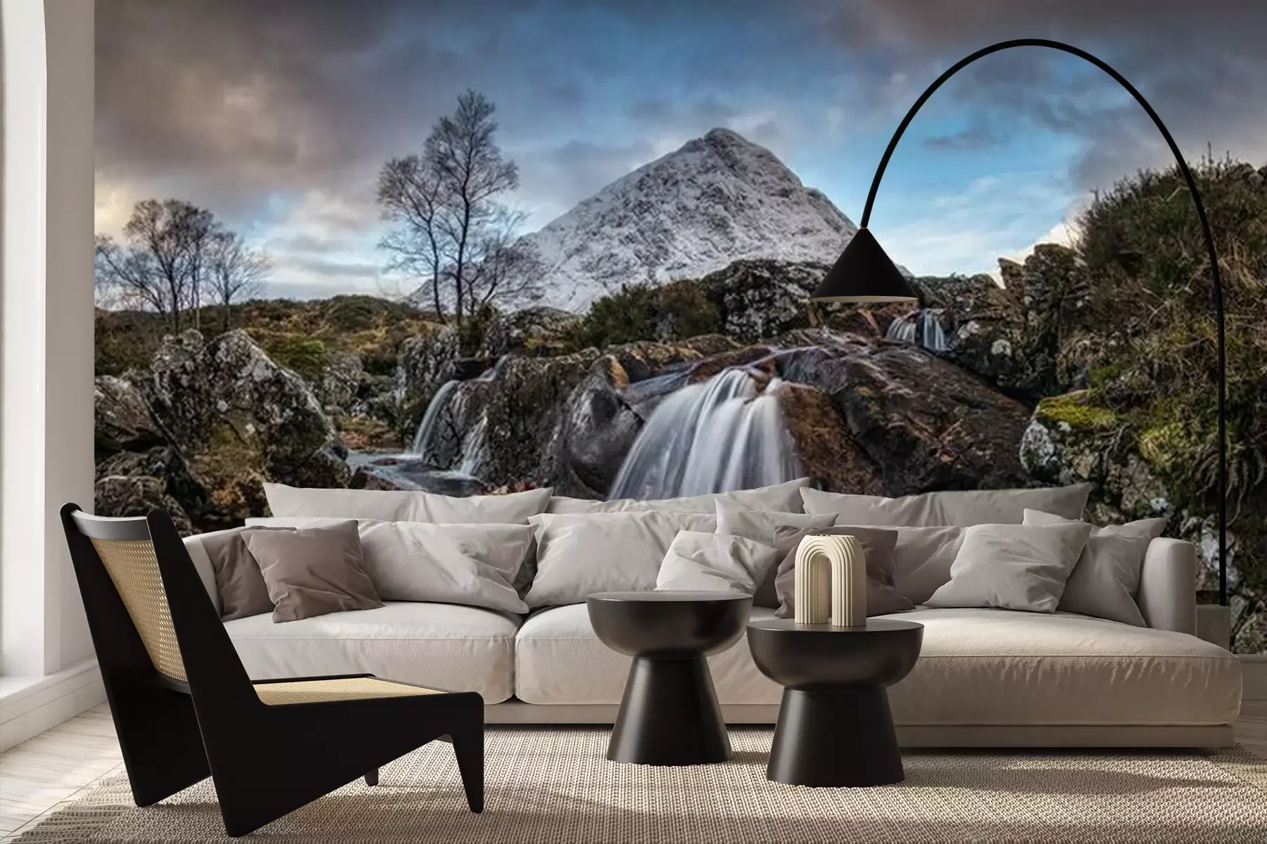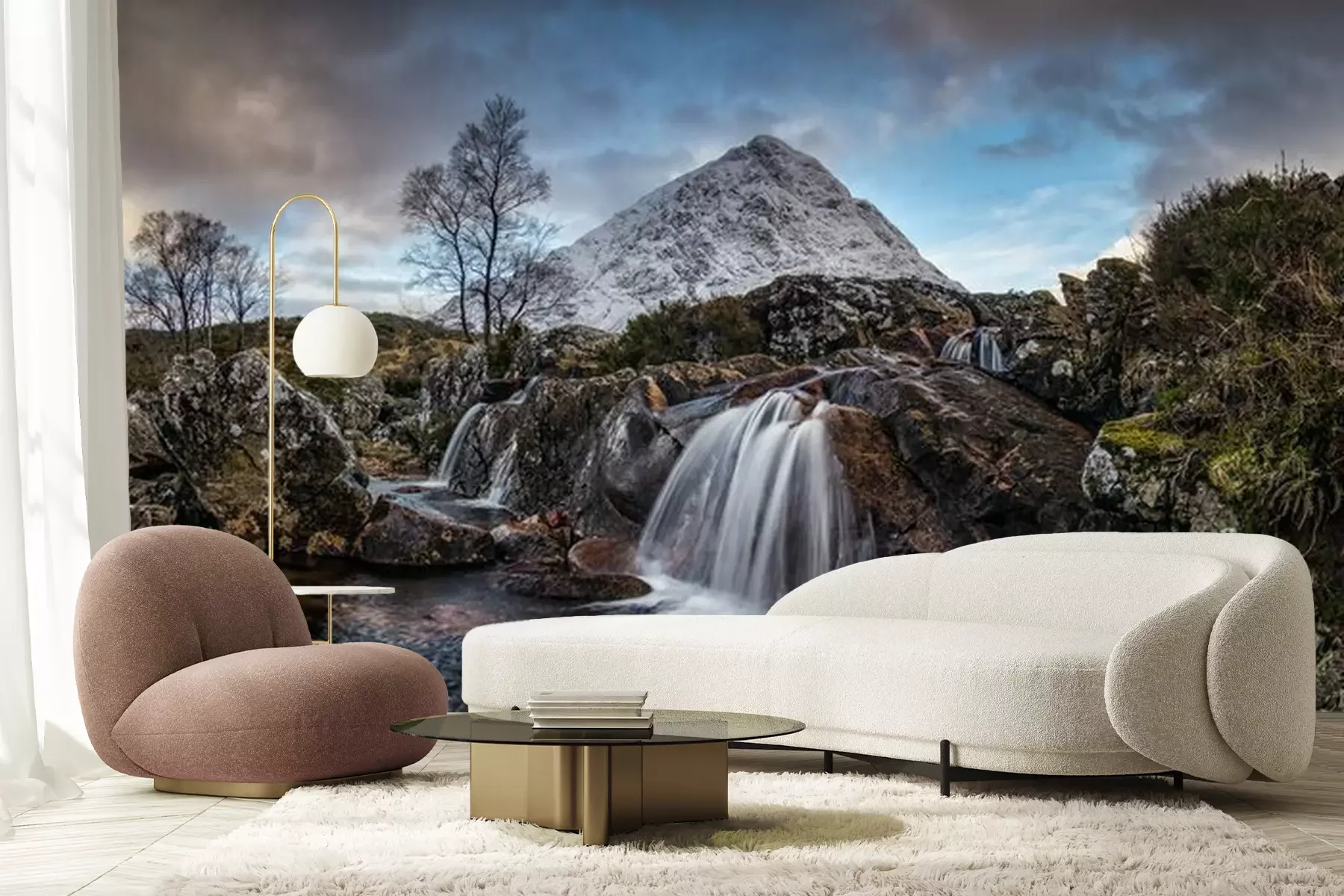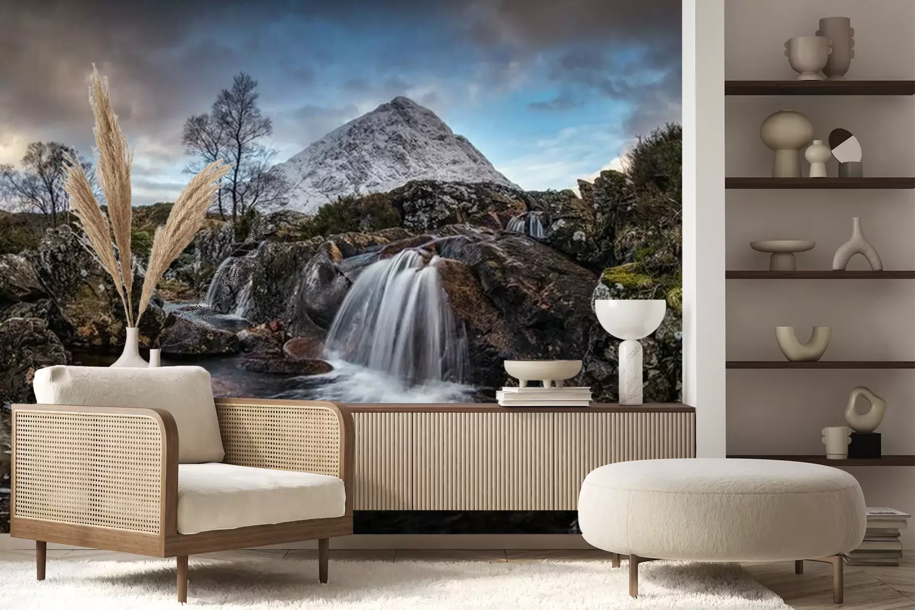 Papier peint  Magnifique paysage naturel d'Ecosse. Une chute d'eau avec la montagne couverte de neige en arrière-plan. L'Ecosse est tellement belle.