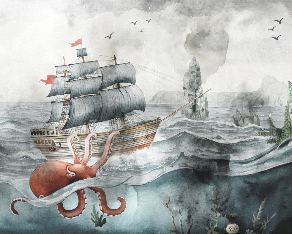 Papier peint : Modèle de bateau en mer et de pieuvre pour enfants