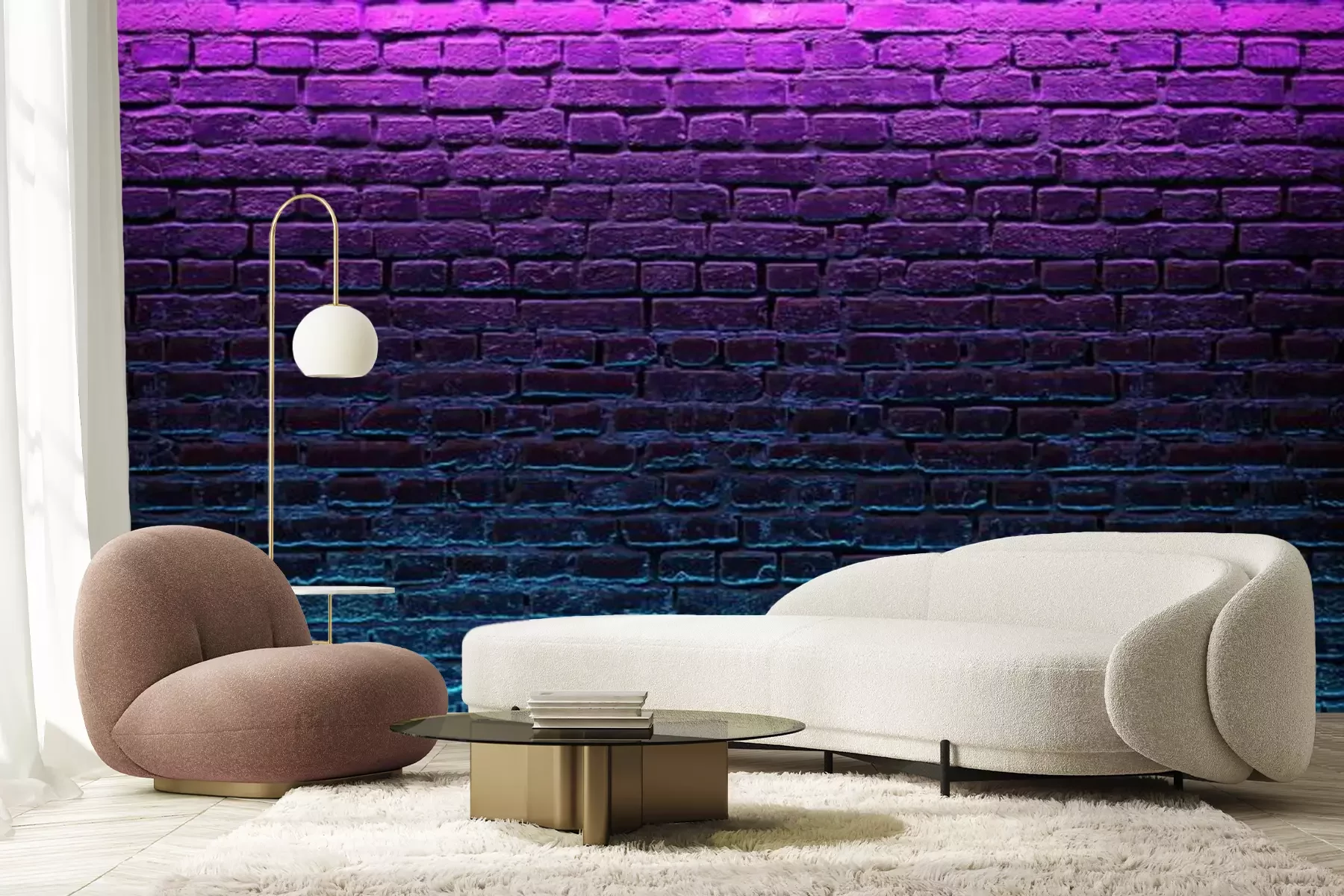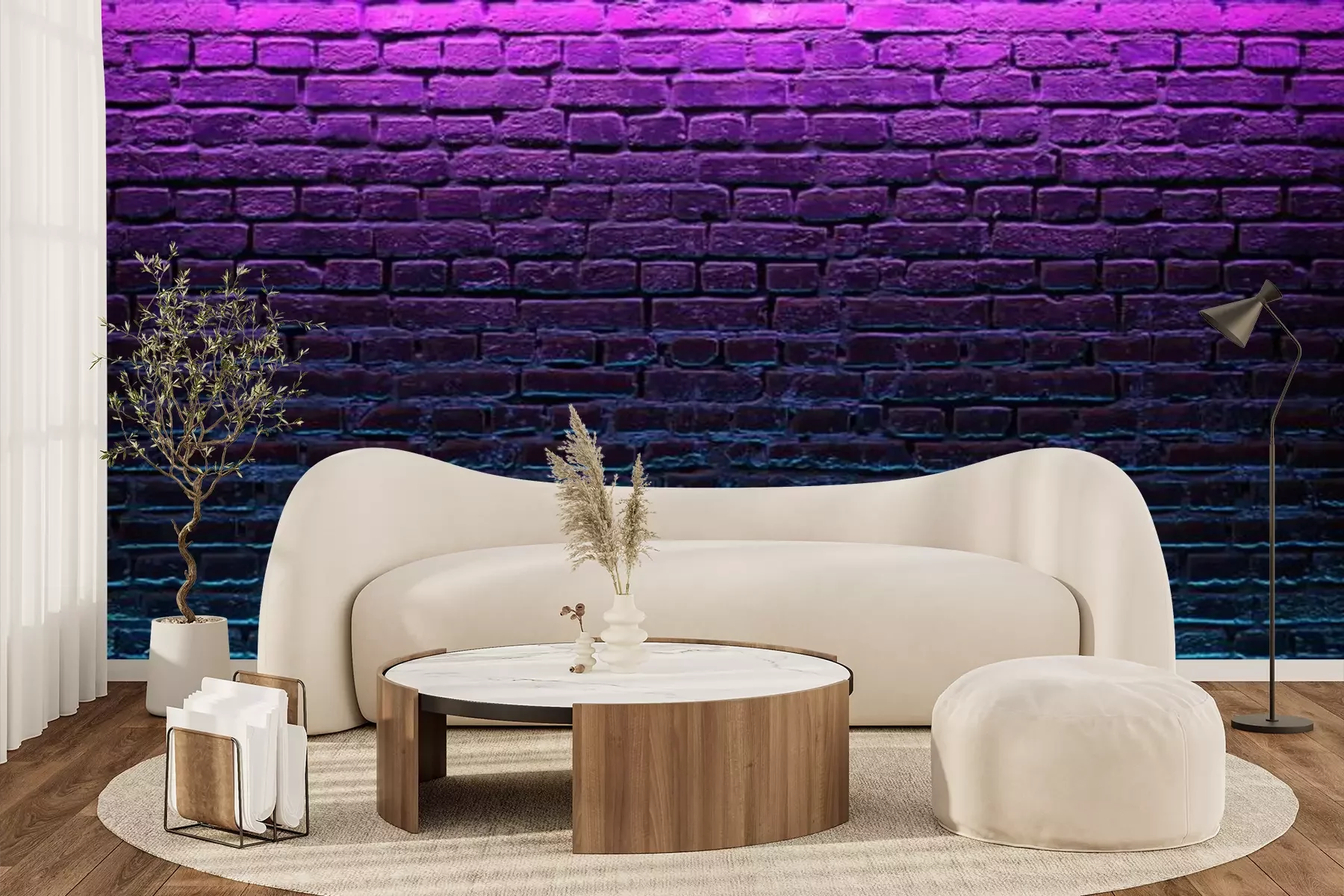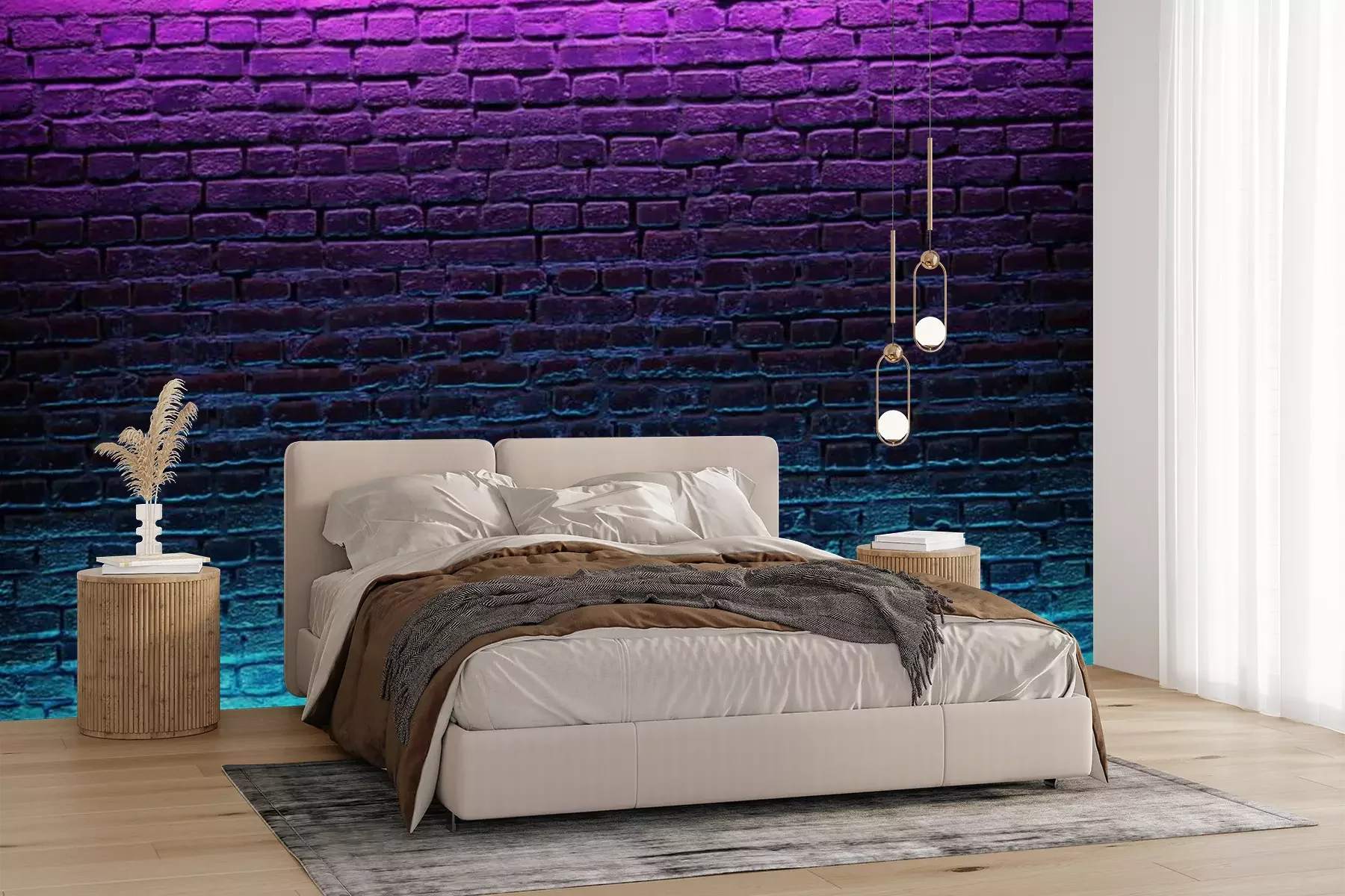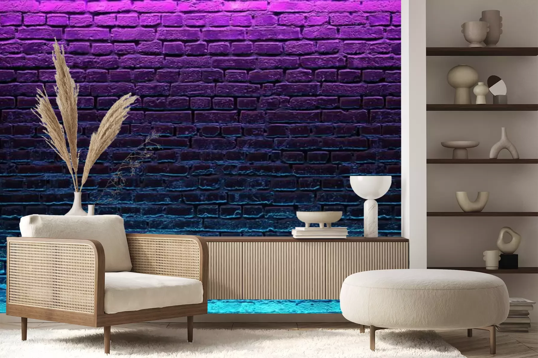 Papier peint  Modern futuristic neon lights on old grunge brick wall room background. 3d rendering