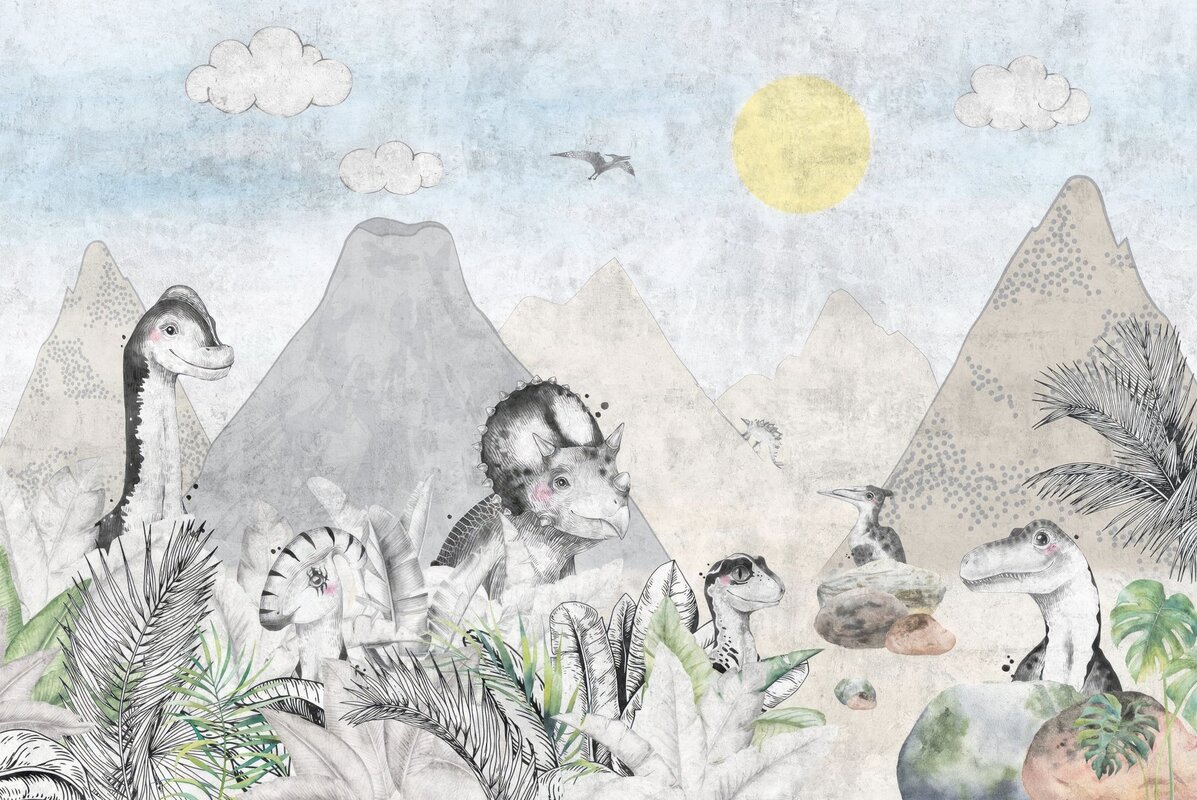 Papier peint : Monde des dinosaures en aquarelle avec des volcans