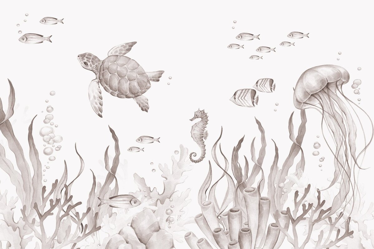 Papier peint : Monde sous-marin avec animaux marins illustration aquarelle pour enfants
