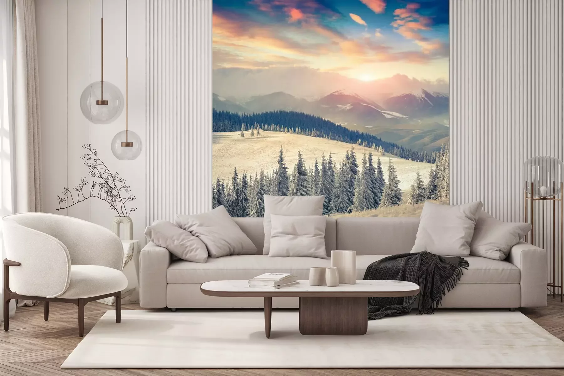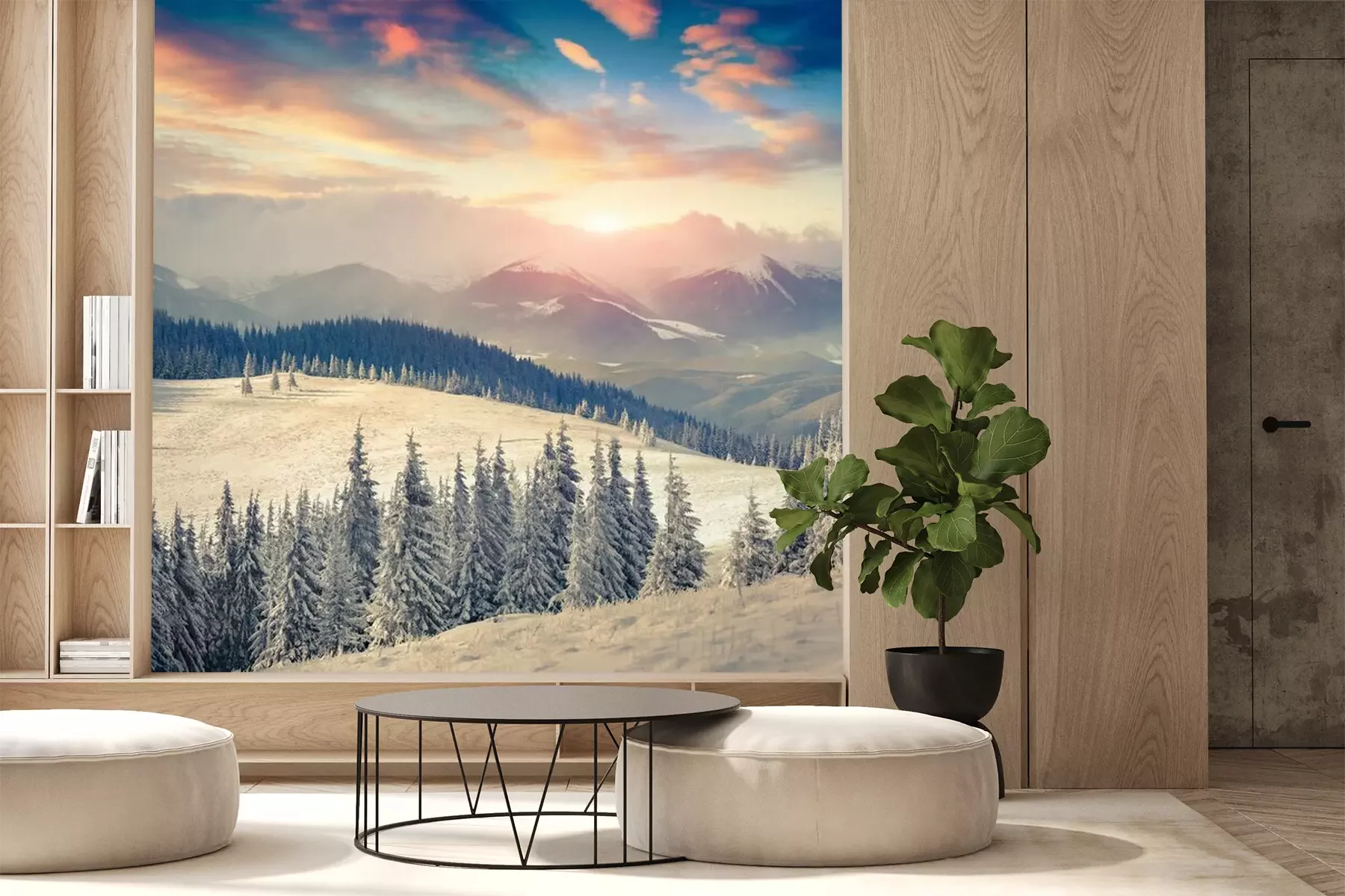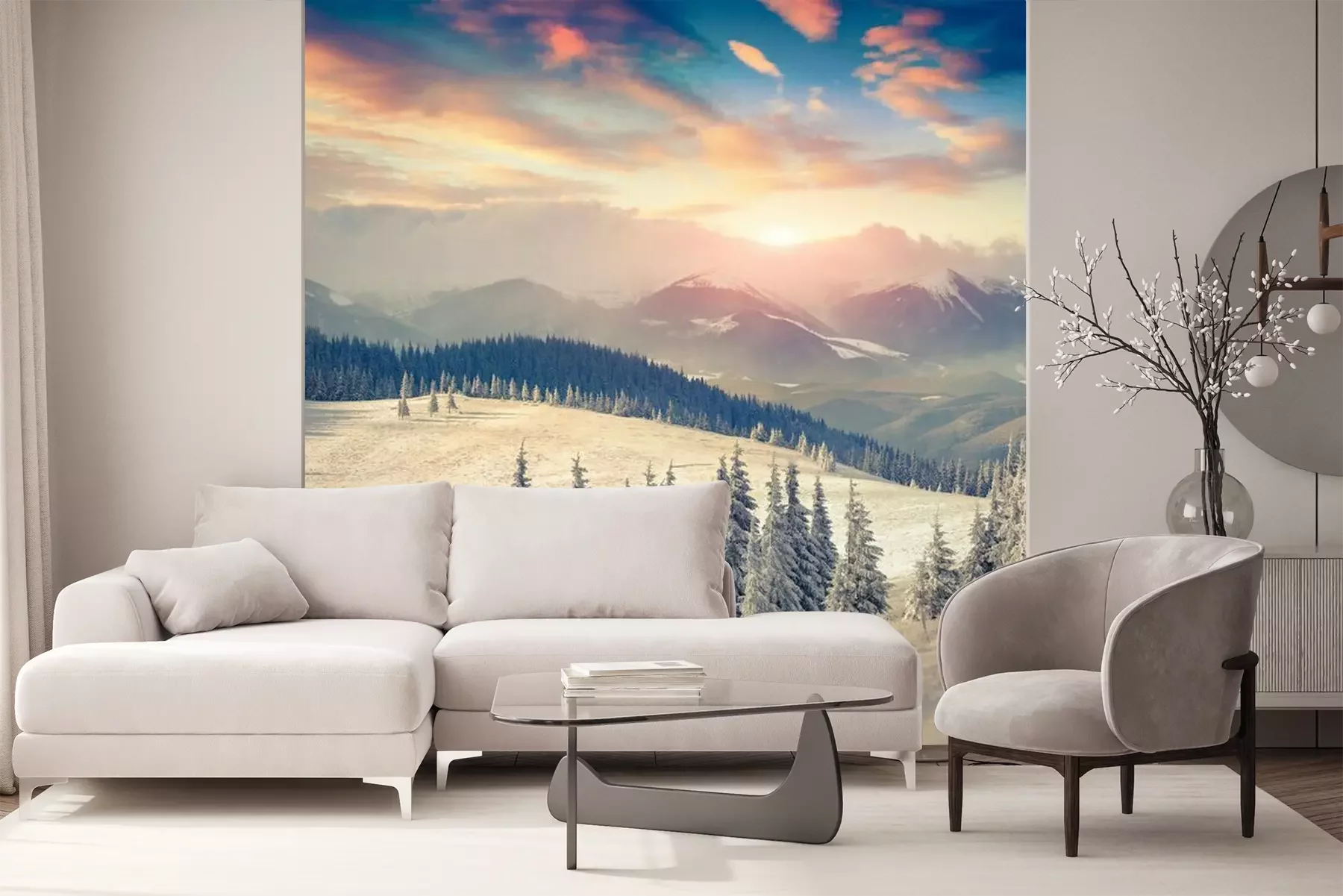 Papier peint  Montagnes d'hiver au coucher du soleil