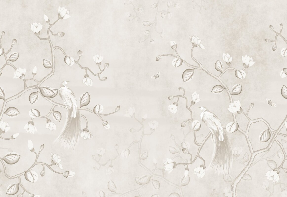Papier peint : Motif beige avec des oiseaux sur des branches de magnolia