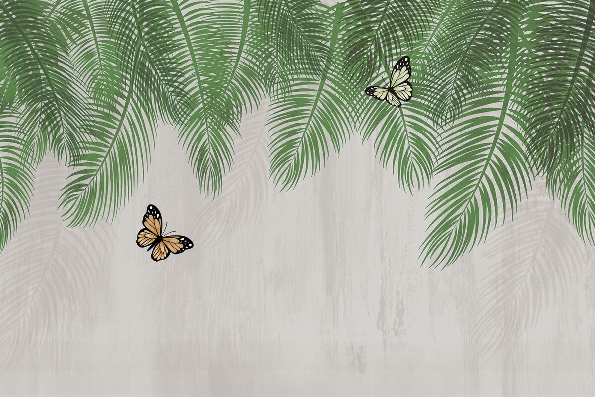Papier peint : Motif botanique avec feuilles de palmier vertes et papillons sur fond texturé