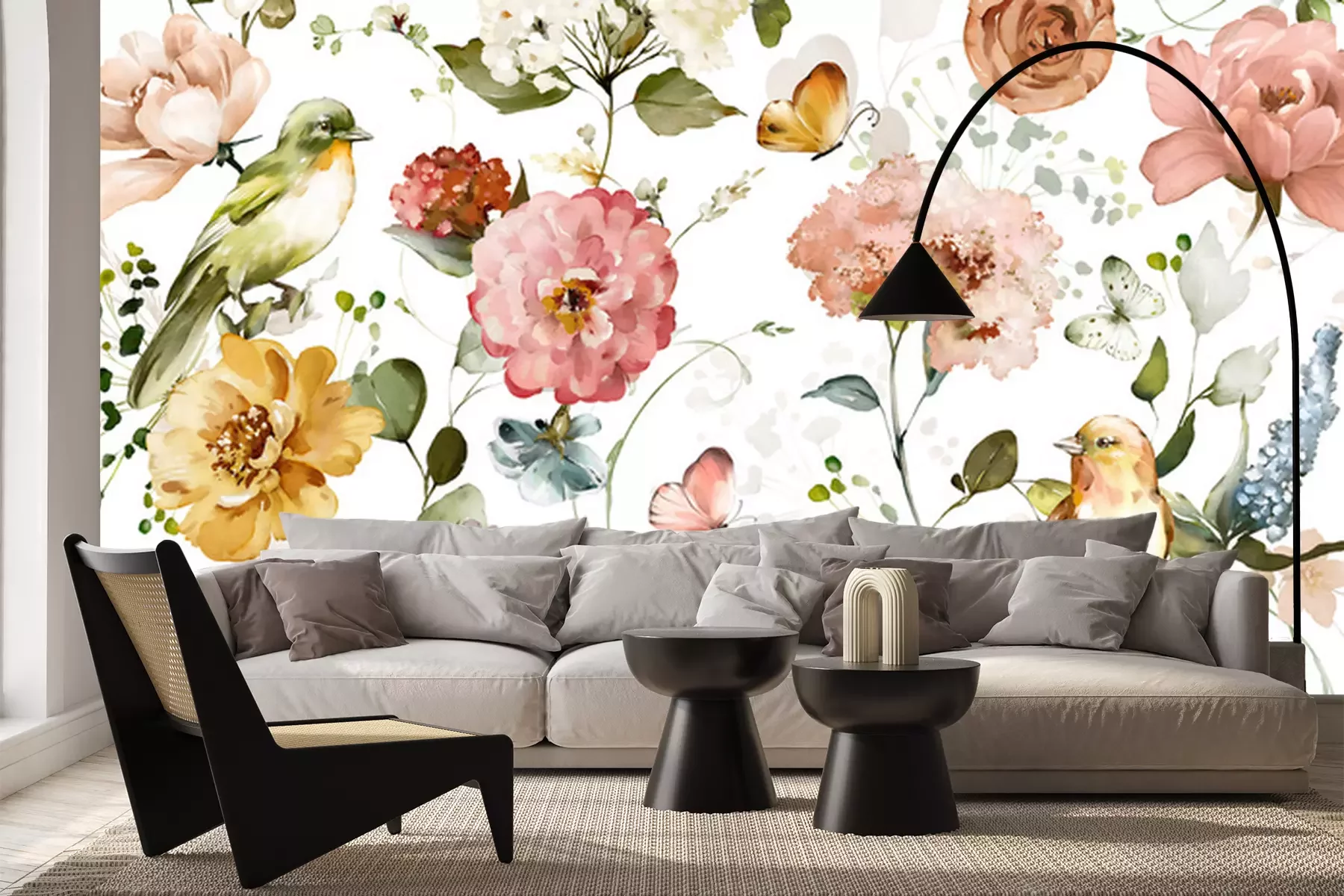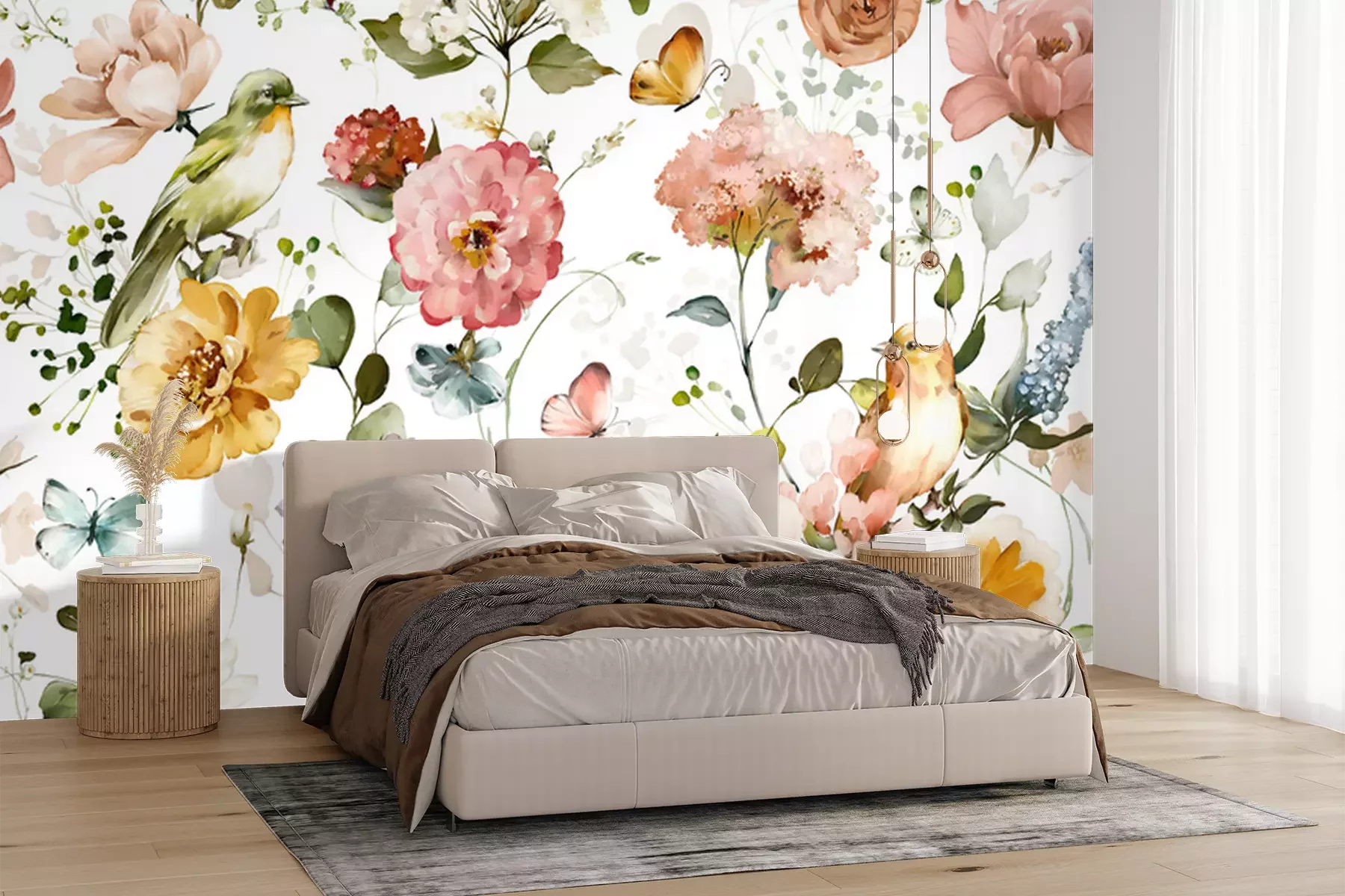 Papier peint  Motif botanique avec oiseaux peints à l'aquarelle