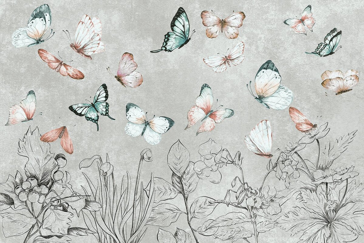 Papier peint : Motif botanique avec papillons mites et plantes sur fond gris