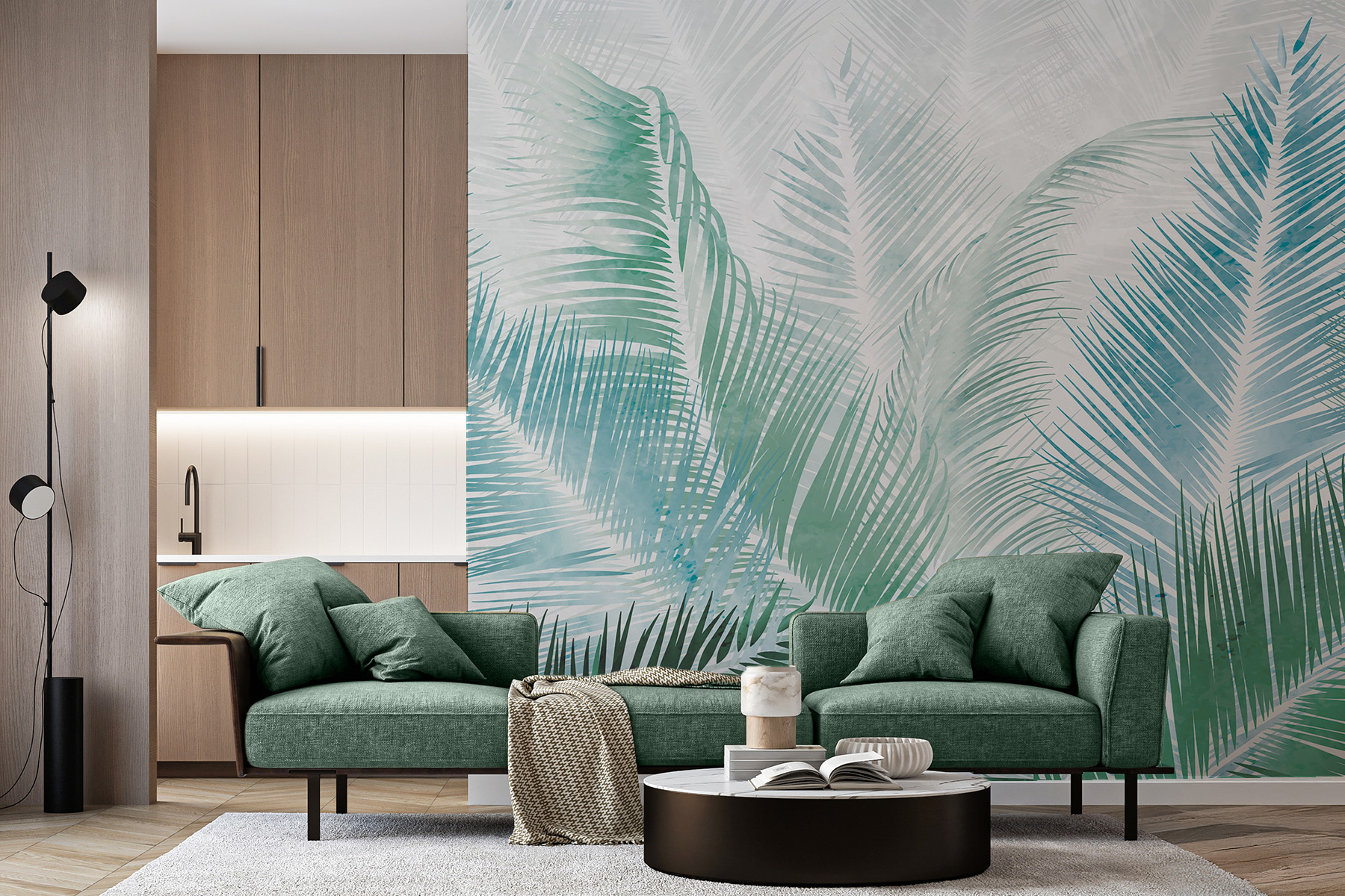Papier peint : Motif botanique feuilles de palmier bleues et vertes