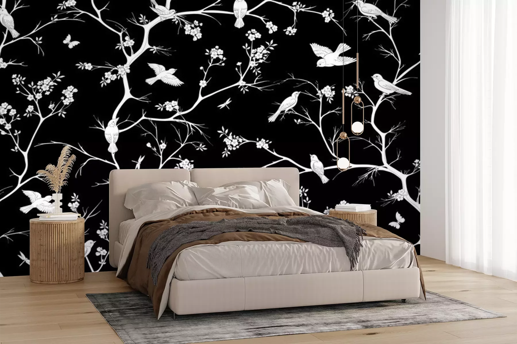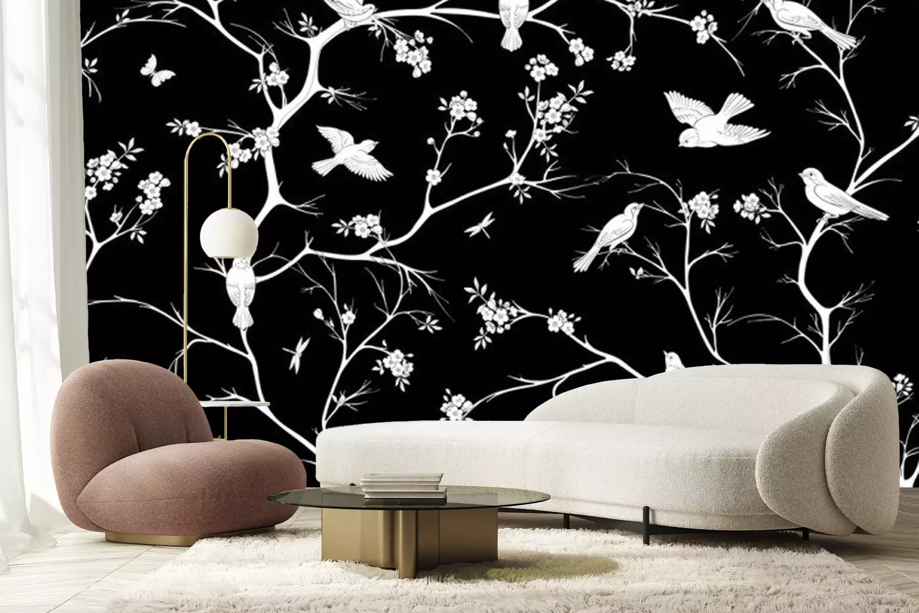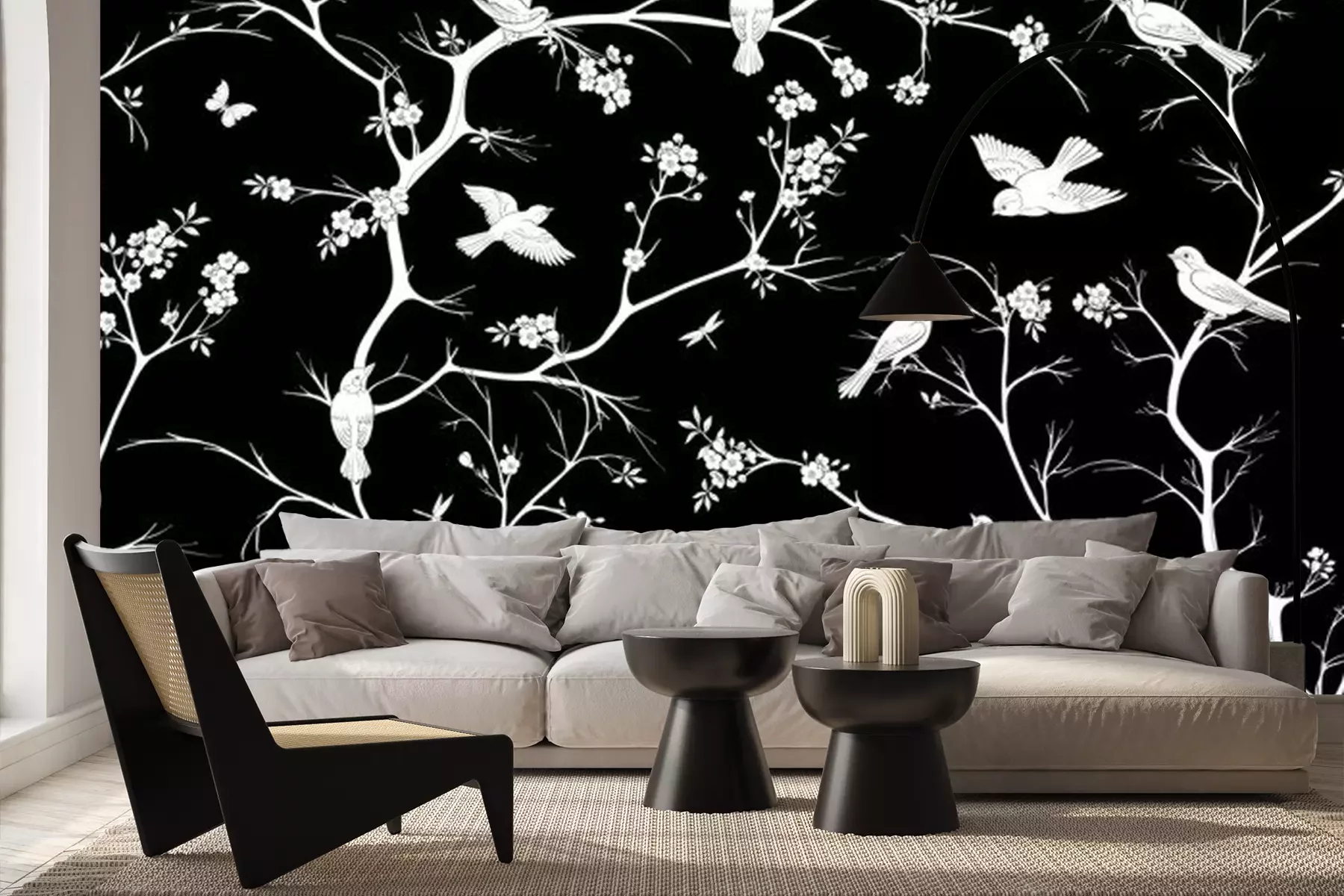 Papier peint  Motif chinoiserie noir avec oiseaux et arbre