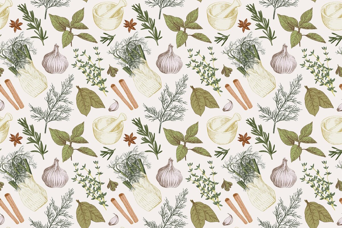 Papier peint : Motif décoratif avec des herbes et des légumes