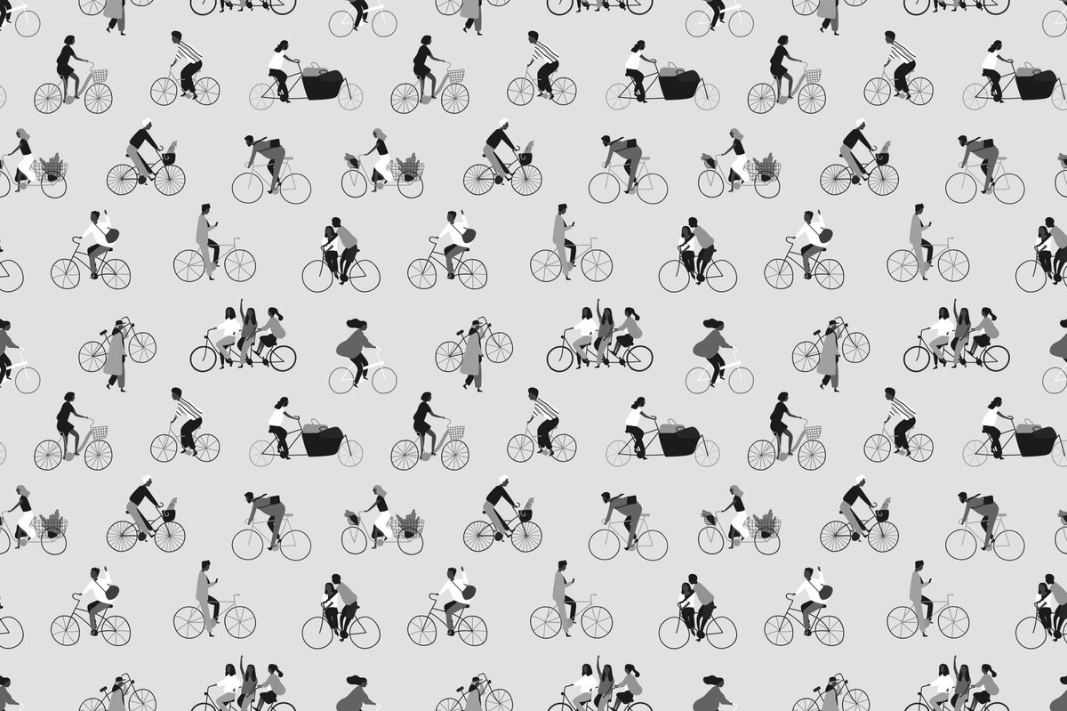 Motif en noir et blanc avec des gens à vélo