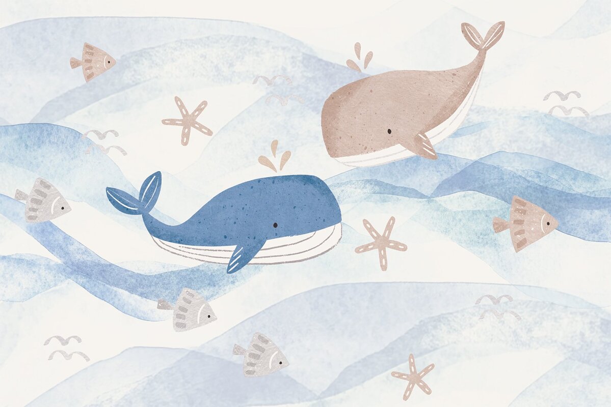 Papier peint : Motif enfantin avec baleines et poissons dans une scène marine aquarelle