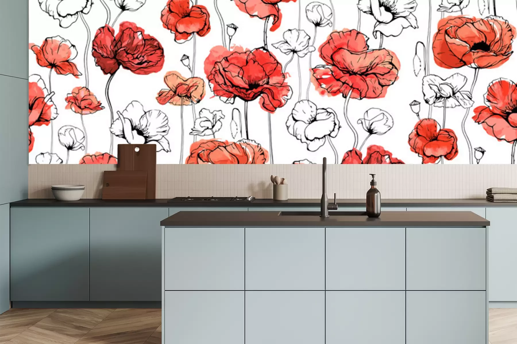Papier peint  Motif floral avec fleurs rouges et bourgeons