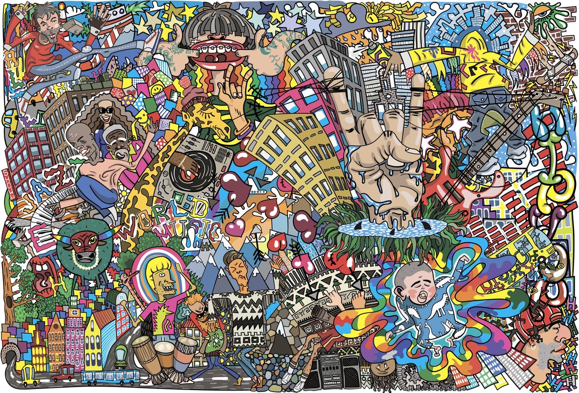 Papier peint : Motifs colorés de bâtiments et de personnes