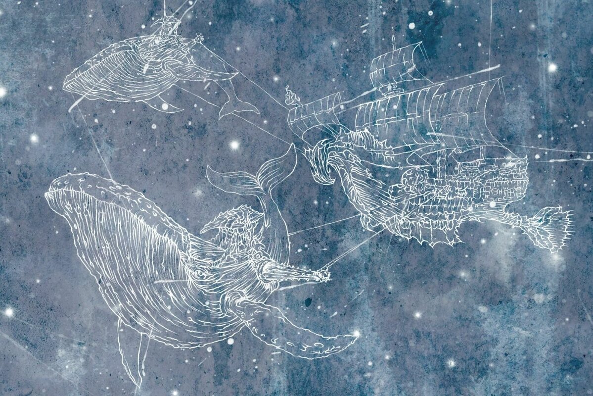 Papier peint : Navire avec des baleines sur ciel étoilé motif abstrait pour enfants