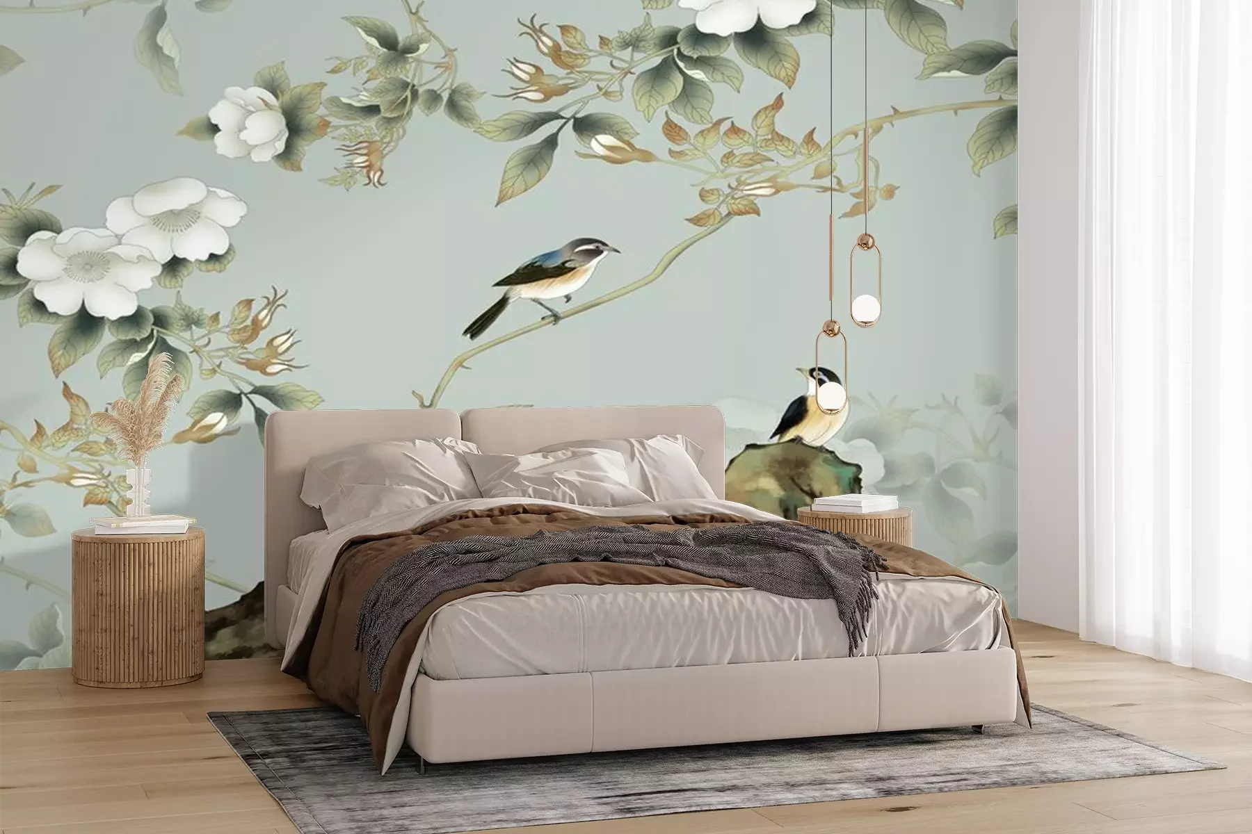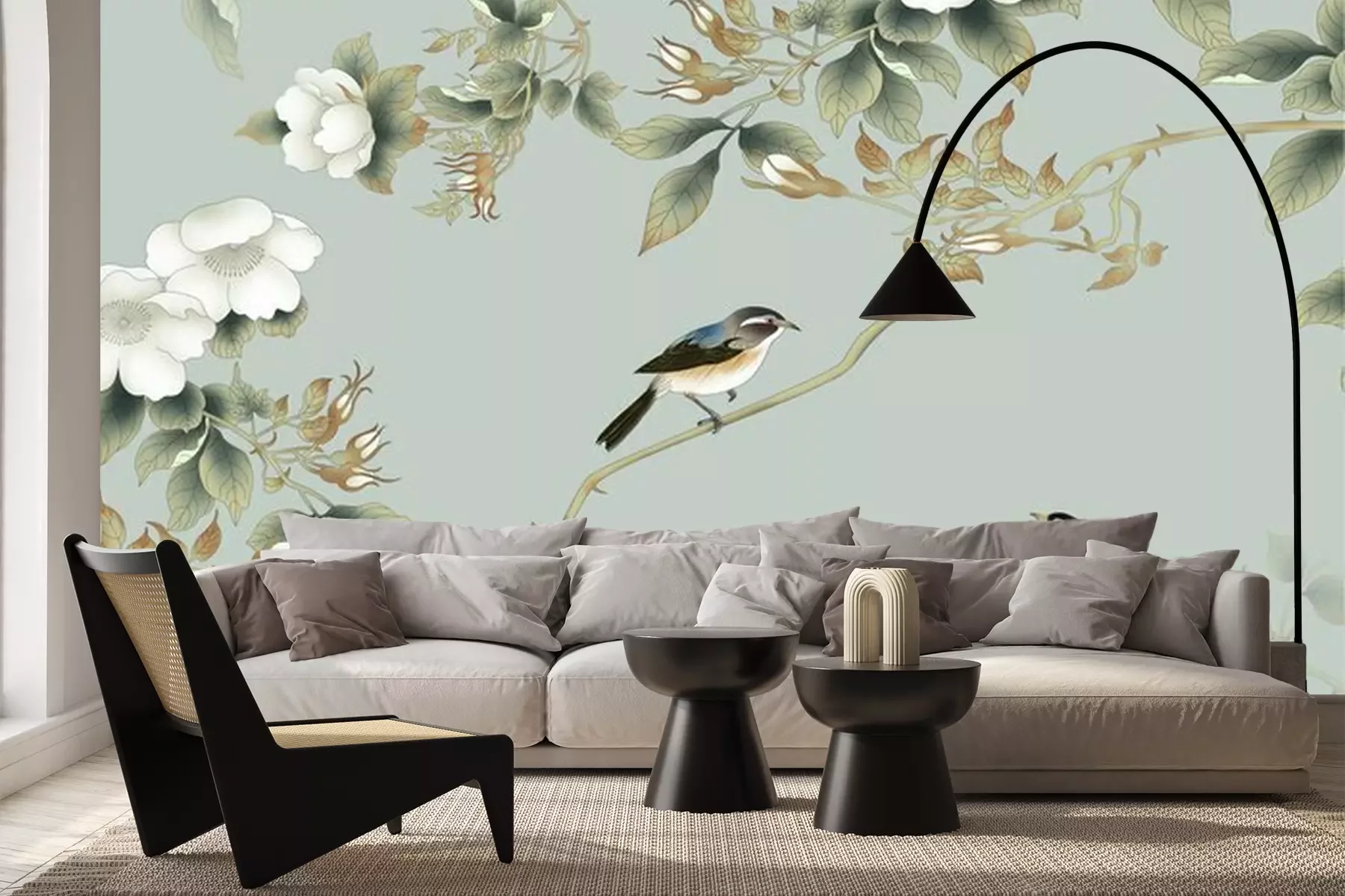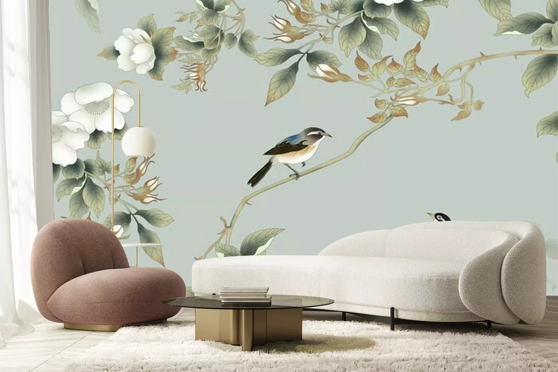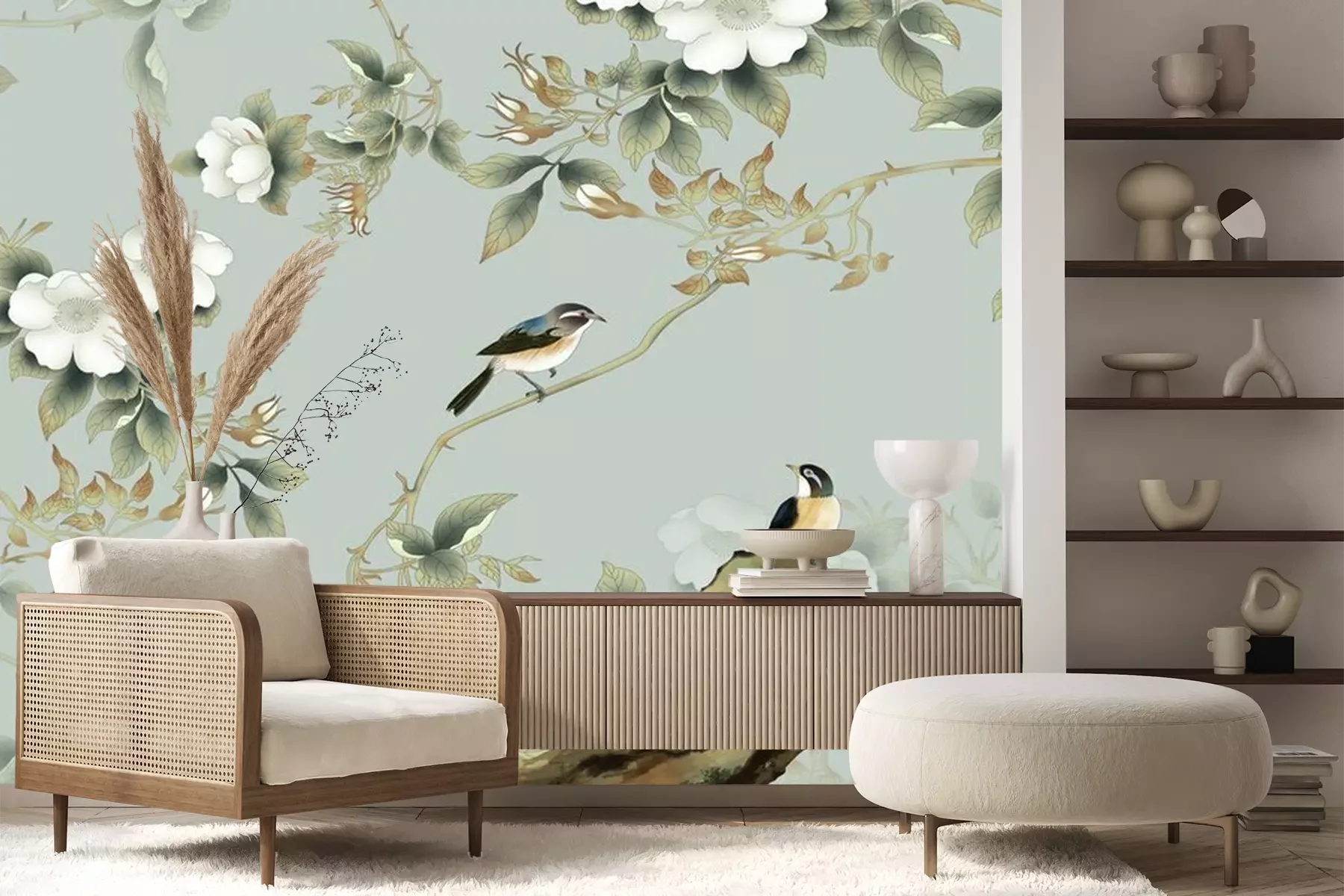 Papier peint  Oiseaux assis sur des branches avec des fleurs blanches