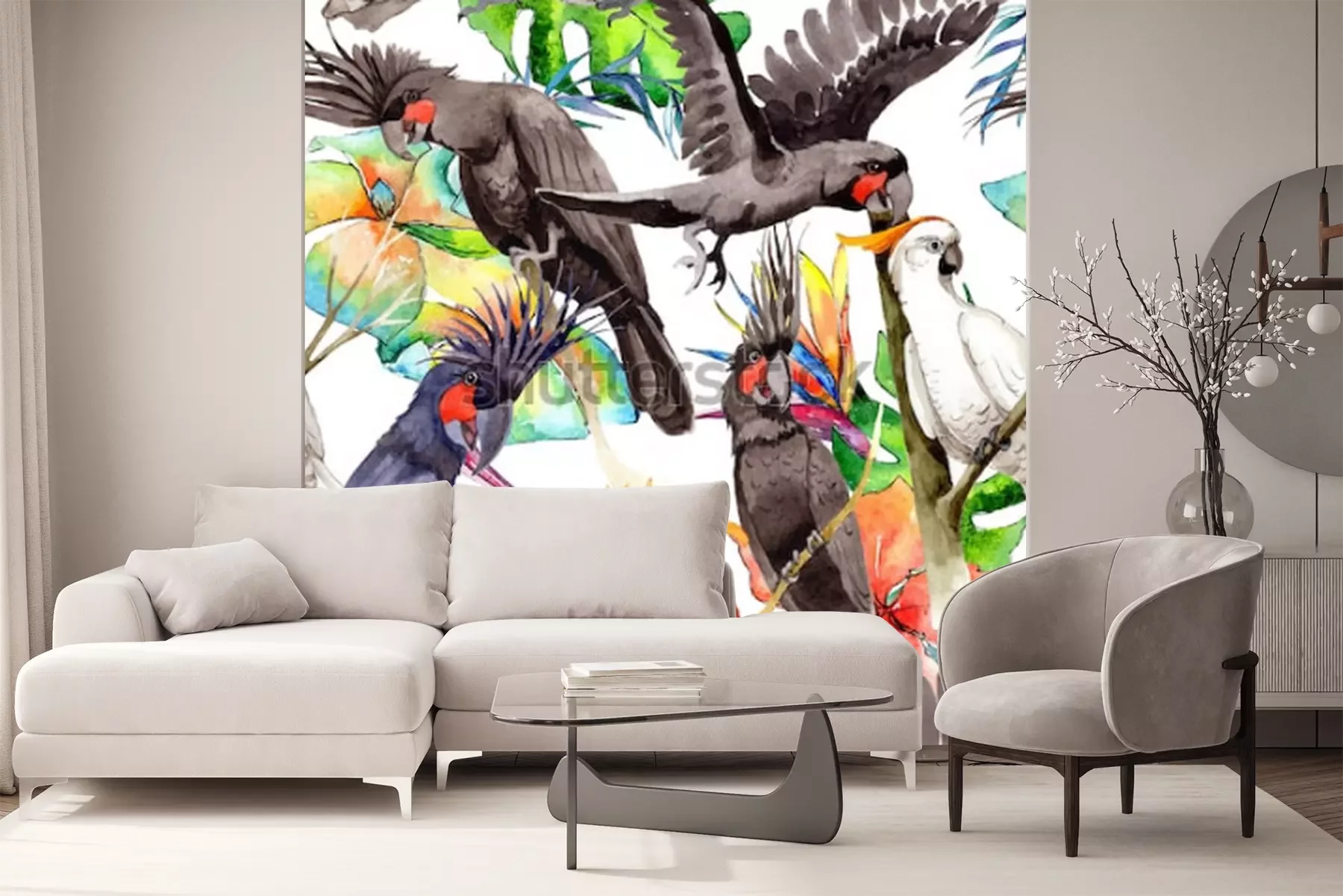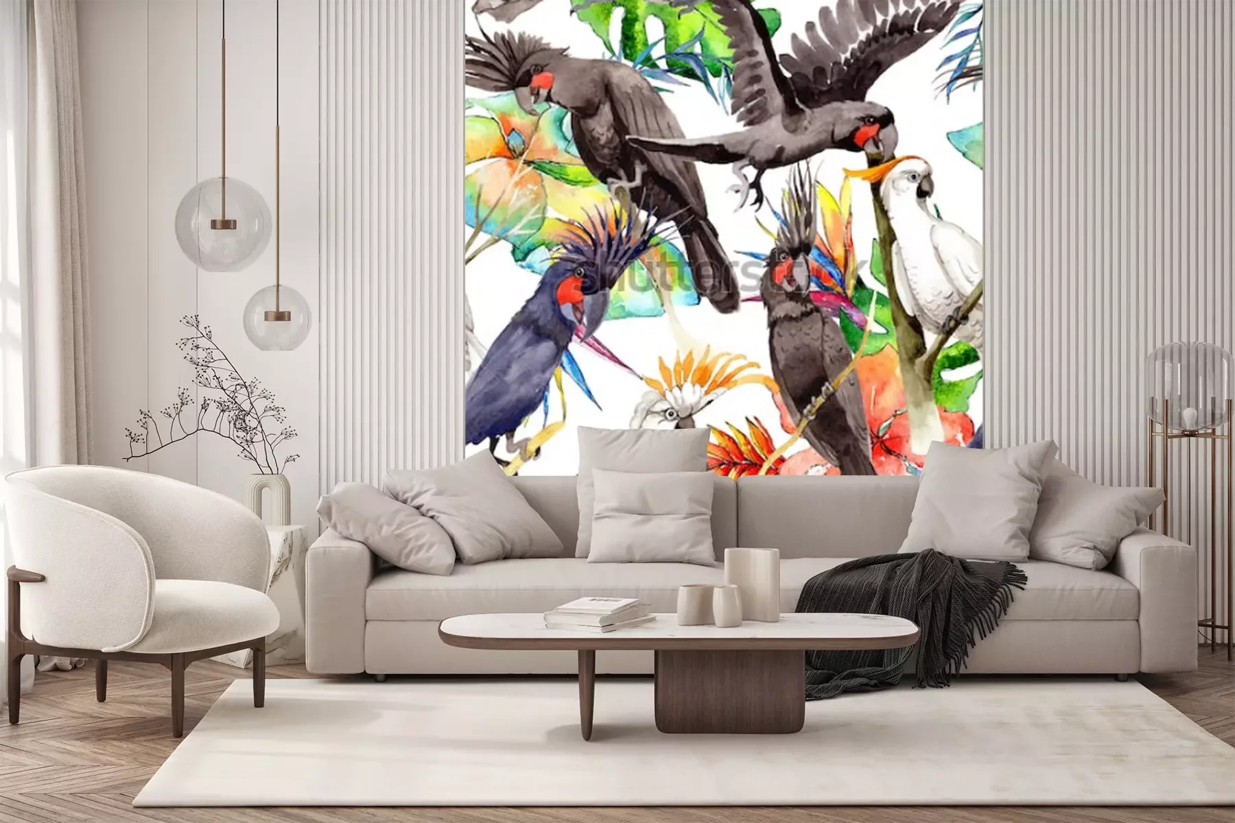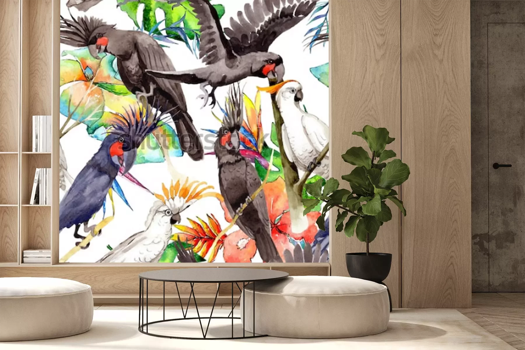 Papier peint  Oiseaux exotiques sur fond de feuilles