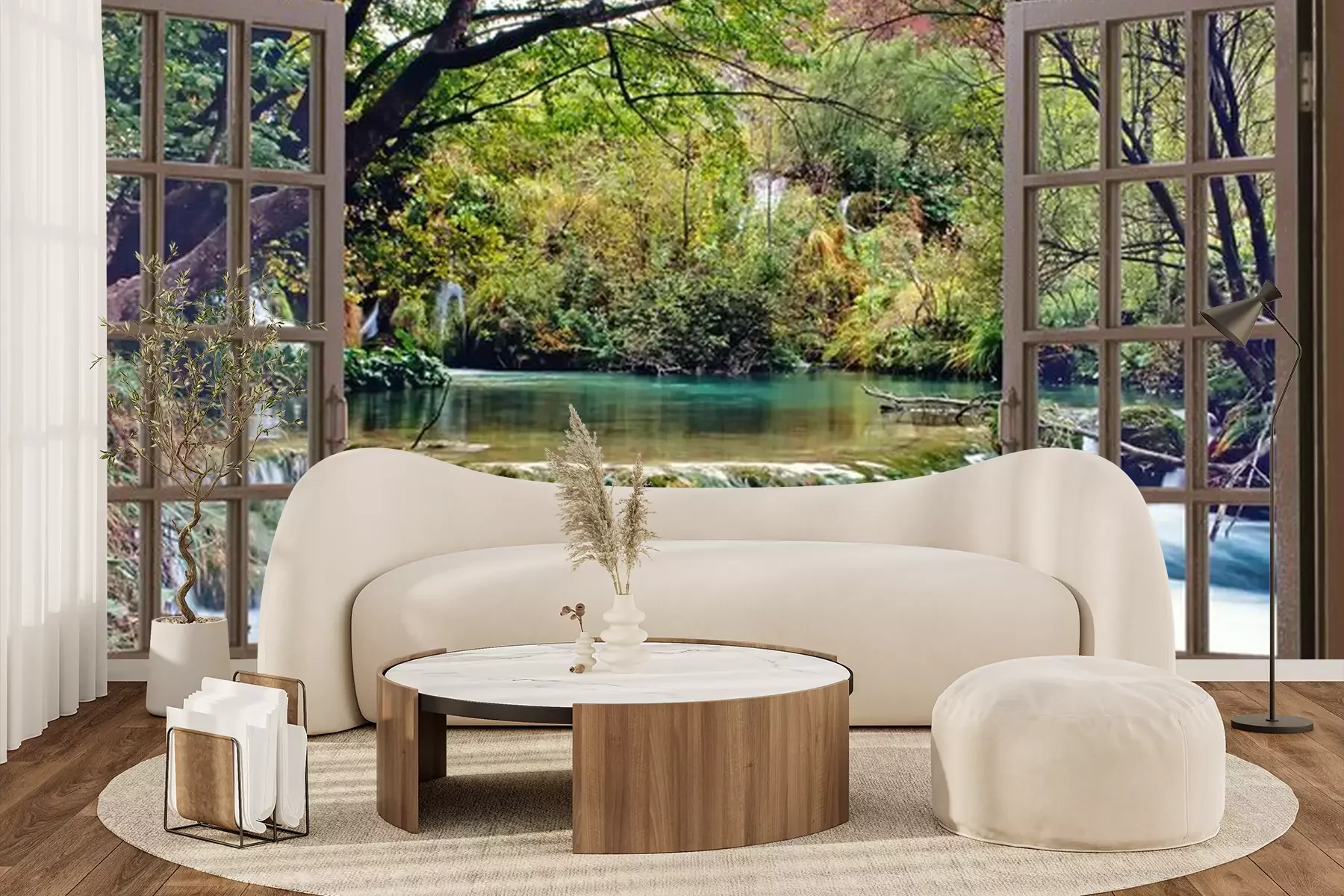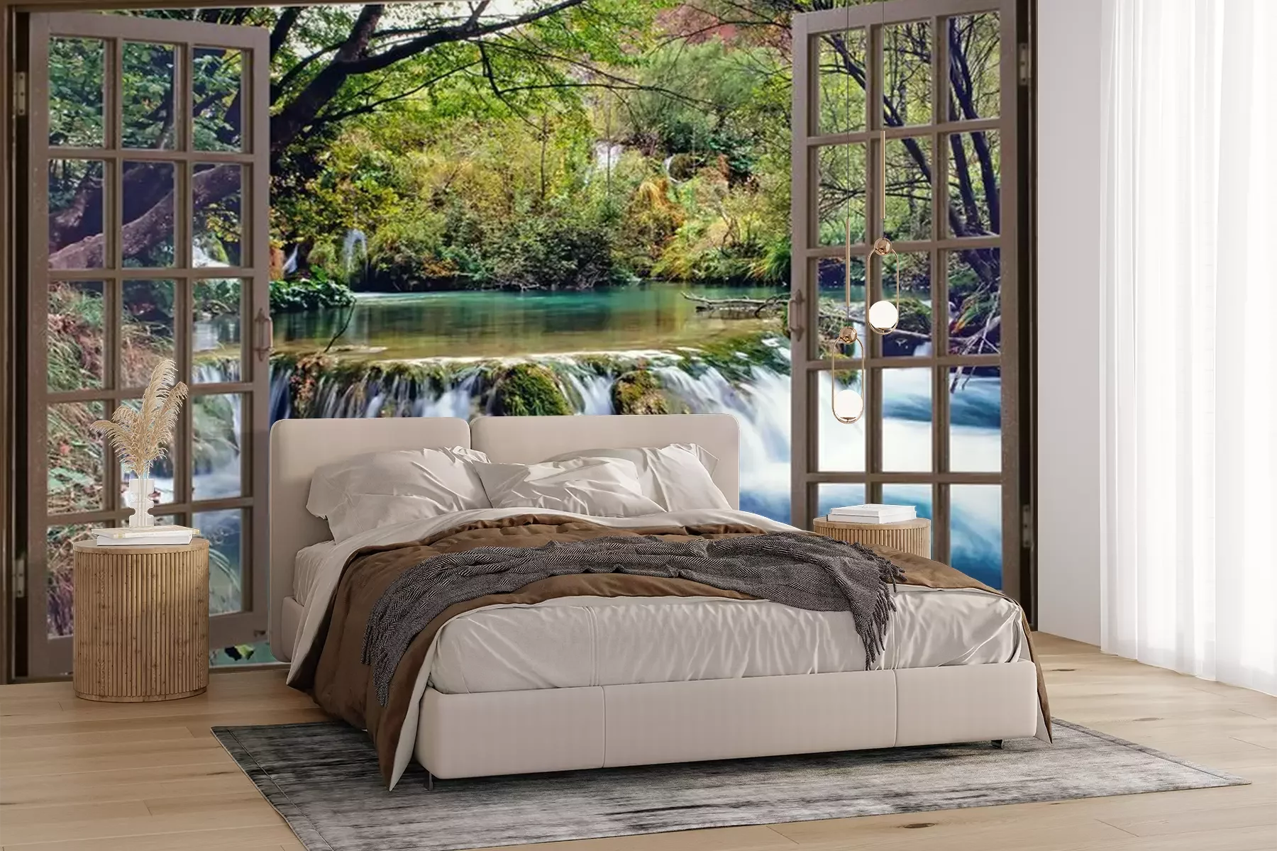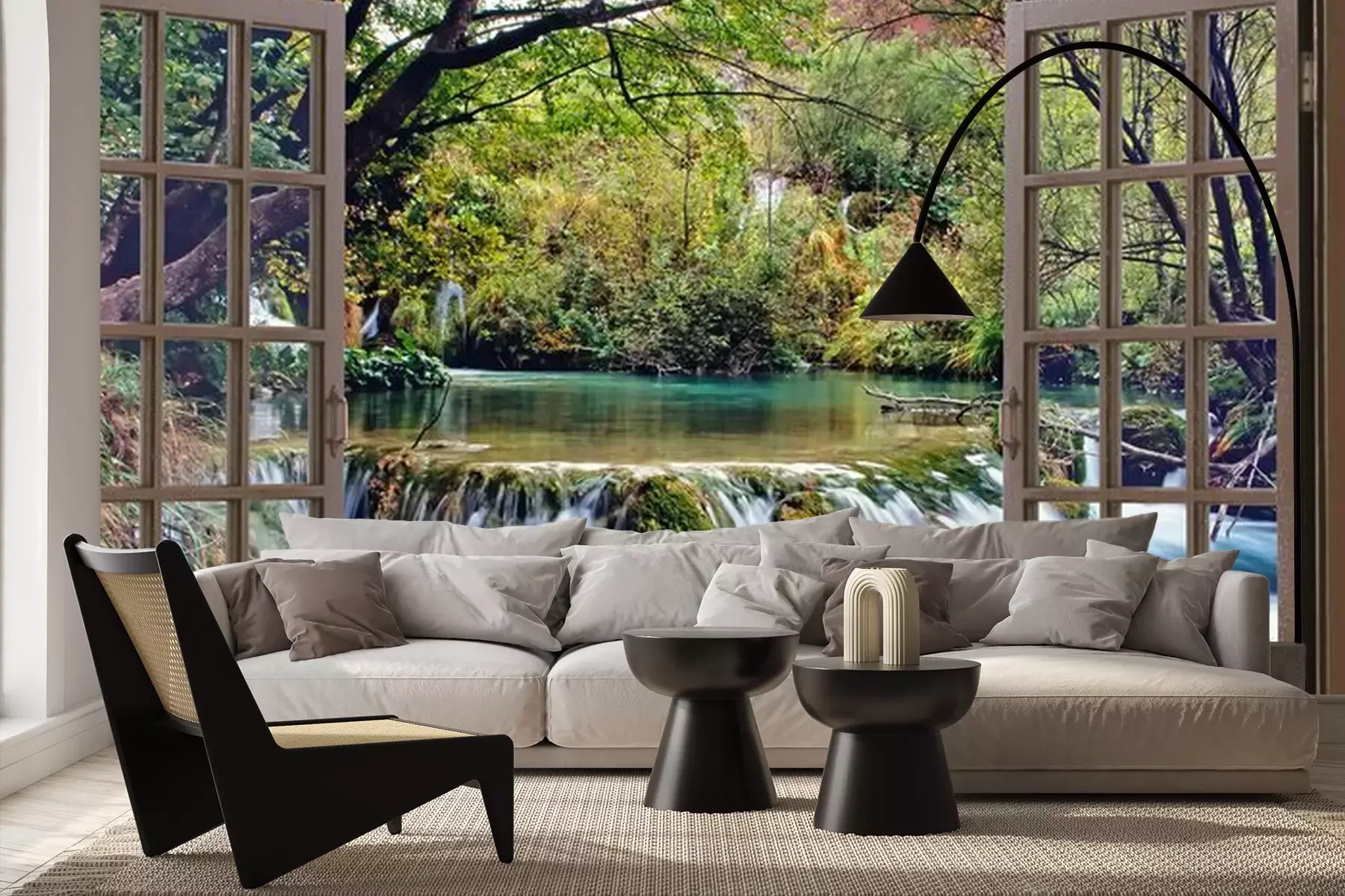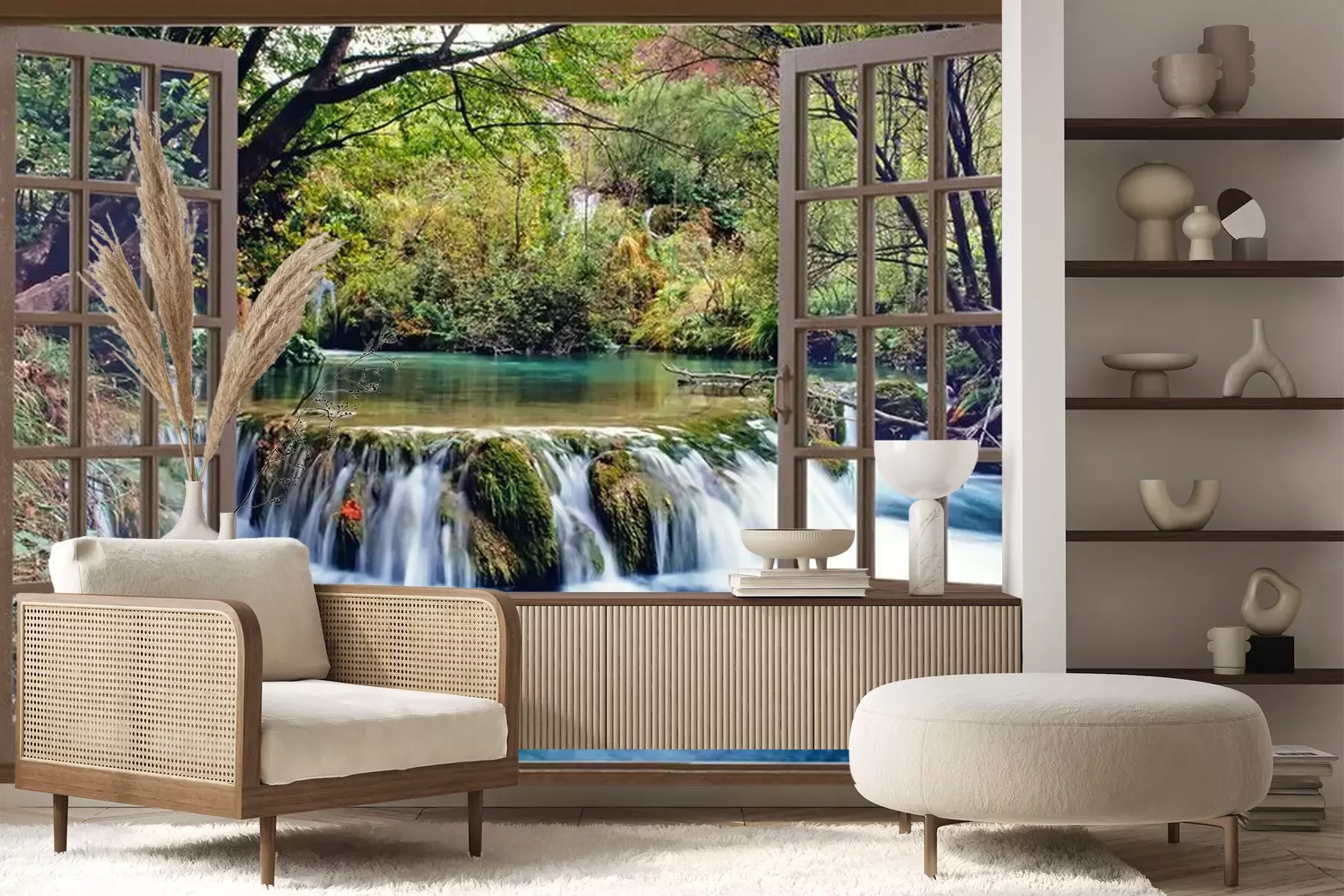 Une cascade dans une forêt vue depuis une fenêtrePapier peint