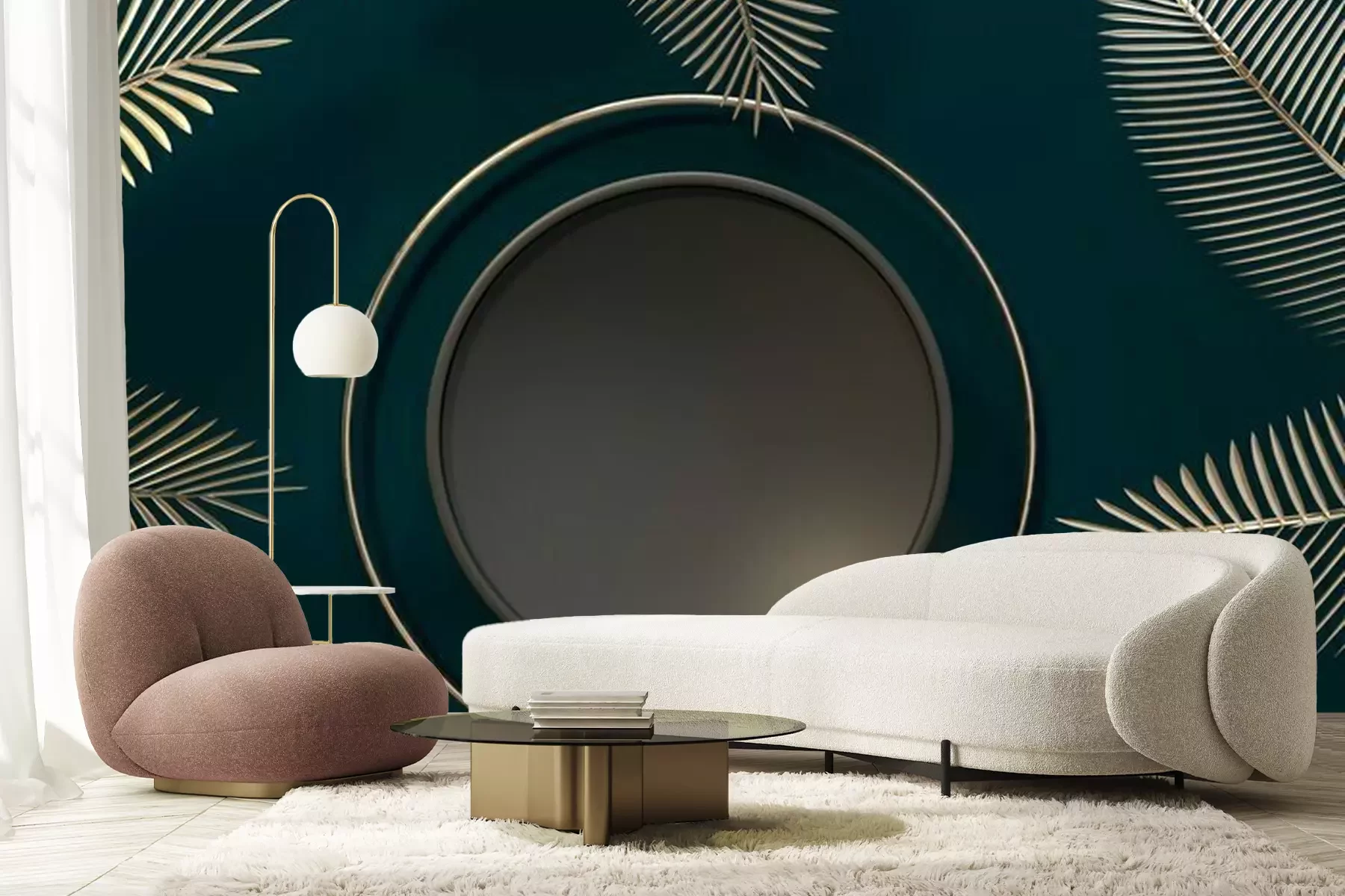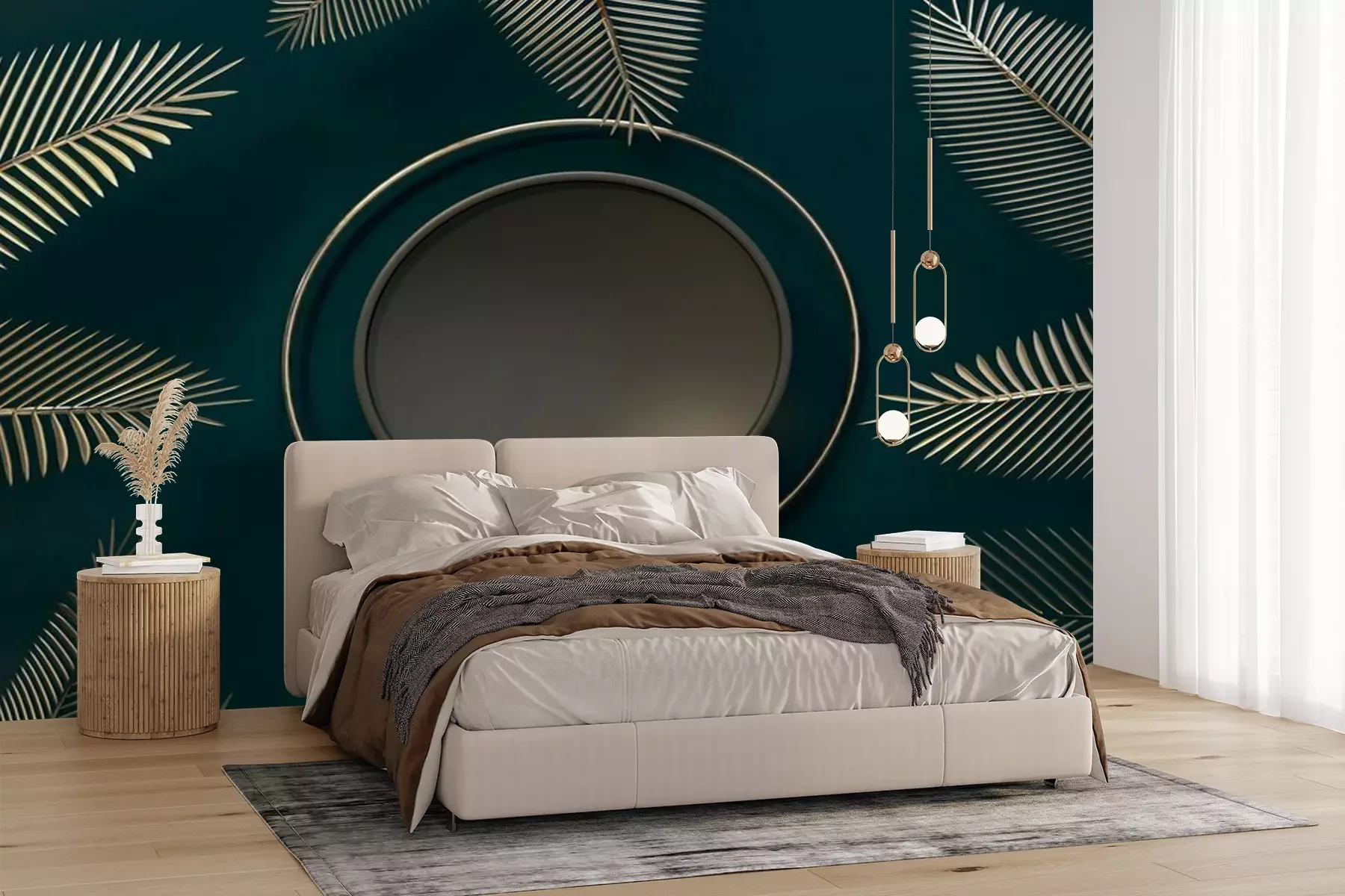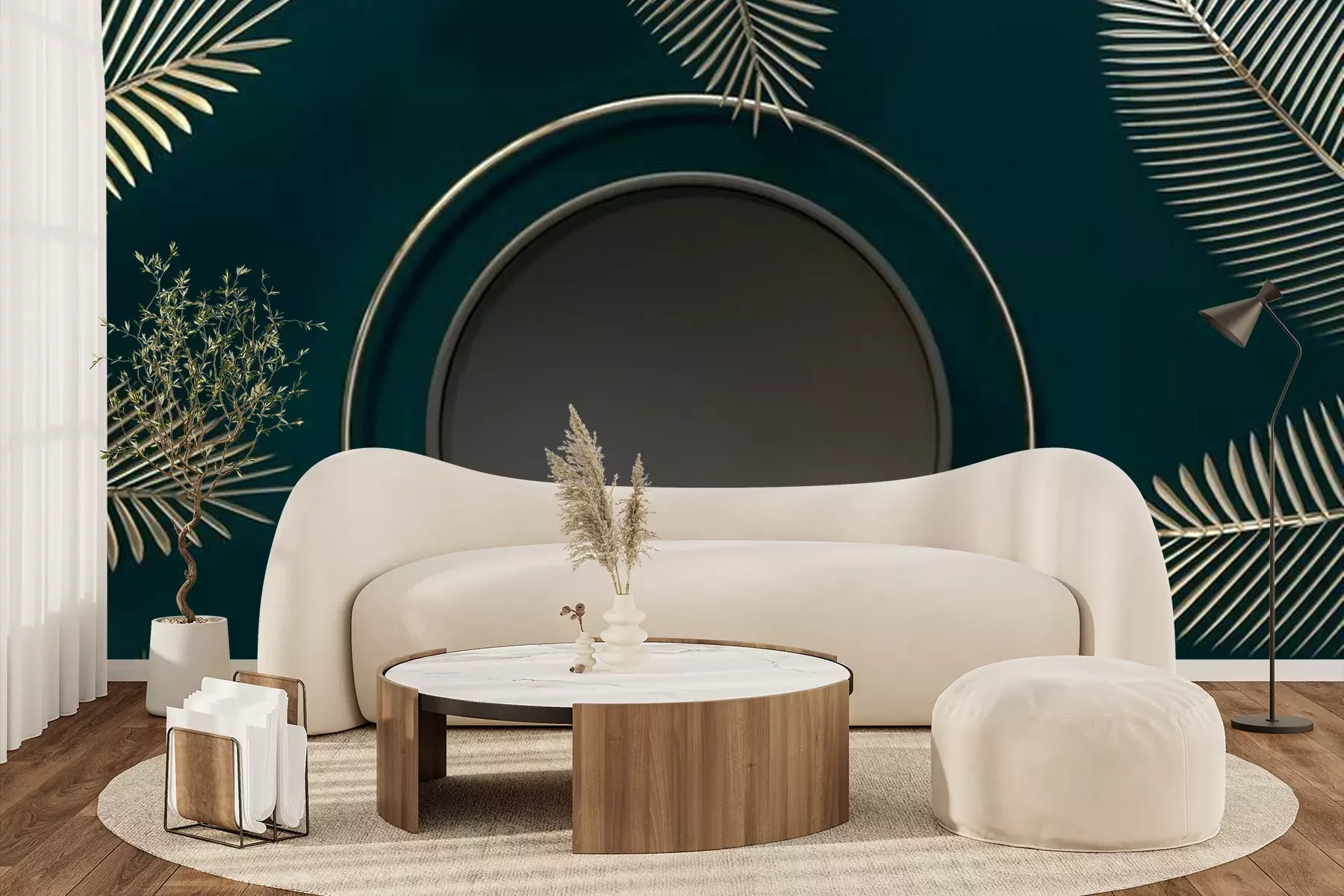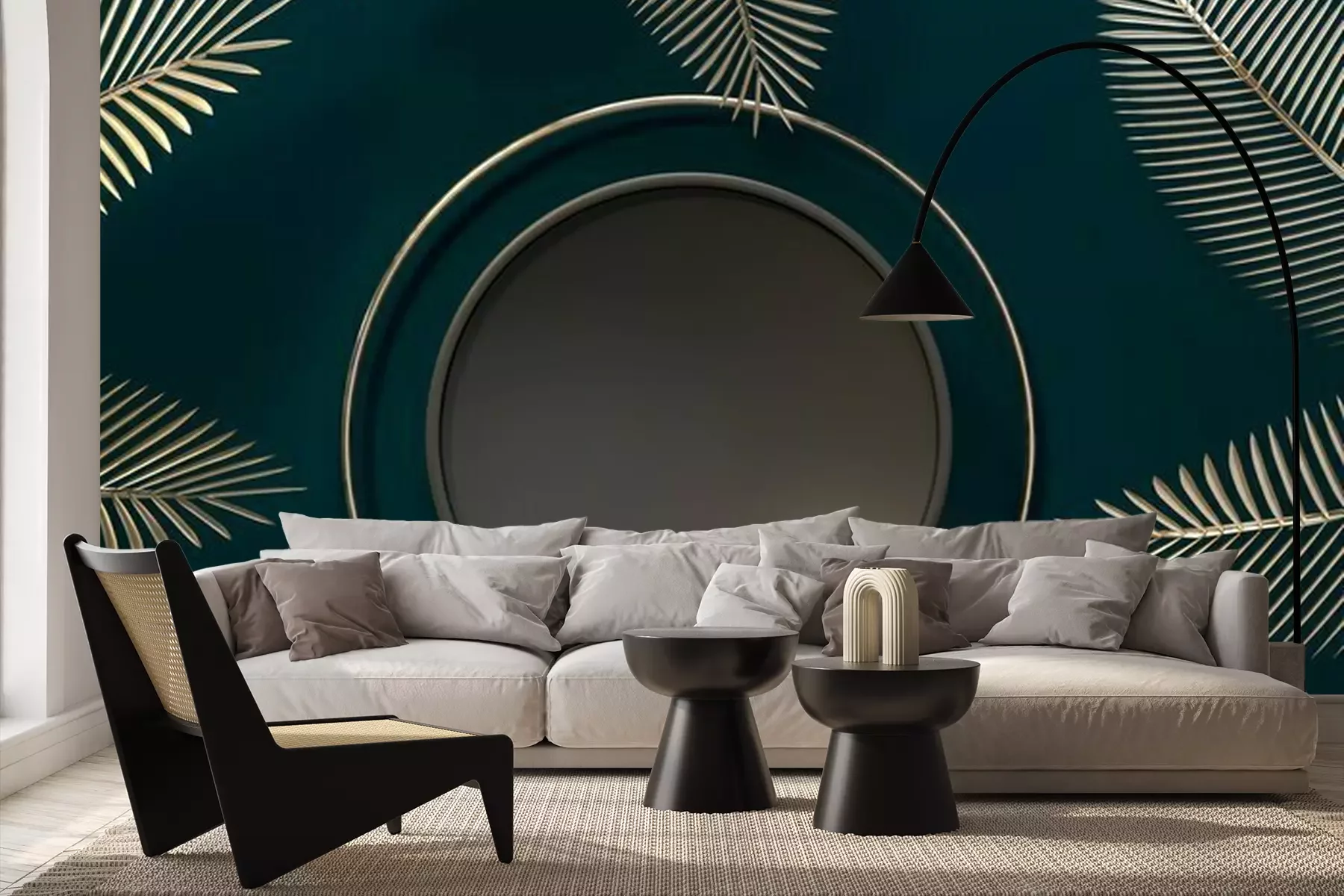 Papier peint  Palm trees leaves. Topical juicy paper cut creative. 3d render illustration. Blank space for brand promotion product. Creative dark background for advertising presentation. Empty base mockup