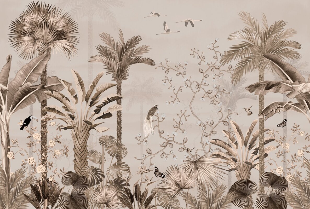 Papier peint : Palmiers et oiseaux dans la composition tropicale de la jungle