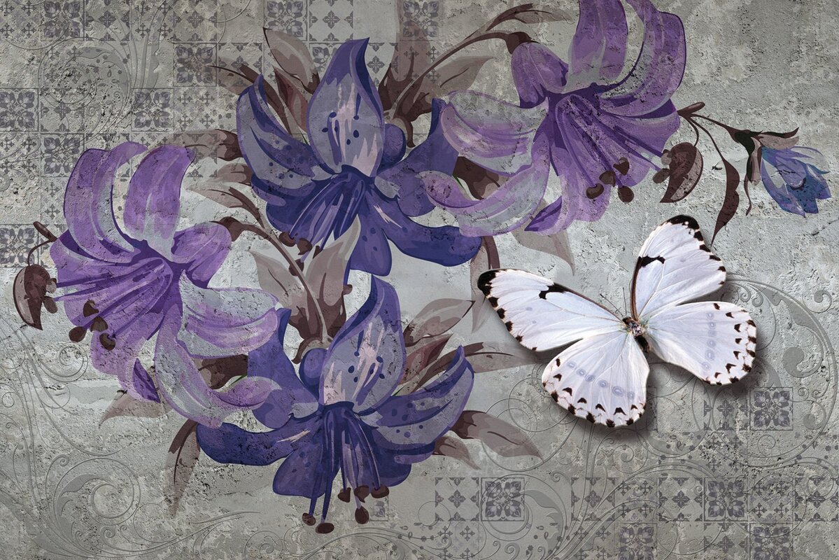 Papier peint : Papillon et fleurs dans le style des aquarelles en arrière-plan avec la mosaïque et les ornements