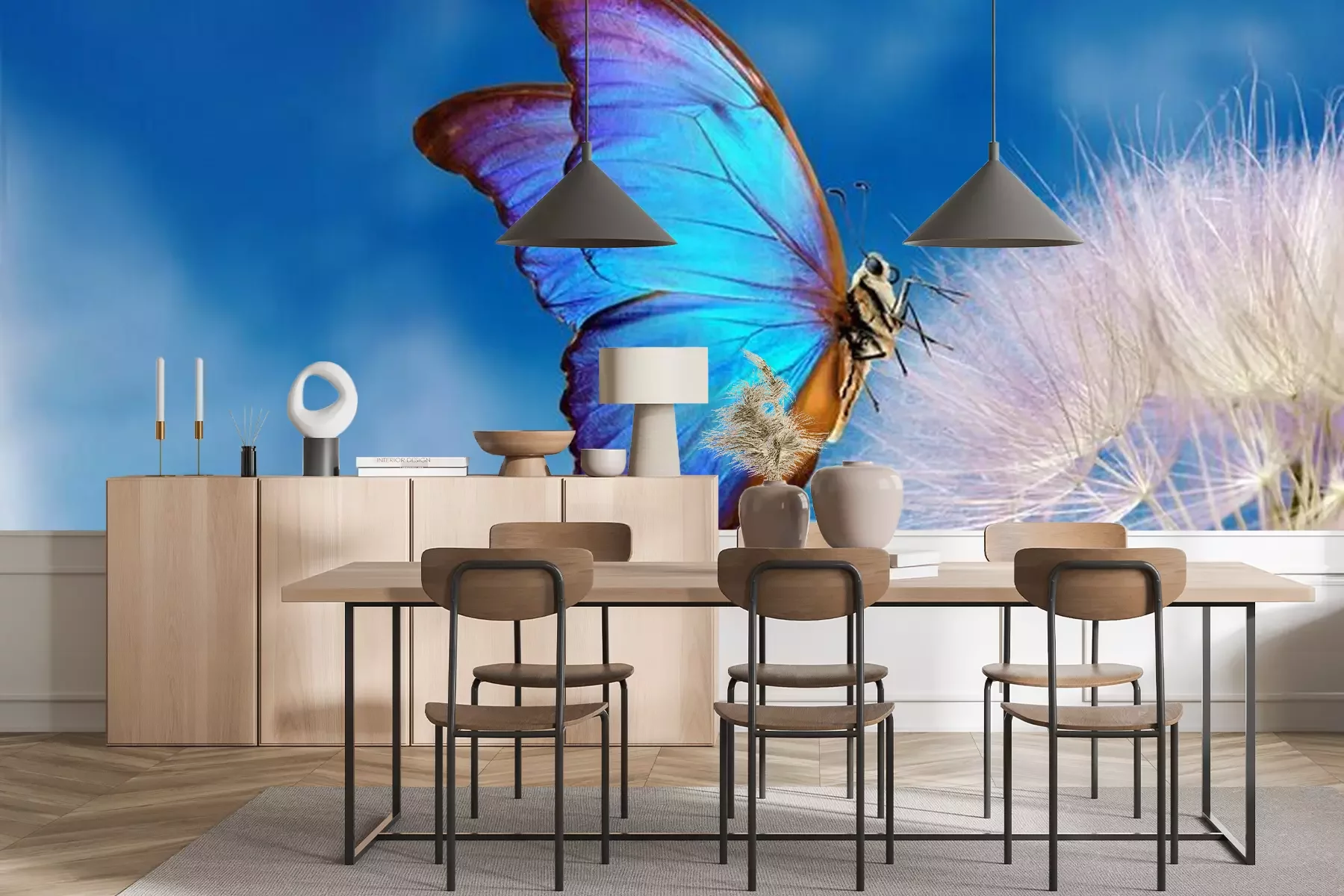 Papier peint  Papillon Morpho bleu sur un pissenlit